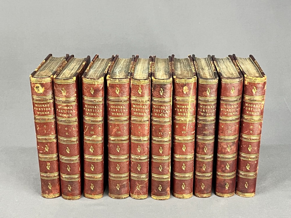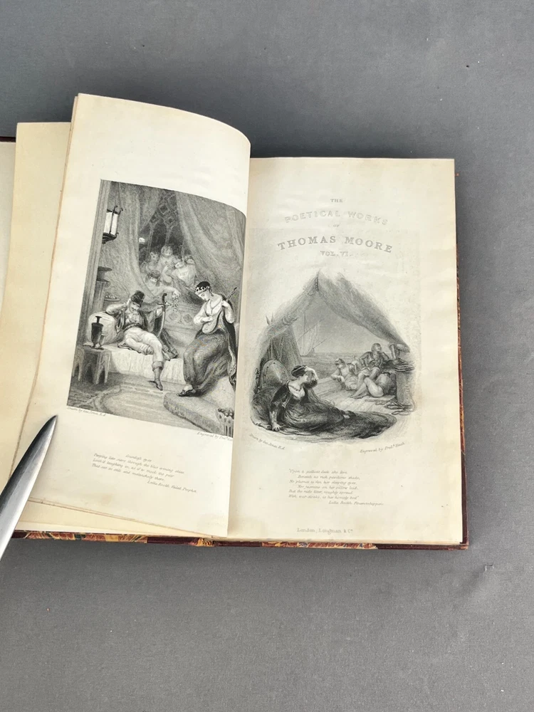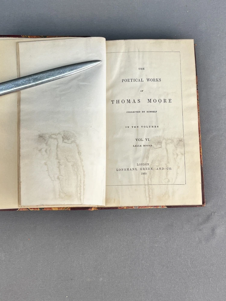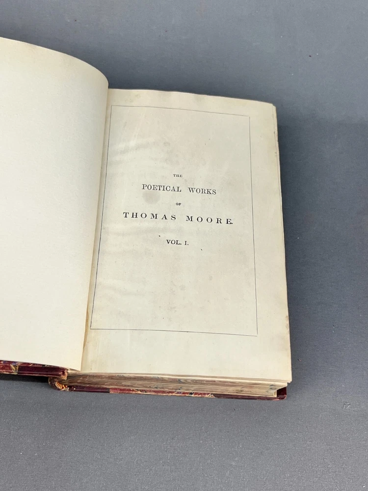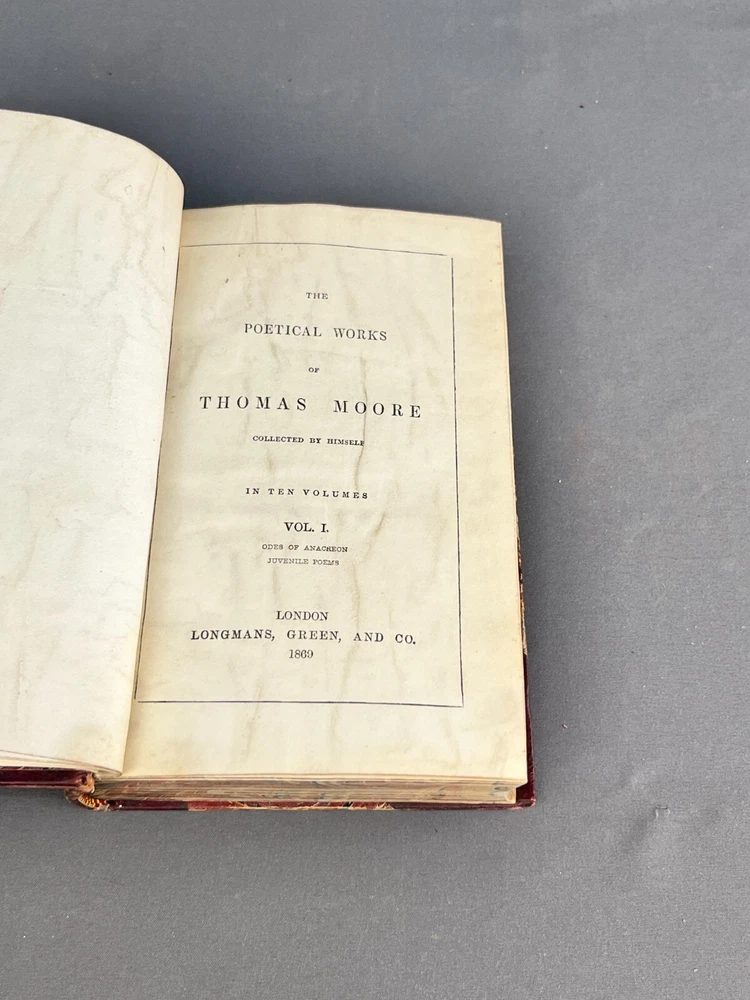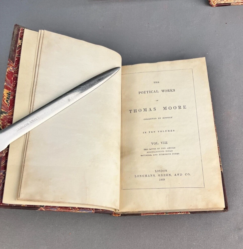 Fabulous, a complete10 Volume Set of The Poetical Works of Thomas Moore, circa 1869. Leather bindings, they books measure 6 3/4" X 4 3/8" X 1" thick. Each book has a name plate in the interior, as pictured. 2 Illustrated pages in the first few pages of the book. Excellent condition overall with no breaks to the leather spines. Some minor spotting on a few pages here and there. The only real issue is that volume 5 has some wrinkling on 10-12 pages, but minor. A fine addition to any home or collection! Shipping is FREE in the Continental USA. Please email for an international shipping quote. All items come from a smoke free home. Items are usually shipped within 24 hours of receiving payment. Email us your questions and check out our fully stocked eBay Store! Please contact us if you have any questions at all. We are here to help you with your purchase decisions. Please view the total listing as there are more pictures at the bottom of the listing. Shipping Cost, if quoted in the listing, is an estimate and is based upon us using the least expensive way of shipping to you if your address is a street address in the Continental United States Only (48 States), all others (i.e., foreign country, Alaska, and Hawaii residents), please contact us prior to purchase for a shipping quote. Thank you