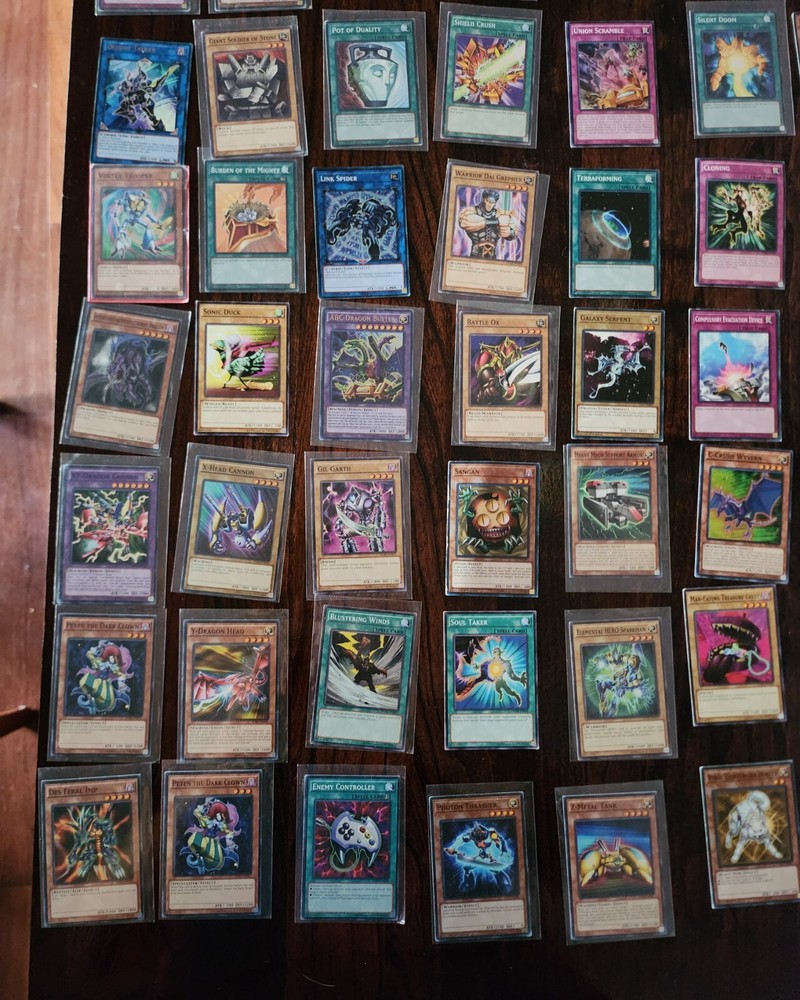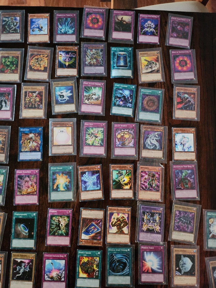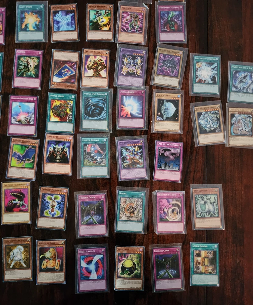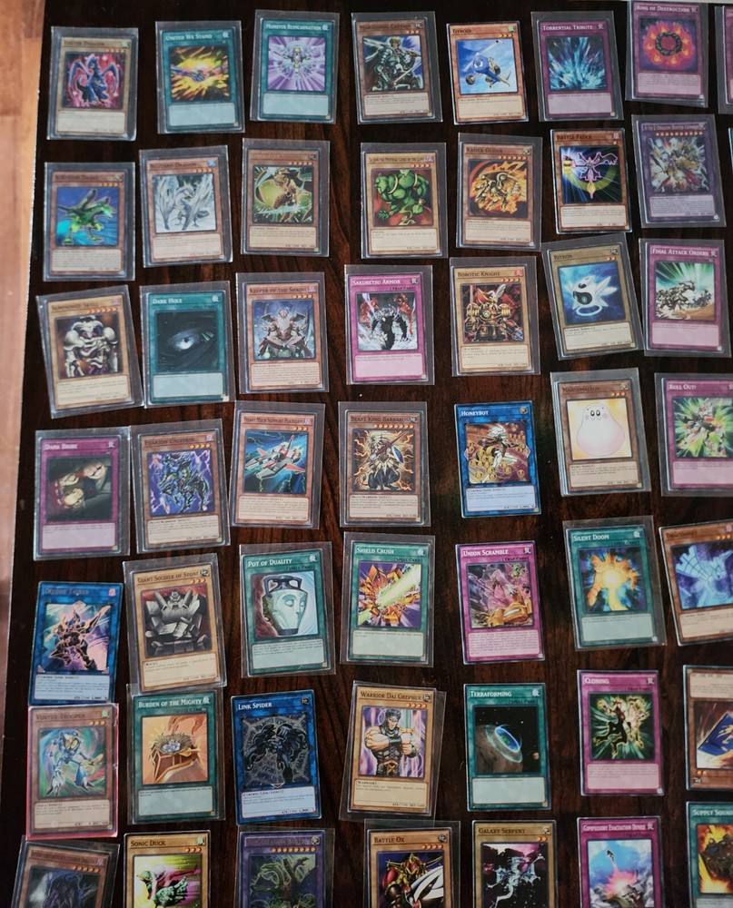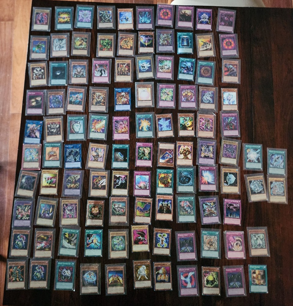 106 yu-gi-oh cards in slightly used condition, more than half have card sleeves. Two blue eyes white dragons with matching spell cards. With rare cards.