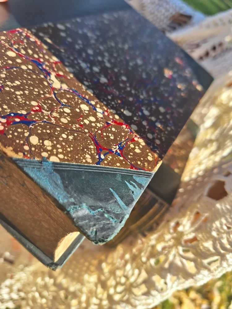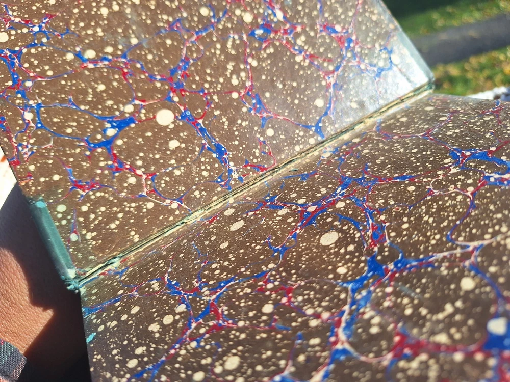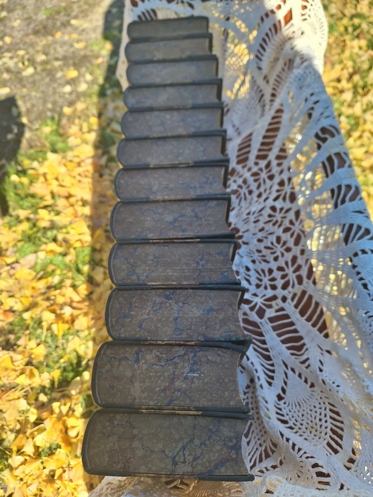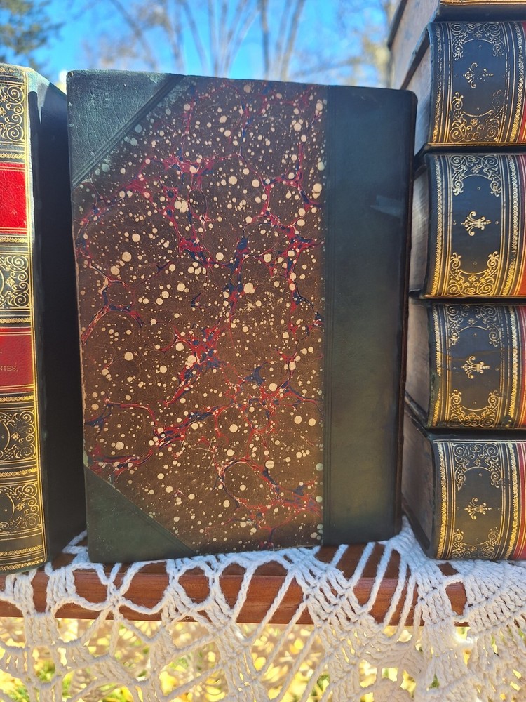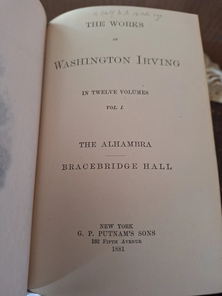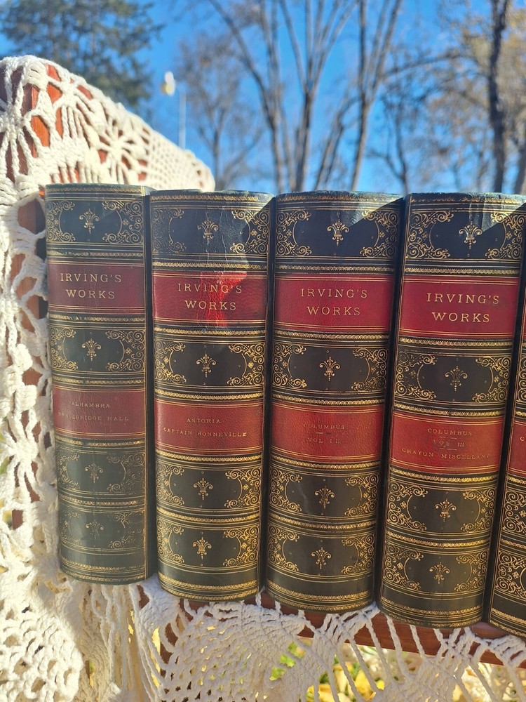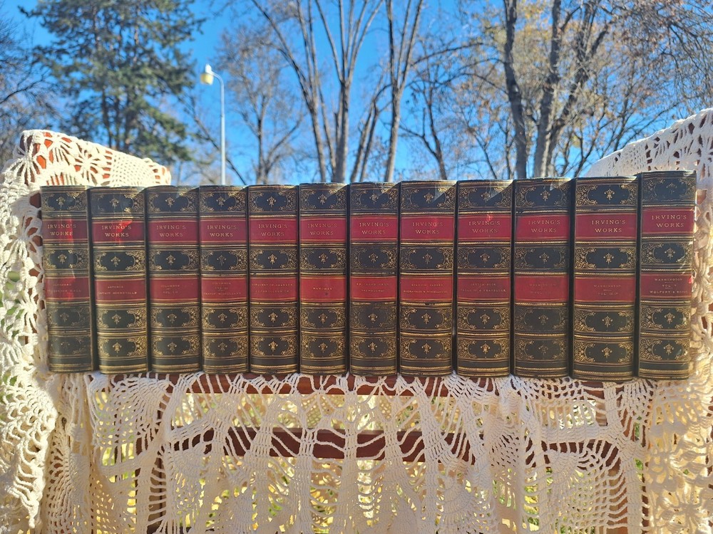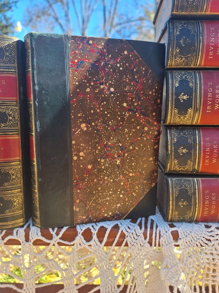 Complete set of the works of Washington Irving in 12 volumes. G.P. Putman & Sons New York 1881. Deep green quarter bound calf skin with bound corners. Five gold gilt raised bands with 6 compartments with gilt decorations, decorated edging. Gilt title stamps on spine. A rich brown ,red, blue, and ivory abstract cover, abstract end papers . Tight binding , solid boards. Some shelf ware with scuffing on spines, Some scuffed calf skin. Rubbing on broads. Some light fraying. Over all a great 12 vol set of Washington Irving exquisitely decorated a real heirloom set of books. Thank you ed