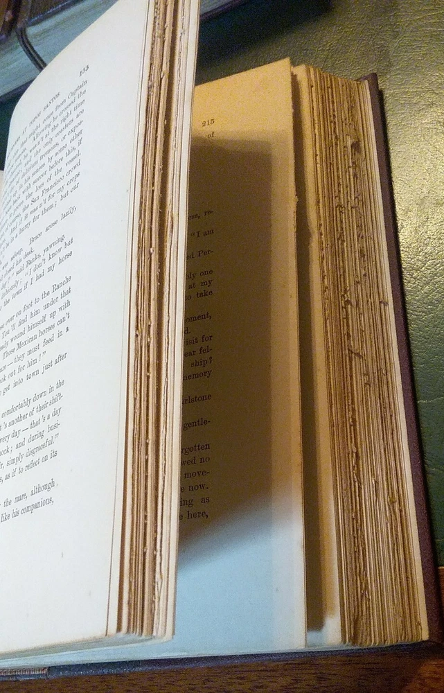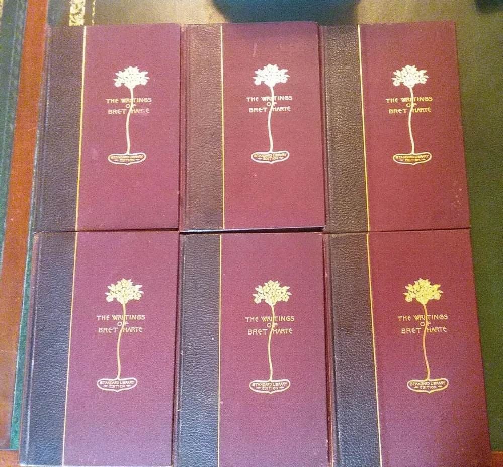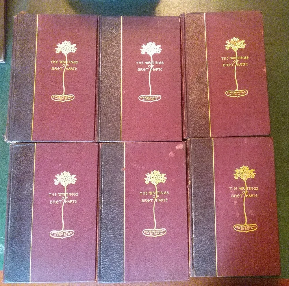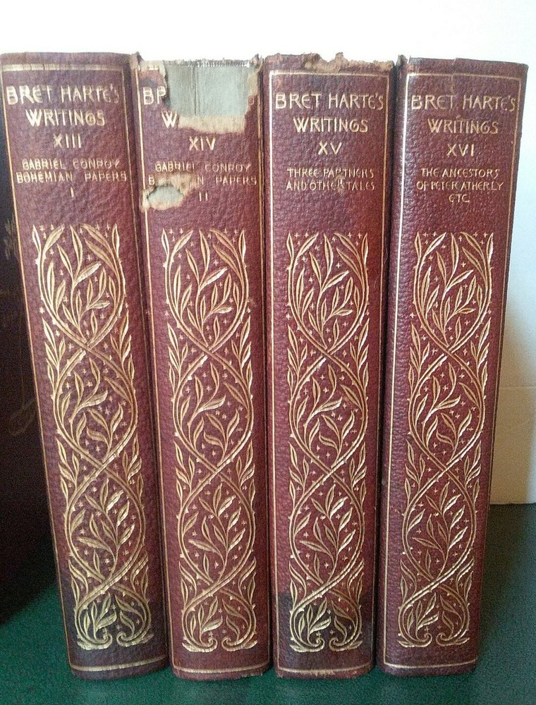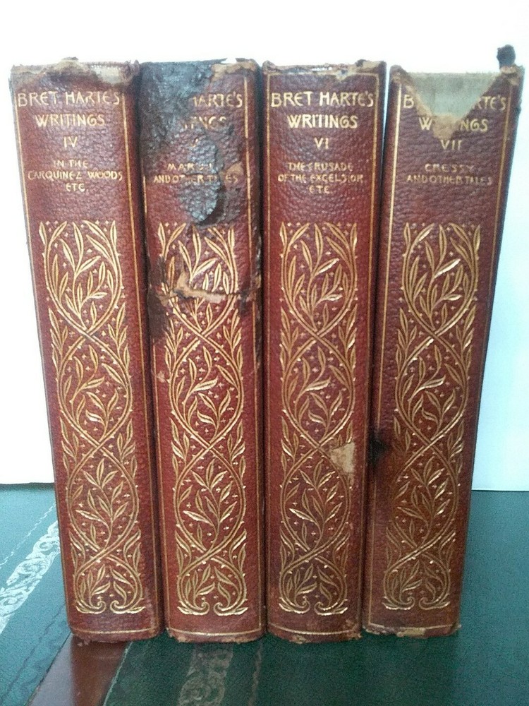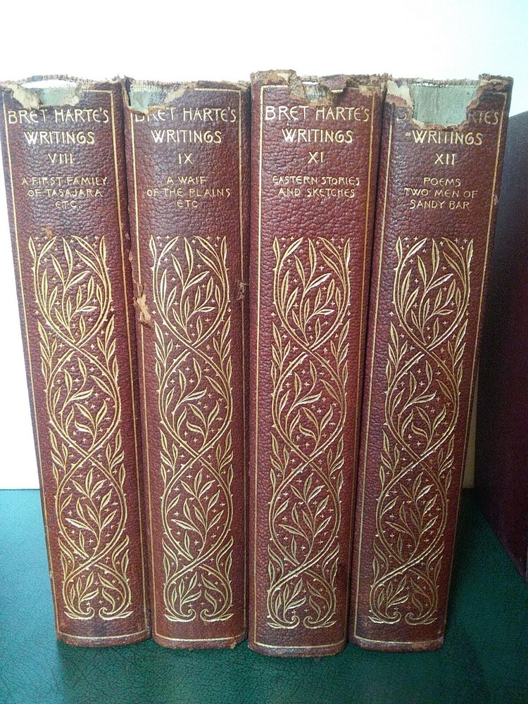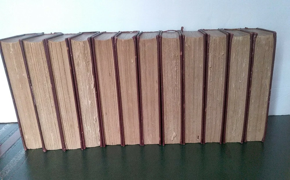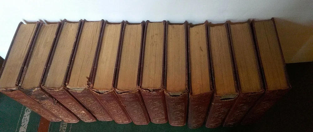 This attractive twelve volume lot will make a decorative addition to your library. Printed in 1896, the binding and a portion of the front and back are leather and the spine and front have eye catching gilt trim. No odors, water stains or mold that I detected, some minor spotting and dog ear folds inside. Some loss of leather on the binding and may flake off as handled. Several bindings are missing a few small sections, the spines seem good for their age. Scattered pictures throughout, about 2 each volume. Unusual rough trimmed edge on the long side. Please see all photos to judge condition for yourself and ask if you have any questions or need additional pictures. As a group the books measure 18" in length. Individually a book is 8.25" tall and 5.5" wide.