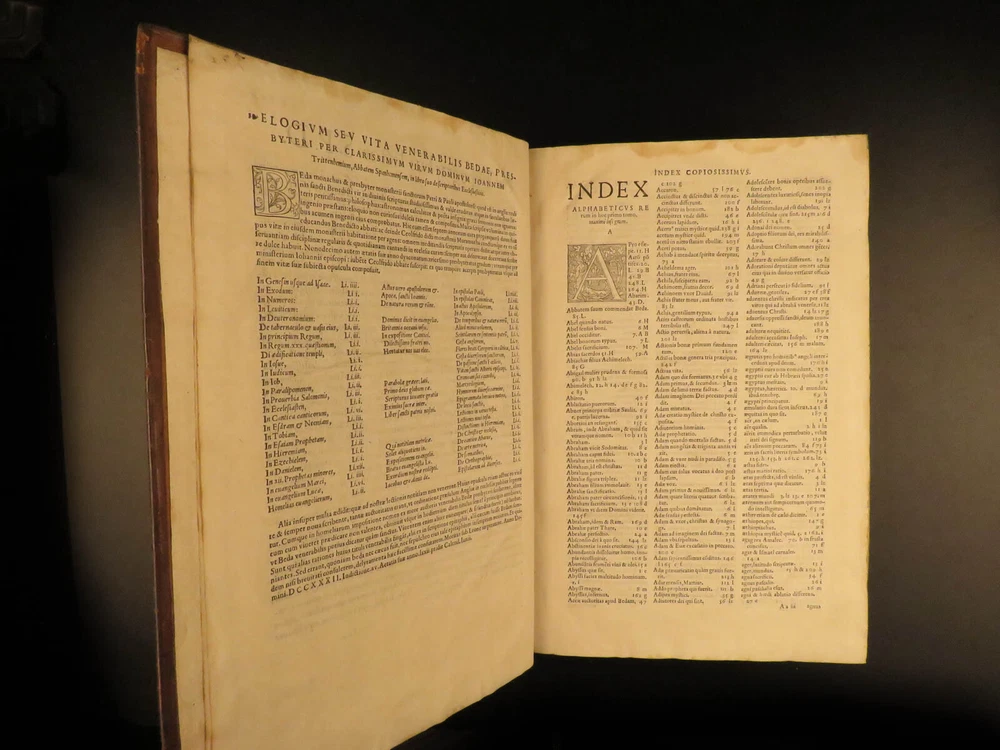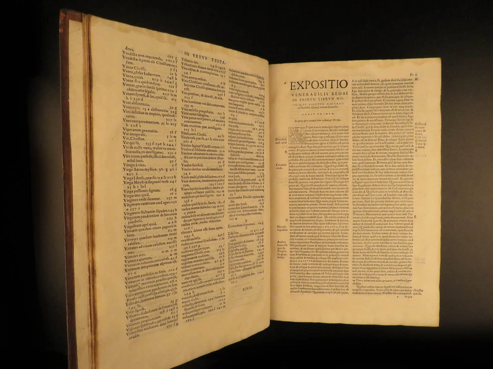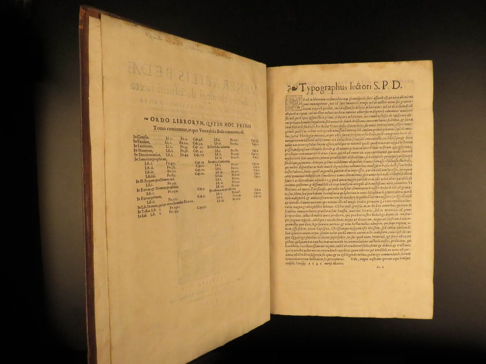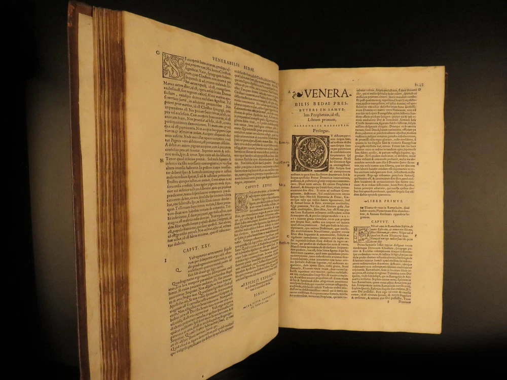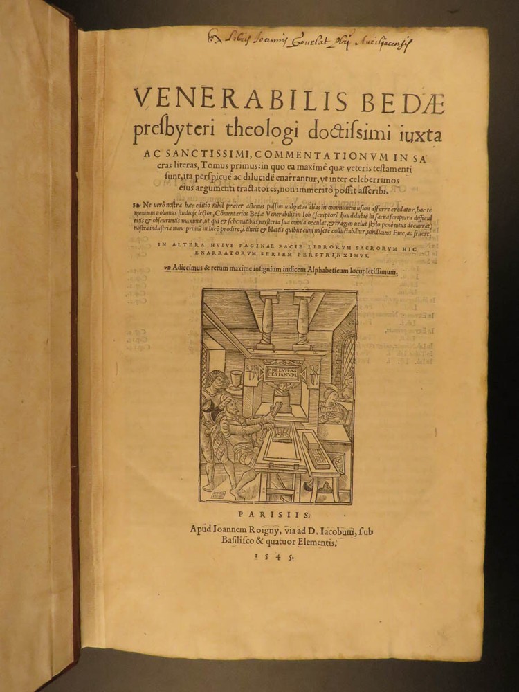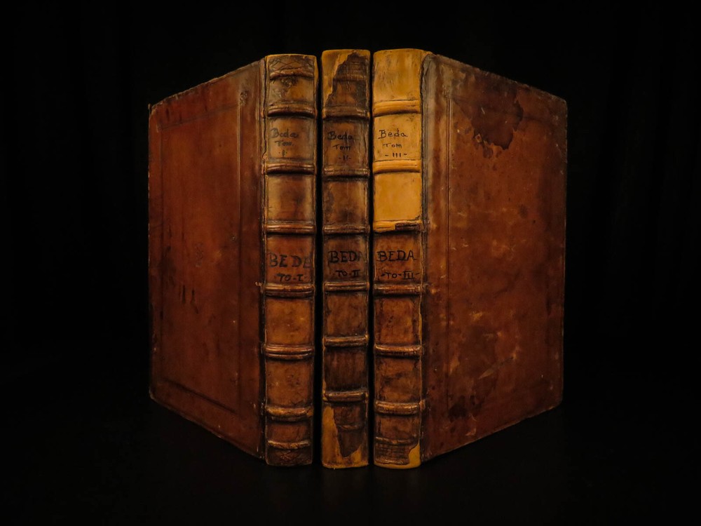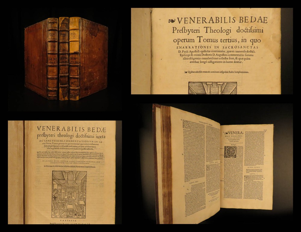1545 Saint Venerable BEDE Bible & Commentary English Monk Church Cosmology Saint Venerable Bede was an English monk during the 7 th - and 8 th -centuries. He is most remembered for his ecclesiastical work on the history of English people, in which he discusses the establishment and growth of the church throughout the known world. He also wrote important commentaries on the books of the Bible. This work explains relevant Biblical passages, as well as describes the allegorical notes of Church Fathers. However, he did not write exclusively of church theology. He also wrote on the development of time and ideas of cosmology. This 16 th -century Latin edition was published in Paris by Roigny. An impressive, three-volume folio set! Item number: #11735 Price: $3500 BEDE, Saint Venerable Venerabilis Bedae presbyteri theologi doctissimi juxta ac sanctissimi, commentationum in Sacras Literas, tomus primus : in quo ea maximè quae Veteris Testamenti sunt, ita perspicuè ac dilucidè enarrantur, ut inter celeberrimos ejus argumenti tractatores… Parisiis : Apud Joannem Roigny, 1545/44. 1 st editions Details : · Collation: Complete with all pages; 3 volumes o Vol I – [16], 272 o Vol II – [16], 264 o Vol III – [12], 260 · References: USTC 149316 · Language: Latin · Binding: Leather; tight & secure · Size : ~13in X 9in (33.5cm x 23cm) · Exceedingly rare and desirable set Our Guarantee: Very Fast. Very Safe. Free Shipping Worldwide. Customer satisfaction is our priority! Notify us with 7 days of receiving, and we will offer a full refund without reservation! 11735