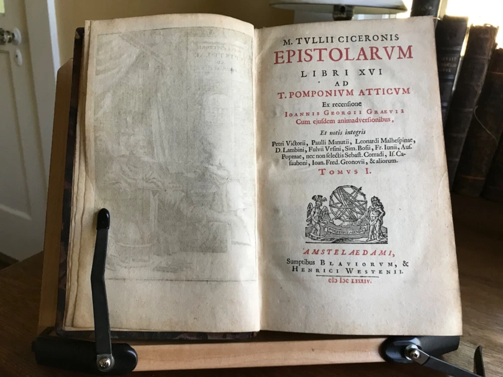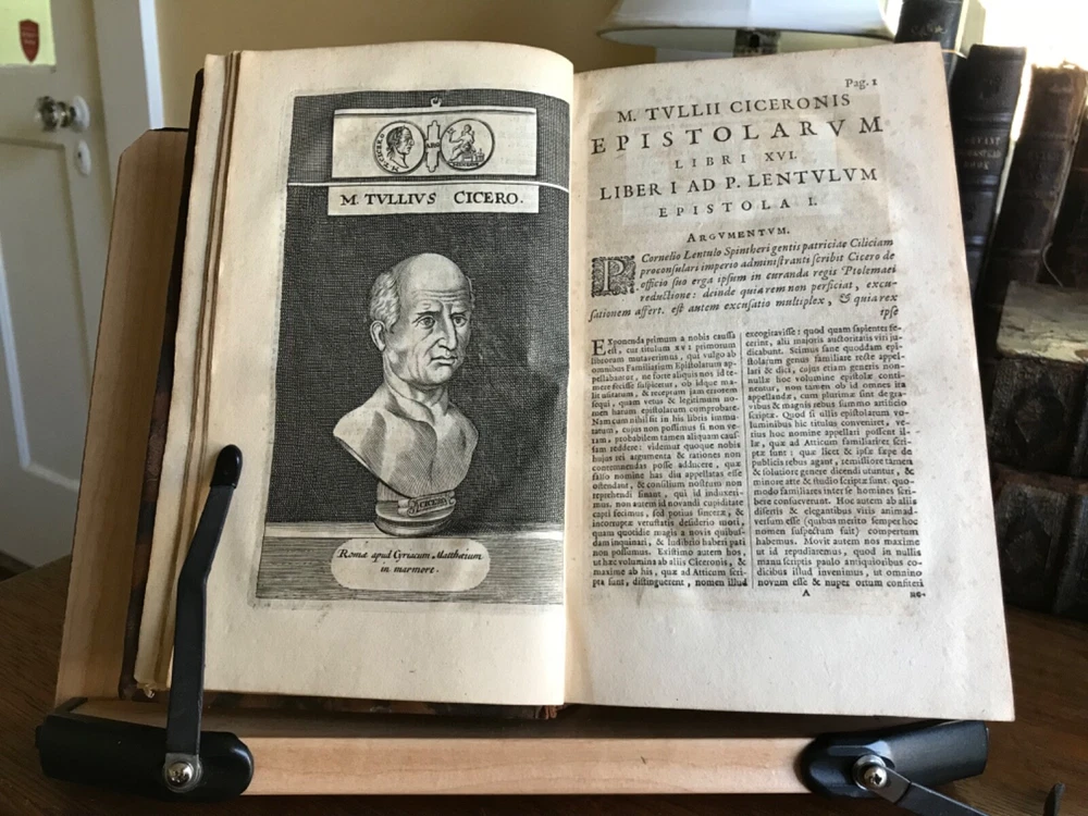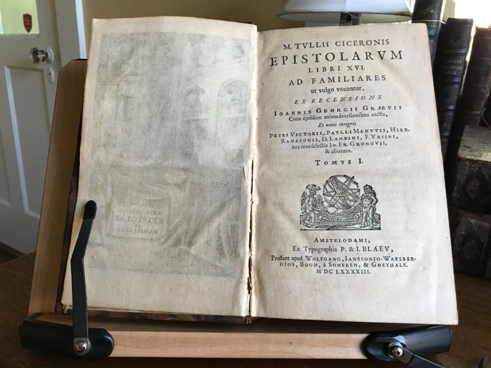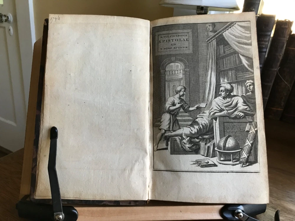 M. Tullii Ciceronis Epistolarum Libri XVI. A.D. Familiares it vulgo vocantur, Ex Recensione Ioannis Georgii Graevii Cum ejusduem animadversionibus auctis, Et Notis Integris Petrii Victorii, Pavalli Manutii Hier. Ragazonii, D. Lambini, F. Ursini, nec non selectis Io. Fr. Gronovii, & aliorum, Ex Typographia P. & I. Blaev, Prostant apud Wolfang, Ianssonio-Waesbergios, Boom, a Someren, & Goethals. 1693, four illustrated titles, one engraving of Cicero, full original marbled leather bindings, 8.25 x 5”, varying thicknesses, 8vo. In good condition. A beautiful set that presents attractively. Characteristic late 17th century bindings of marbled leather and marbled edges. Lovely spines with gilt compartments and original spine labels. Intricate tooling at spine. Spines are desiccated and somewhat chipped at heads and tails. Boards are lightly scuffed with minor wear to extremities. Minor rounding of corners. A few joints are tender, particularly volume one. Gutters are tender as well with light cracking. Handsome bookplates of John Chipman Gray on pastedowns. Interiors are remarkably well preserved. Minor toning and foxing throughout. Quite bright considering these volumes are 330 years old. Bindings tight and intact. Occasional old hand marginalia in quill on a few leaves. Free of modern markings. A very sound and unspoiled set. Please see photos. Important classics work of Johann Georg Graevius (1632-1703). Graevius was a German scholar and critic. Graevius “enjoyed a very high reputation as a teacher, and his lecture-room was crowded with pupils, many of them of distinguished rank, from all parts of the world. He was visited by Lorenzo Magalotti and honored with special recognition by Louis XIV, and was a particular favorite of William III of England, who made him historiographer royal.” This work of Cicero is considered one of his best works. Provenance of John Chipman Gray (1839-1915) who was an American scholar of property law and professors at Harvard Law School. He founded the law firm Ropes & Gray, with law partner John Codman Ropes. He was half-brother to U.S. Supreme Court associate justice Horace Gray, and a grandson of merchant and politician William Gray. He was an abolitionist and “argued that the defeat of slavery was imperative for the survival of a nation.” RAREE1693JRSX
