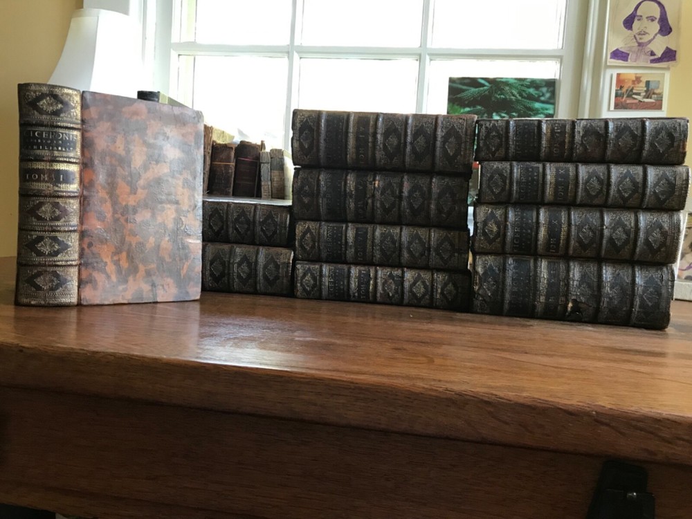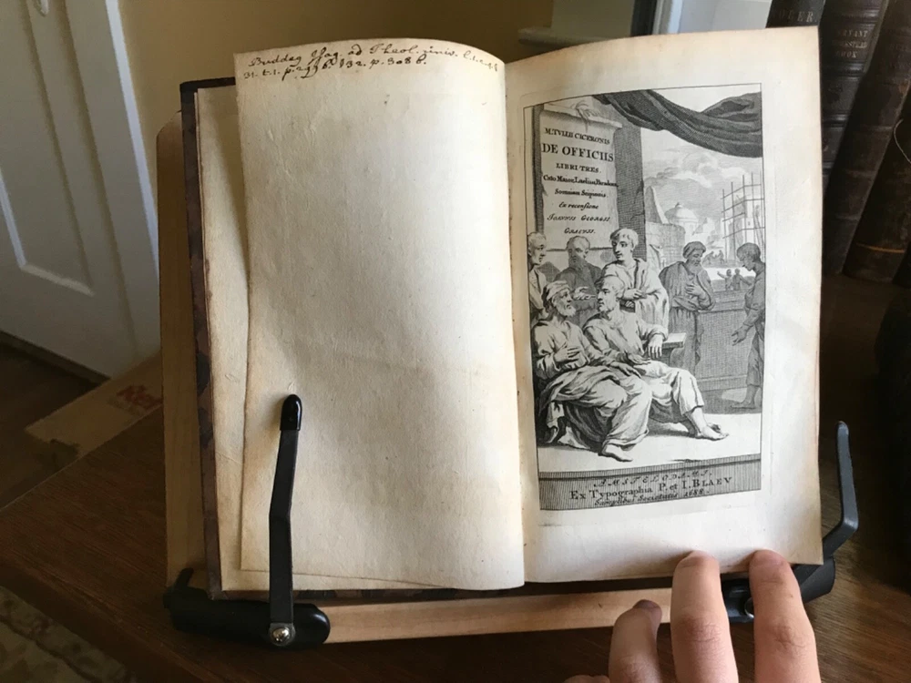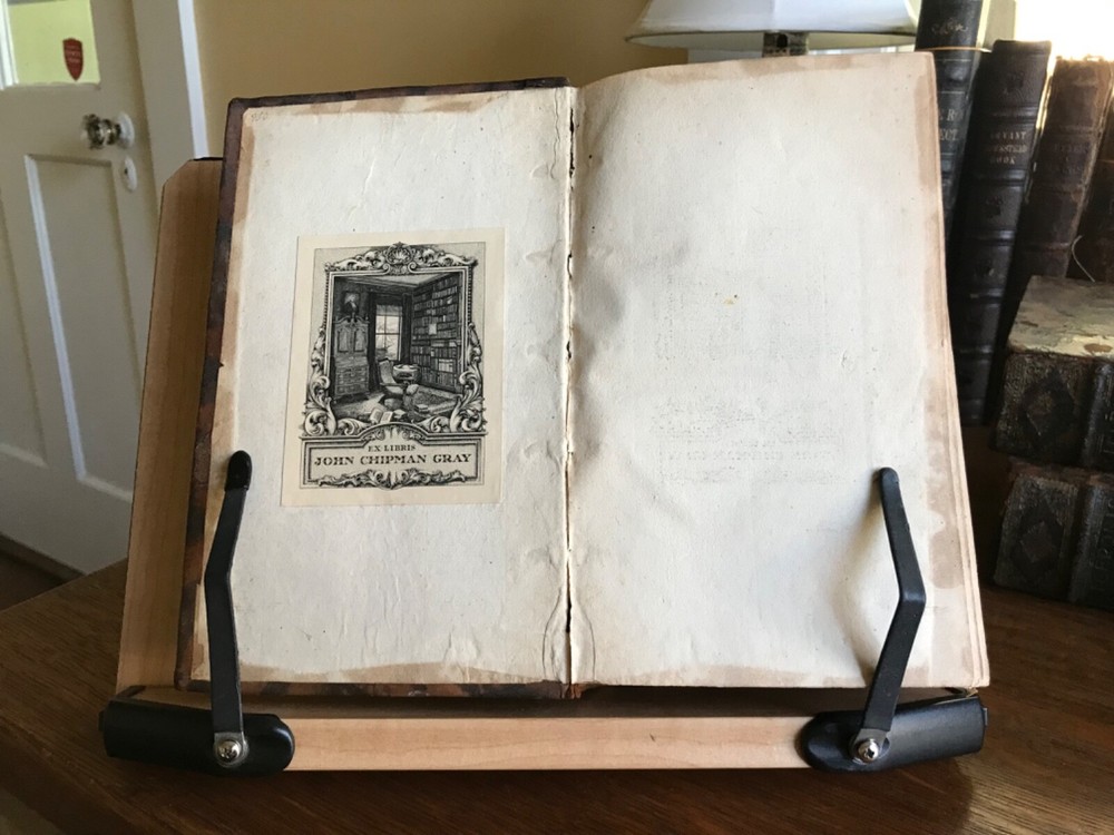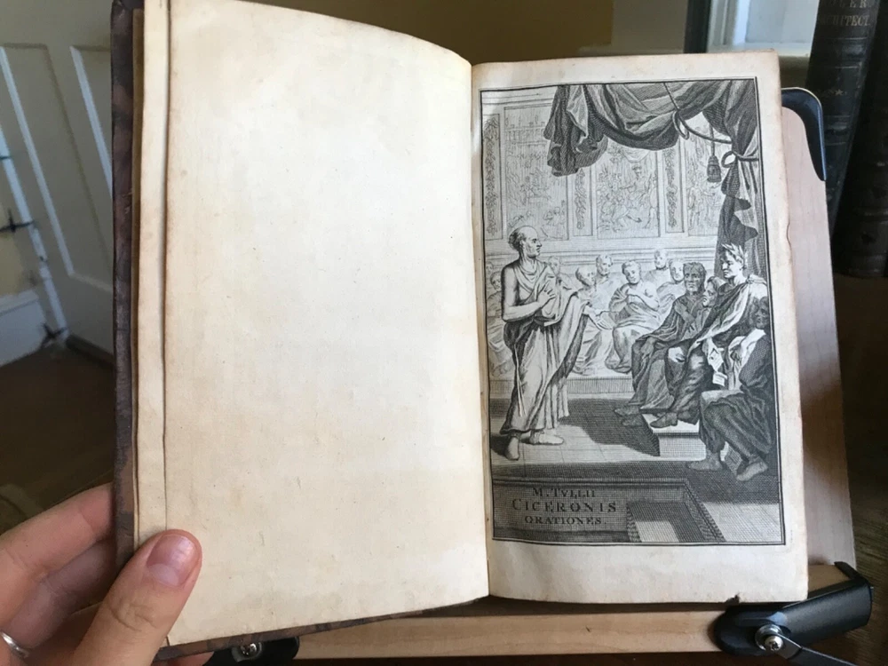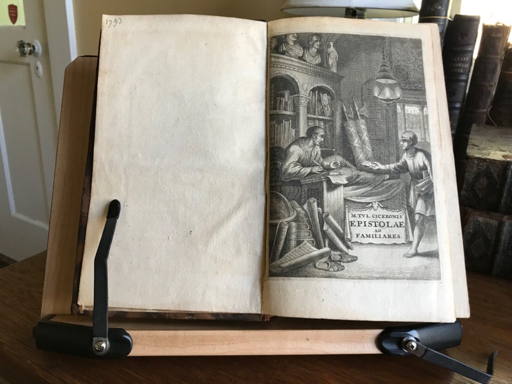 M. Tullii Ciceronis Epistolarum Libri XVI. A.D. Familiares it vulgo vocantur, Ex Recensione Ioannis Georgii Graevii Cum ejusduem animadversionibus auctis, Et Notis Integris Petrii Victorii, Pavalli Manutii Hier. Ragazonii, D. Lambini, F. Ursini, nec non selectis Io. Fr. Gronovii, & aliorum, Ex Typographia P. & I. Blaev, Prostant apud Wolfang, Ianssonio-Waesbergios, Boom, a Someren, & Goethals. 1693, four illustrated titles, one engraving of Cicero, full original marbled leather bindings, 8.25 x 5”, varying thicknesses, 8vo. In good condition. A beautiful set that presents attractively. Characteristic late 17th century bindings of marbled leather and marbled edges. Lovely spines with gilt compartments and original spine labels. Intricate tooling at spine. Spines are desiccated and somewhat chipped at heads and tails. Boards are lightly scuffed with minor wear to extremities. Minor rounding of corners. A few joints are tender, particularly volume one. Gutters are tender as well with light cracking. Handsome bookplates of John Chipman Gray on pastedowns. Interiors are remarkably well preserved. Minor toning and foxing throughout. Quite bright considering these volumes are 330 years old. Bindings tight and intact. Occasional old hand marginalia in quill on a few leaves. Free of modern markings. A very sound and unspoiled set. Please see photos. Important classics work of Johann Georg Graevius (1632-1703). Graevius was a German scholar and critic. Graevius “enjoyed a very high reputation as a teacher, and his lecture-room was crowded with pupils, many of them of distinguished rank, from all parts of the world. He was visited by Lorenzo Magalotti and honored with special recognition by Louis XIV, and was a particular favorite of William III of England, who made him historiographer royal.” This work of Cicero is considered one of his best works. Provenance of John Chipman Gray (1839-1915) who was an American scholar of property law and professors at Harvard Law School. He founded the law firm Ropes & Gray, with law partner John Codman Ropes. He was half-brother to U.S. Supreme Court associate justice Horace Gray, and a grandson of merchant and politician William Gray. He was an abolitionist and “argued that the defeat of slavery was imperative for the survival of a nation.” RAREE1693JRSX