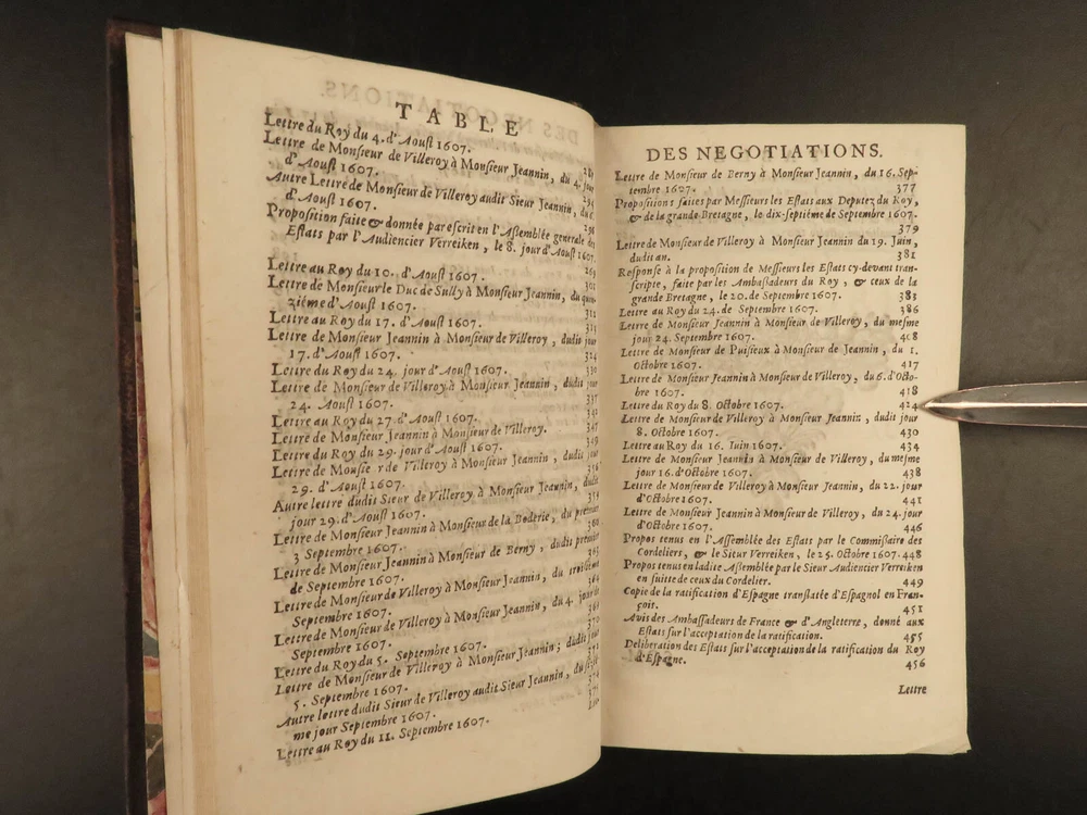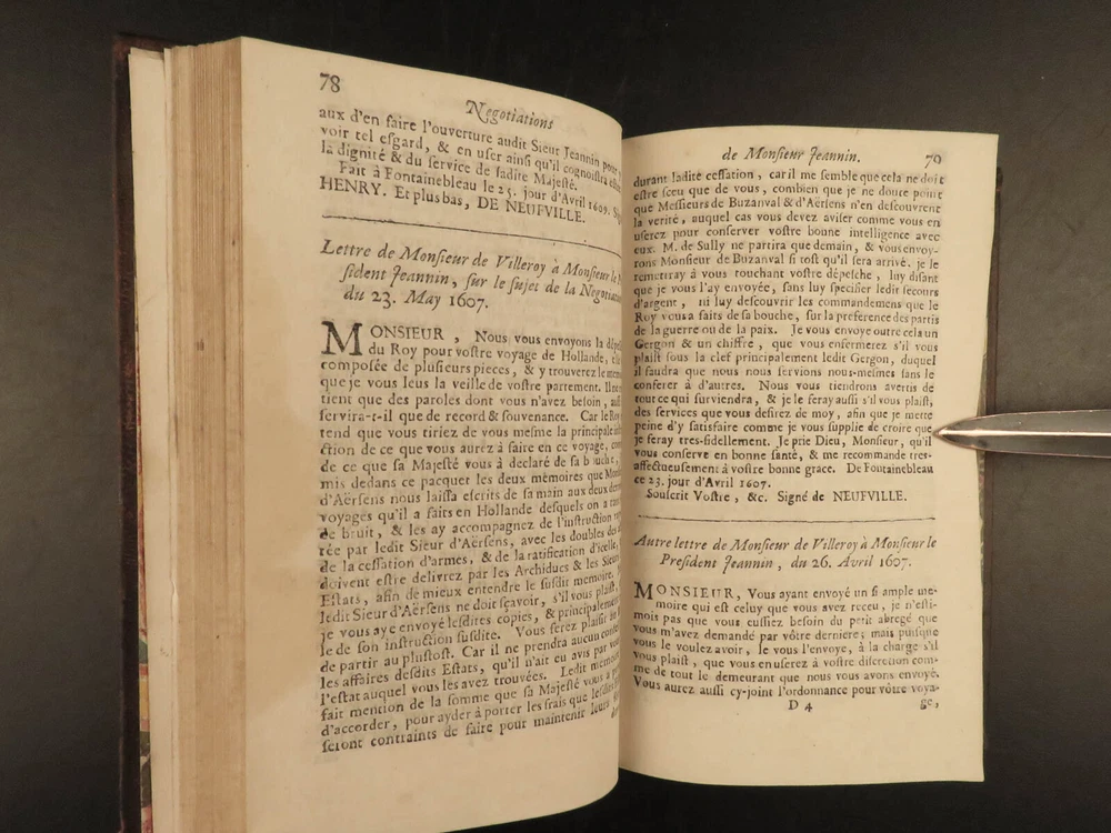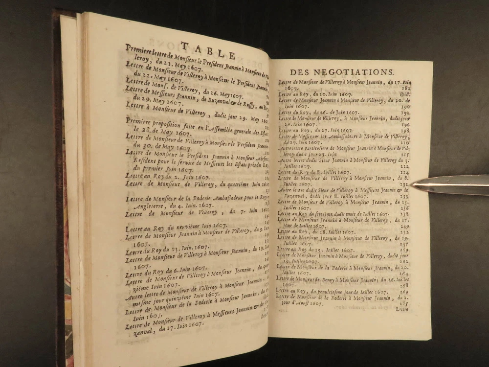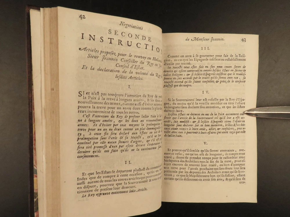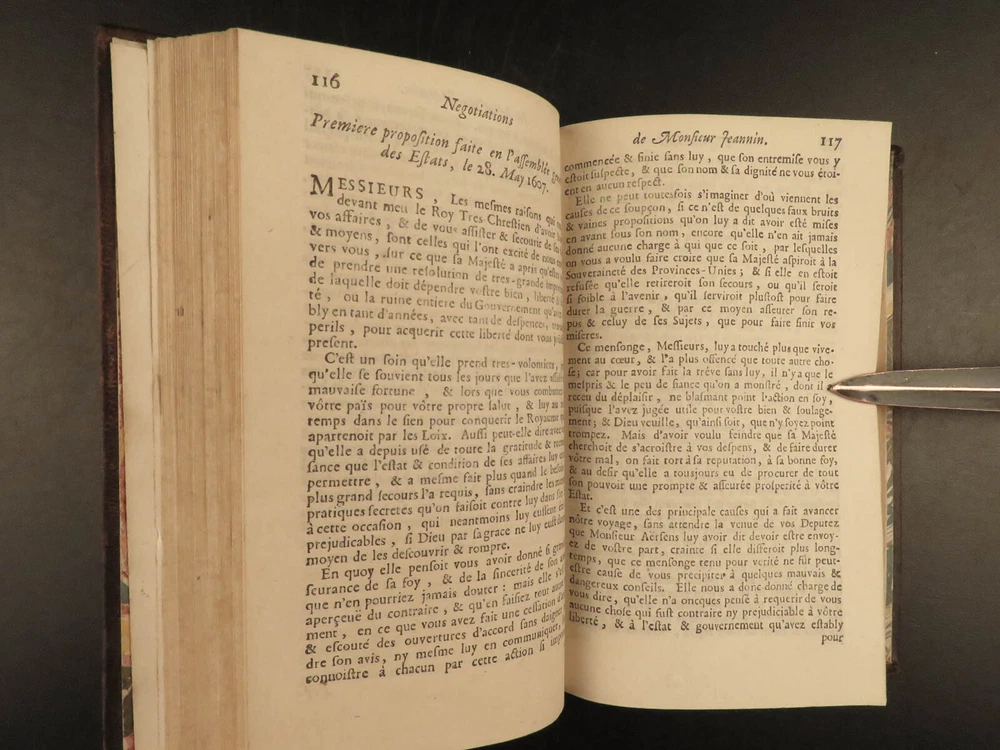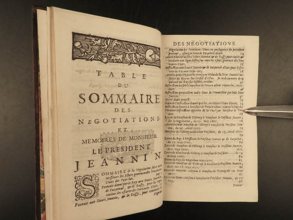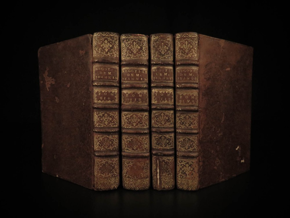 1695 1 ed Negotiations of Pierre Jeannin Louis XIII France Marie de Medici 4v SET Pierre Jeannin was a 16 th -century French politician and financier who is best known for taking part in the negotiations of the Treaty of Lyon and the alliance between France and the Netherlands as well as the Edict of Nantes. He built himself a reputation mediating negotiations which led him to his most important negotiation establishing peace between King Louis XIII and Marie de’ Medici. This book is a fine printing of Jeannin’s ‘ Negotiations’ was published in Amsterdam in 1695. Item number: #19182 Price: $750 JEANNIN, Pierre Les négotiations de Monsieur le president Jeannin. Amsterdam : Chez André de Hoogenhuysen, 1695. Details : · Collation: Complete with all pages; 4 volumes o Vol. I – [22], 468 o Vol. II – 537, [7] o Vol. III – 417, [7] o Vol. IV – 348, [4] · Provenance: Armorial Bookplate – Bibliothèque du Château des Ormes o Château des Ormes was the seat of Marc-Pierre de Voyer de Paulmy d'Argenson (1696–1764), Minister of War for Louis XV, and the d’Argenson family. This bookplate likely belonged to Marc-René de Voyer de Paulmy d'Argenson (1771–1842), a member of the French Chamber of Deputies. He was a prefect of Deux-Nèthes from 1809–1813. As a member of the Chamber of Deputies during the Hundred Days in 1815, he was a member of the French deputation to the allies to obtain the exclusion of the Bourbons. After the second restoration of Louis XVIII he was often elected as a member of the Chamber of Deputies and voted with the opposition. · Language: French · Binding: Leather; tight and secure · Size : ~6in X 3.75in (15.5cm x 10cm) Our Guarantee: Very Fast. Very Safe. Free Shipping Worldwide. Customer satisfaction is our priority! Notify us with 7 days of receiving, and we will offer a full refund without reservation! 19182