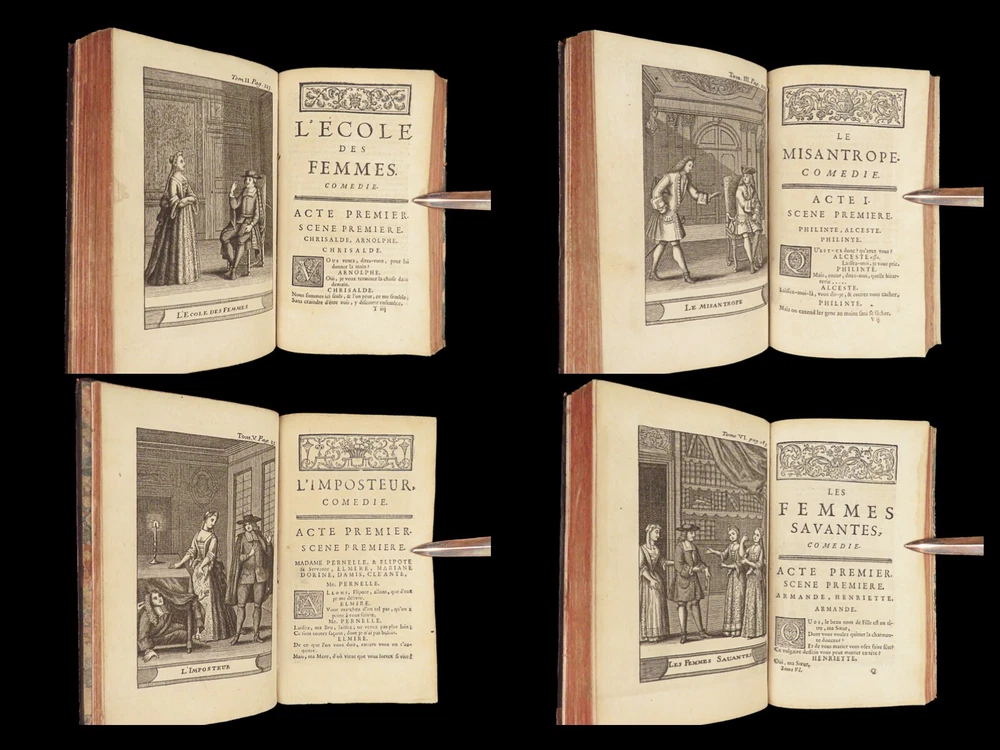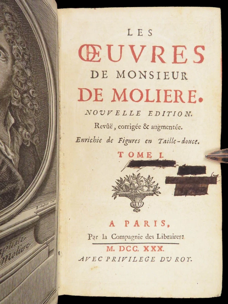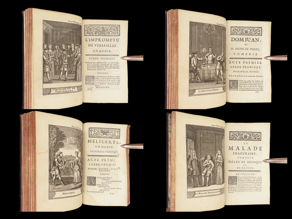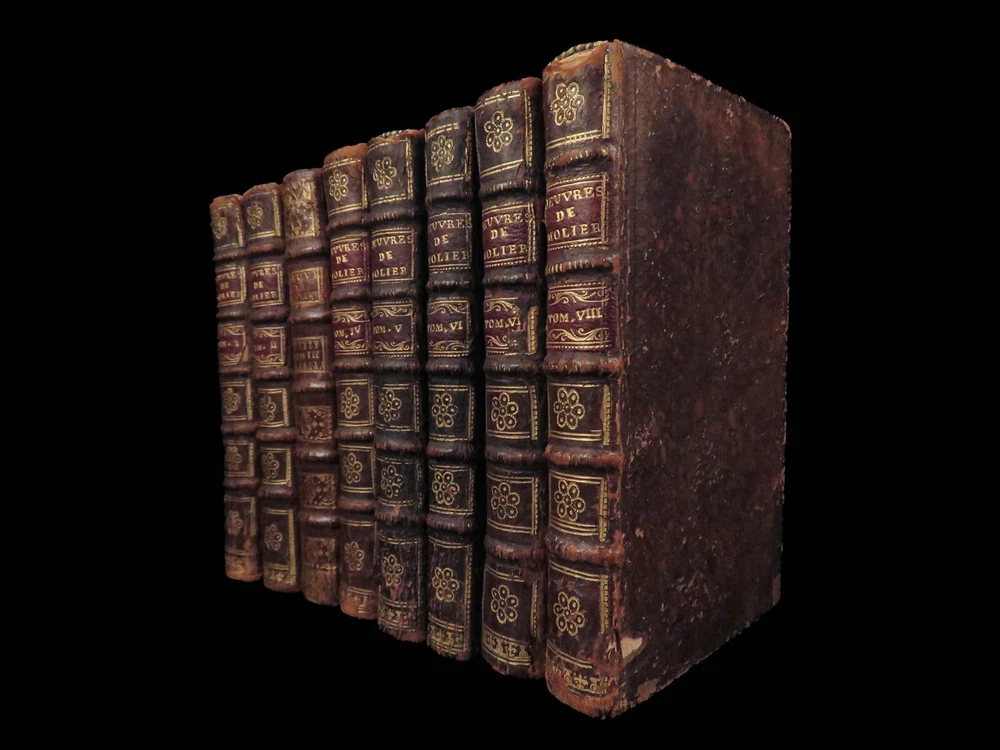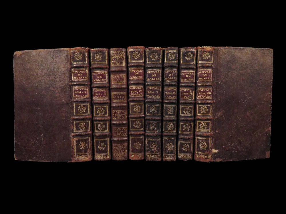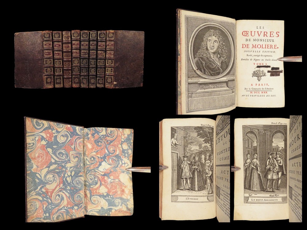 1730 Works of MOLIERE French Literature Misanthrope School for Wives 8v SET “It is not only what we do, but also what we do not do, for which we are accountable.” ― Molière A fine eight-volume set of the works of Moliere. This 1753 set was published in Paris and includes works such as ‘Tartuffe’, ‘School for Wives’, and ‘The Misanthrope’. This set is filled with 32 full-page engravings. Item number: #28551 Price: $750 MOLIERE Les Oeuvres de Molière. A Paris : Par la Compagnie des Libraires, 1730. Details : · Collation: Complete with all pages; 8 volumes o Vol. I. – Avertissement. Memoires sur la vie & les ouvrages de Moliere. L'etourdi. Le depit amoureux. Les precieuses ridicules. § 3 engraved plates o Vol. II – Sganarelle. Dom Garcie. L'école des maris. Les facheux. L'école des femmes. § 6 engraved plates o Vol. III – La critique de l'ecole des femmes. L'inpromptu de Versailles. La princesse d'élide. Festes de Versailles, en 1664. Le mariage forcé, comédie. Le mariage forcé, ballet. Dom Juan. § 5 engraved plates o Vol. IV – L'amour medecin. Le misanthrope. Le medecin malgré-lui. Melicerte. Fragment de pastorale. Le sicilien. § 4 engraved plates o Vol. V – Tartuffe. Amphitryon. L'avare. George Dandin. § 3 engraved plates o Vol. VI – Feste de Versailles, en 1668. M. de pour Ceaugnac. Les amans magnifiques. Le bourgeois gentilhomme. § 3 engraved plates o Vol. VII – Les fouberies de scapin. Psiché. Les femmes savantes. § 5 engraved plates o Vol. VIII – La comtesse d'Escarbagnas. Le malade imaginaire. Remerciment au roi. La gloire du val-de-grace. Extraits de divers auteurs. Recueil de plusieurs pieces. § 3 engraved plates · Language: French · Binding: Leather; tight and secure · Size: ~6.75in X 4in (17cm x 10cm) Our Guarantee: Very Fast. Very Safe. Free Shipping Worldwide. Customer satisfaction is our priority! Notify us with 7 days of receiving, and we will offer a full refund without reservation!
