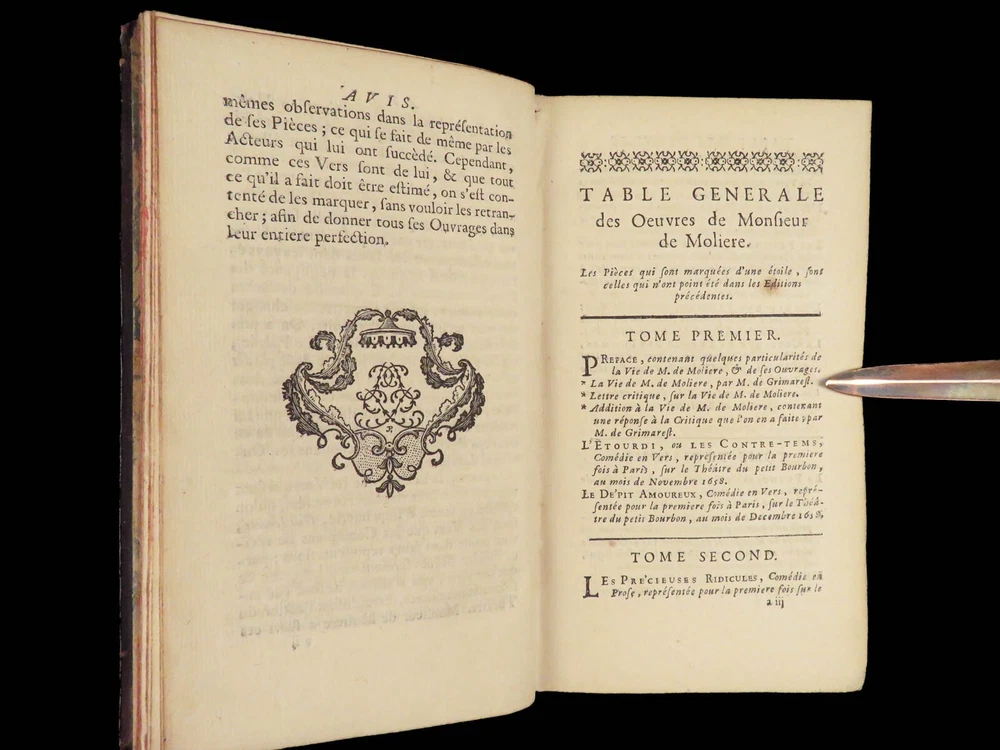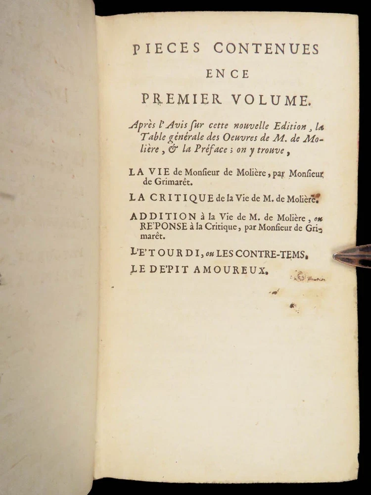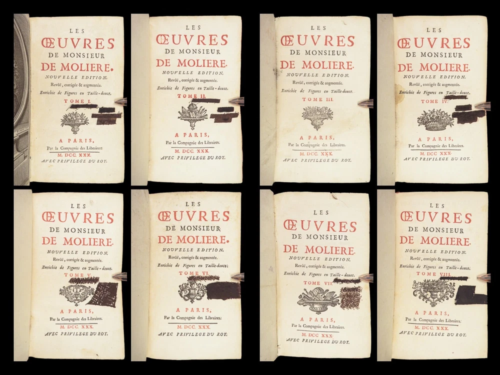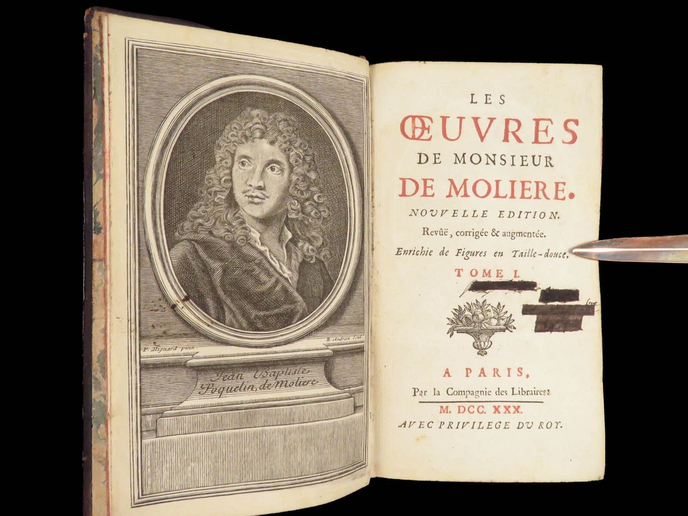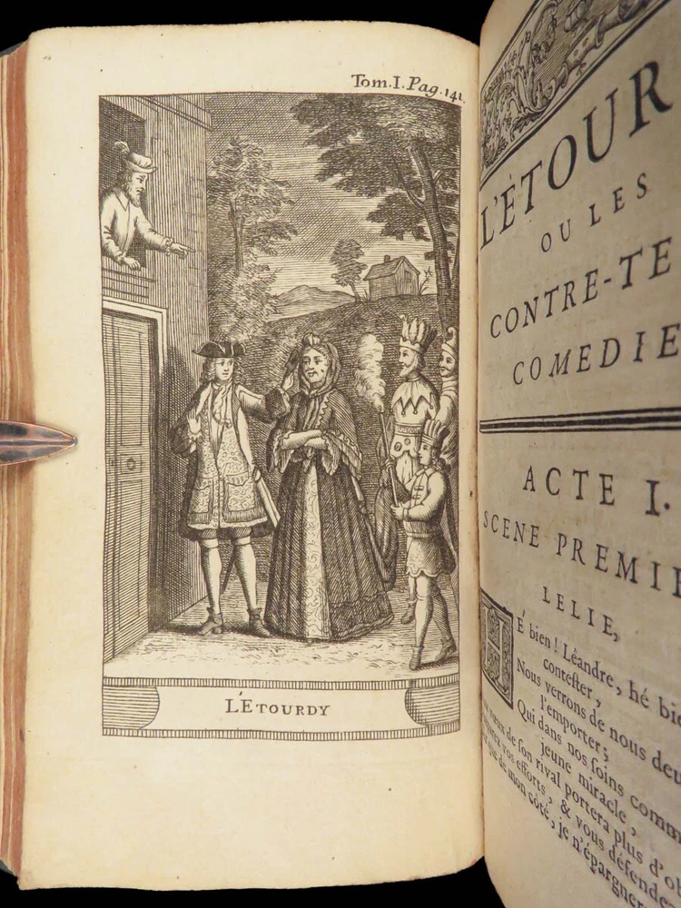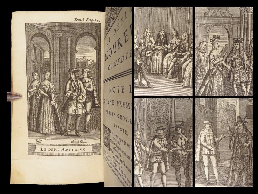 1730 Works of MOLIERE French Literature Misanthrope School for Wives 8v SET “It is not only what we do, but also what we do not do, for which we are accountable.” ― Molière A fine eight-volume set of the works of Moliere. This 1753 set was published in Paris and includes works such as ‘Tartuffe’, ‘School for Wives’, and ‘The Misanthrope’. This set is filled with 32 full-page engravings. Item number: #28551 Price: $750 MOLIERE Les Oeuvres de Molière. A Paris : Par la Compagnie des Libraires, 1730. Details : · Collation: Complete with all pages; 8 volumes o Vol. I. – Avertissement. Memoires sur la vie & les ouvrages de Moliere. L'etourdi. Le depit amoureux. Les precieuses ridicules. § 3 engraved plates o Vol. II – Sganarelle. Dom Garcie. L'école des maris. Les facheux. L'école des femmes. § 6 engraved plates o Vol. III – La critique de l'ecole des femmes. L'inpromptu de Versailles. La princesse d'élide. Festes de Versailles, en 1664. Le mariage forcé, comédie. Le mariage forcé, ballet. Dom Juan. § 5 engraved plates o Vol. IV – L'amour medecin. Le misanthrope. Le medecin malgré-lui. Melicerte. Fragment de pastorale. Le sicilien. § 4 engraved plates o Vol. V – Tartuffe. Amphitryon. L'avare. George Dandin. § 3 engraved plates o Vol. VI – Feste de Versailles, en 1668. M. de pour Ceaugnac. Les amans magnifiques. Le bourgeois gentilhomme. § 3 engraved plates o Vol. VII – Les fouberies de scapin. Psiché. Les femmes savantes. § 5 engraved plates o Vol. VIII – La comtesse d'Escarbagnas. Le malade imaginaire. Remerciment au roi. La gloire du val-de-grace. Extraits de divers auteurs. Recueil de plusieurs pieces. § 3 engraved plates · Language: French · Binding: Leather; tight and secure · Size: ~6.75in X 4in (17cm x 10cm) Our Guarantee: Very Fast. Very Safe. Free Shipping Worldwide. Customer satisfaction is our priority! Notify us with 7 days of receiving, and we will offer a full refund without reservation!