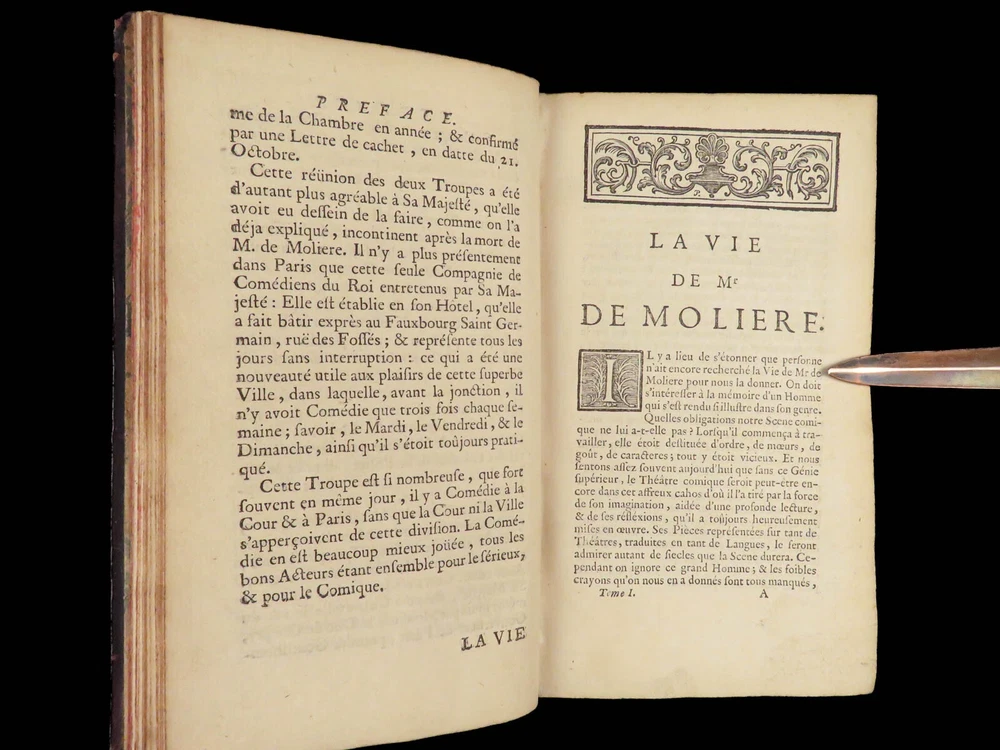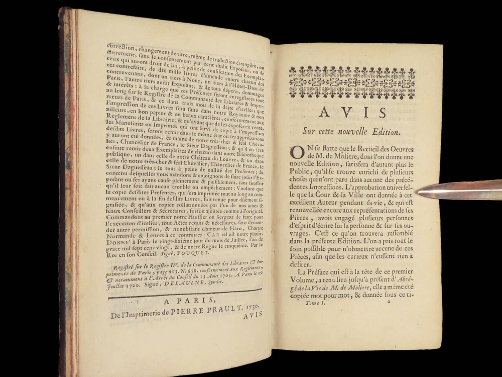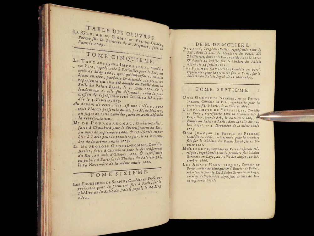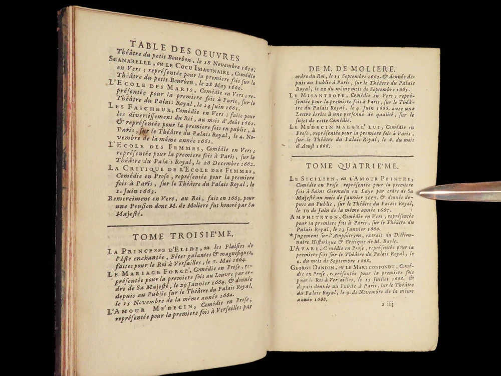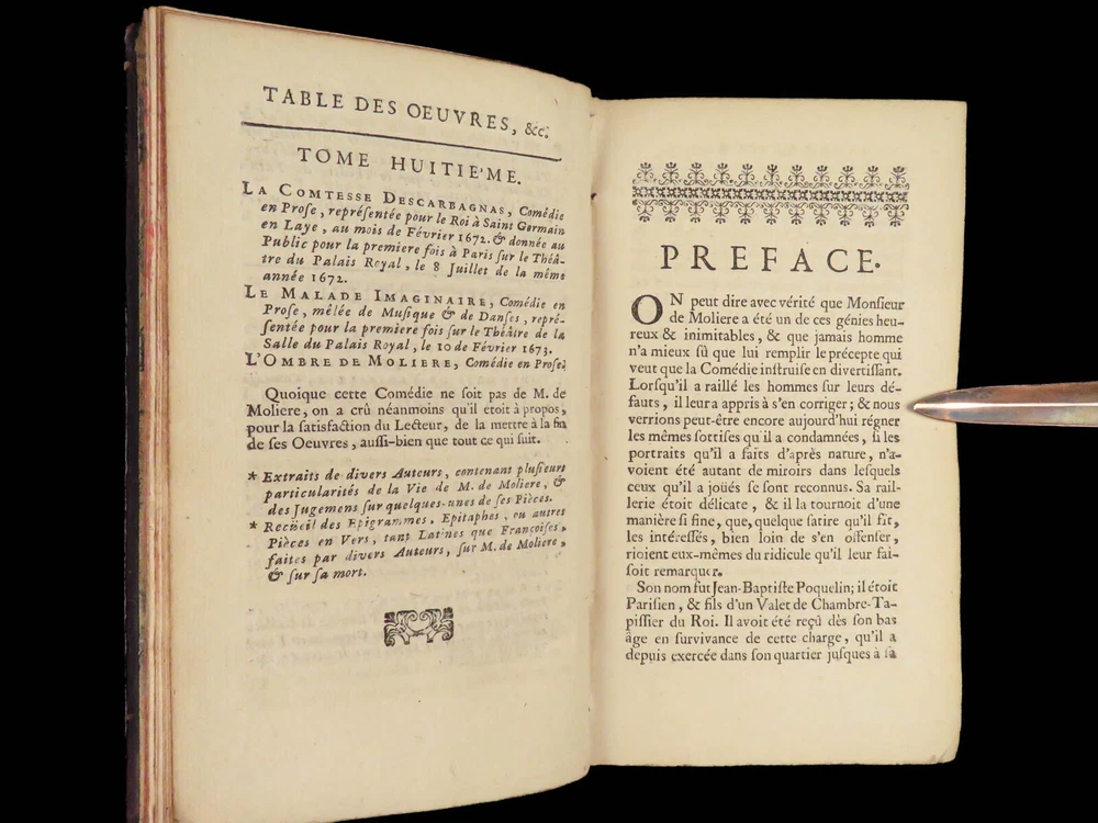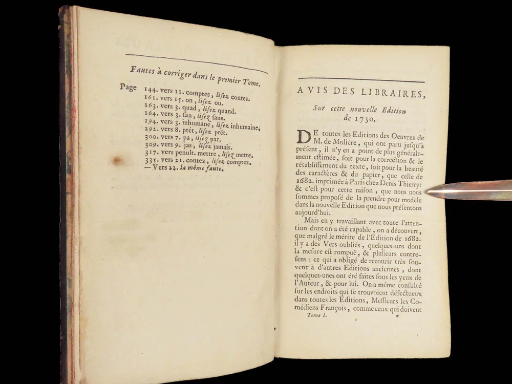 1730 Works of MOLIERE French Literature Misanthrope School for Wives 8v SET “It is not only what we do, but also what we do not do, for which we are accountable.” ― Molière A fine eight-volume set of the works of Moliere. This 1753 set was published in Paris and includes works such as ‘Tartuffe’, ‘School for Wives’, and ‘The Misanthrope’. This set is filled with 32 full-page engravings. Item number: #28551 Price: $750 MOLIERE Les Oeuvres de Molière. A Paris : Par la Compagnie des Libraires, 1730. Details : · Collation: Complete with all pages; 8 volumes o Vol. I. – Avertissement. Memoires sur la vie & les ouvrages de Moliere. L'etourdi. Le depit amoureux. Les precieuses ridicules. § 3 engraved plates o Vol. II – Sganarelle. Dom Garcie. L'école des maris. Les facheux. L'école des femmes. § 6 engraved plates o Vol. III – La critique de l'ecole des femmes. L'inpromptu de Versailles. La princesse d'élide. Festes de Versailles, en 1664. Le mariage forcé, comédie. Le mariage forcé, ballet. Dom Juan. § 5 engraved plates o Vol. IV – L'amour medecin. Le misanthrope. Le medecin malgré-lui. Melicerte. Fragment de pastorale. Le sicilien. § 4 engraved plates o Vol. V – Tartuffe. Amphitryon. L'avare. George Dandin. § 3 engraved plates o Vol. VI – Feste de Versailles, en 1668. M. de pour Ceaugnac. Les amans magnifiques. Le bourgeois gentilhomme. § 3 engraved plates o Vol. VII – Les fouberies de scapin. Psiché. Les femmes savantes. § 5 engraved plates o Vol. VIII – La comtesse d'Escarbagnas. Le malade imaginaire. Remerciment au roi. La gloire du val-de-grace. Extraits de divers auteurs. Recueil de plusieurs pieces. § 3 engraved plates · Language: French · Binding: Leather; tight and secure · Size: ~6.75in X 4in (17cm x 10cm) Our Guarantee: Very Fast. Very Safe. Free Shipping Worldwide. Customer satisfaction is our priority! Notify us with 7 days of receiving, and we will offer a full refund without reservation!