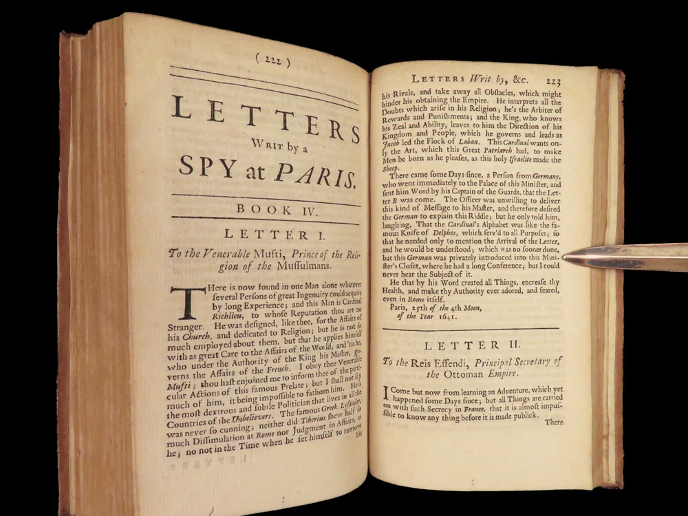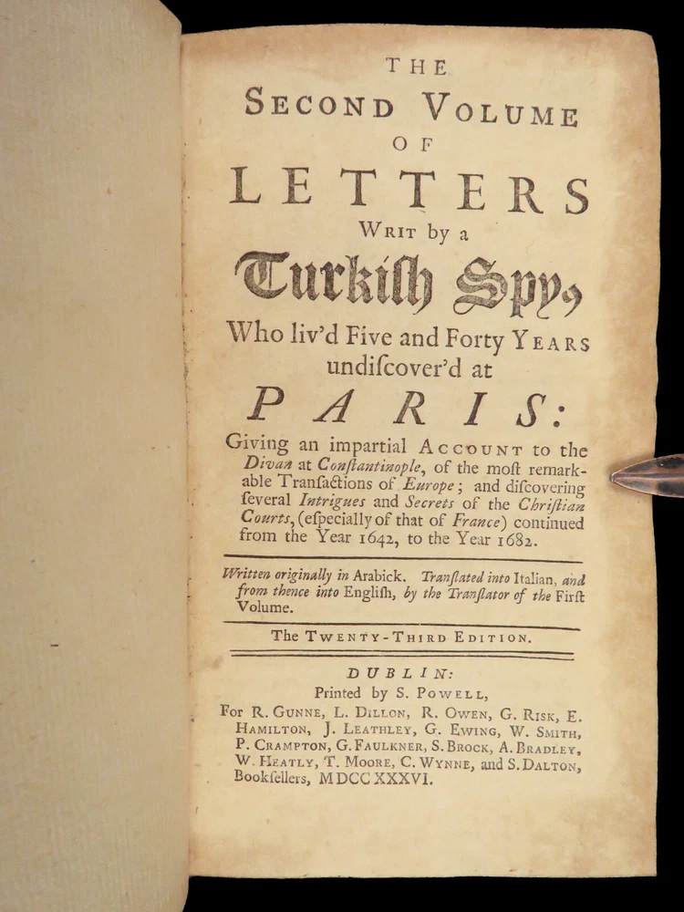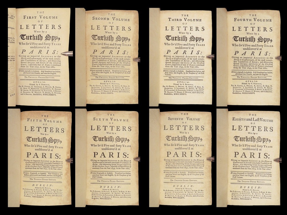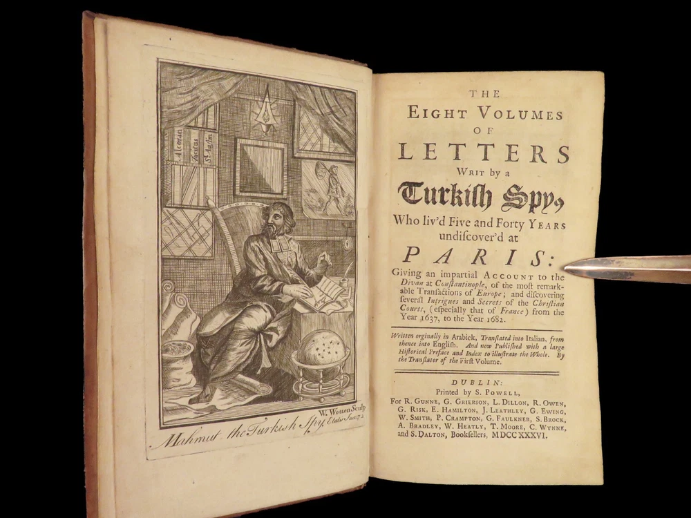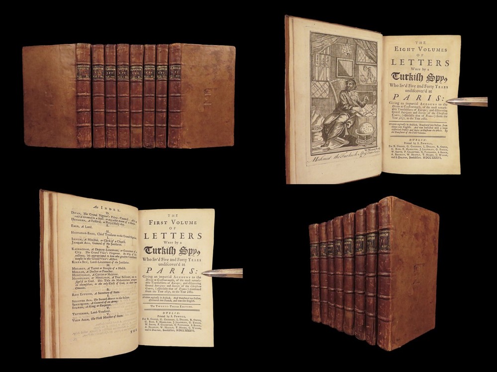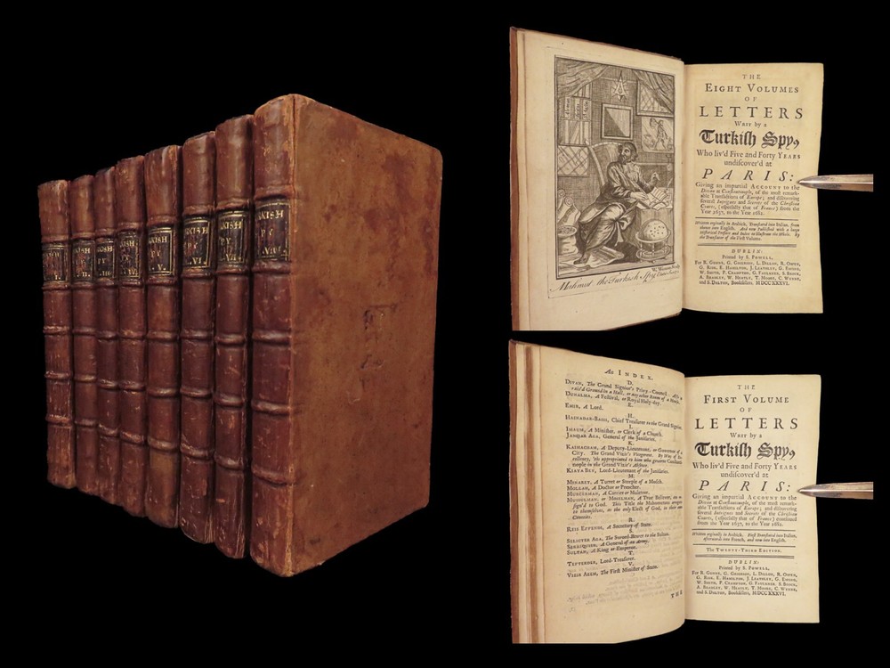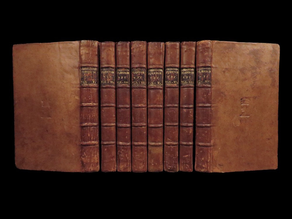 1736 ENGLISH Letters of Turkish SPY by Marana Ottoman Byzantine Political 8v SET Most known for his work ‘ Letters Writ by A Turkish Spy’ , Giovanni Paolo Marana was a political refugee during the reign of Louis XIV in France. The first volume, however, is the only volume he is known to have written. The subsequent seven volumes are attributed to various authors, even though some experts claim that Marana himself may have written them. ‘ Letters’ is a collection of hundreds of fictional letters by an Ottoman spy named Mahmut, who also happened to be in the court of Louis XIV. The correspondence in this work covers the mid-17 th -century in France are a satirical view of the current state of politics and society in Paris – making slights at figures such as Cardinal Richelieu. Item number: #27250 Price: $750 MARANA, Giovanni Paolo The eight volumes of letters writ by a Turkish spy who liv'd five and forty years undiscover'd at Paris Dublin: printed by S. Powell, 1736. Details : · Collation: Complete with all pages; 8 volumes o Each volume paginated separately o Engraved frontispiece in Vol. I · Language: English · Binding: Leather; tight and secure · Size : ~6.75in X 4in (17cm x 10cm) Our Guarantee: Very Fast. Very Safe. Free Shipping Worldwide. Customer satisfaction is our priority! Notify us with 7 days of receiving, and we will offer a full refund without reservation!