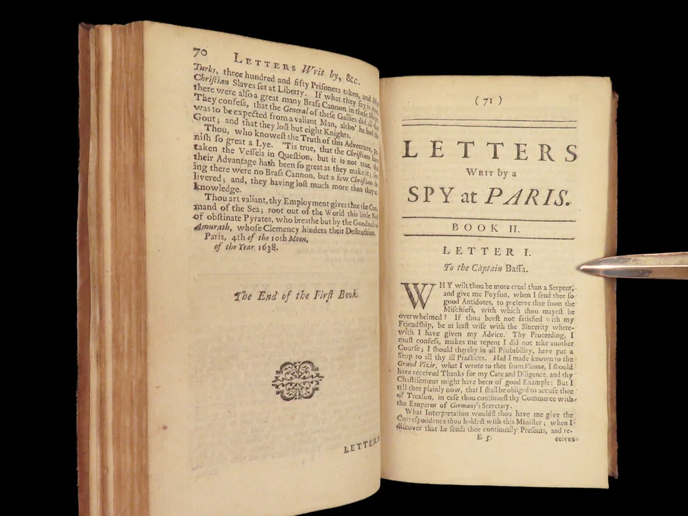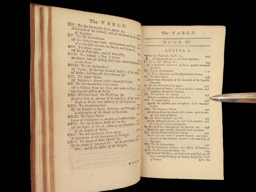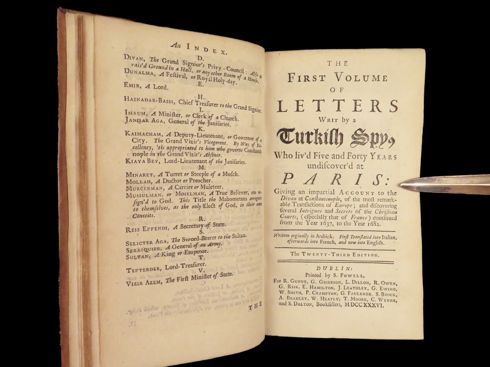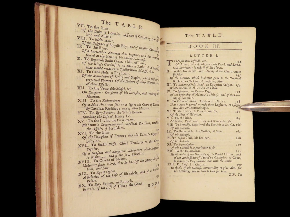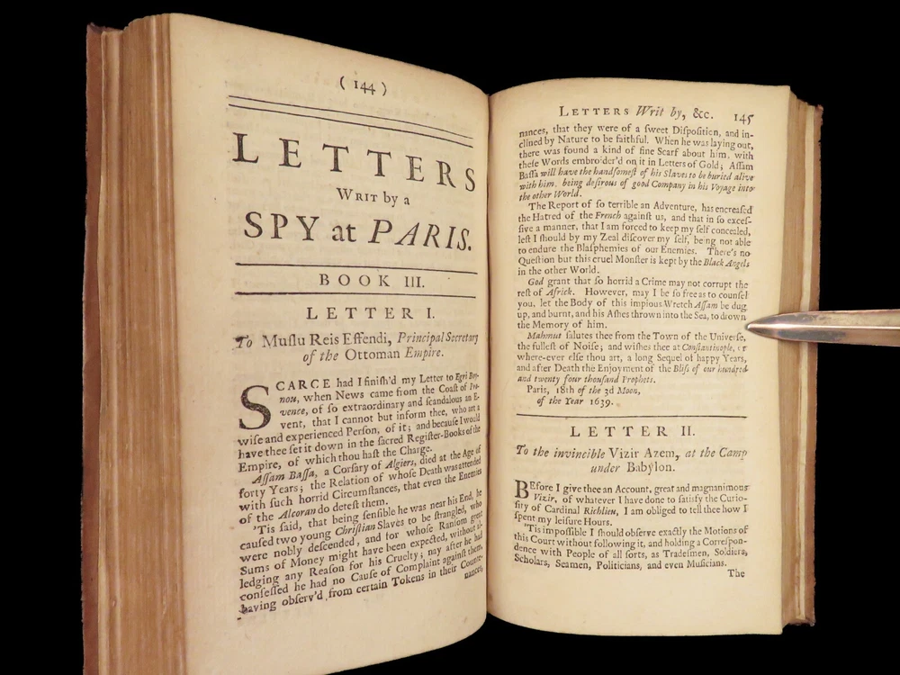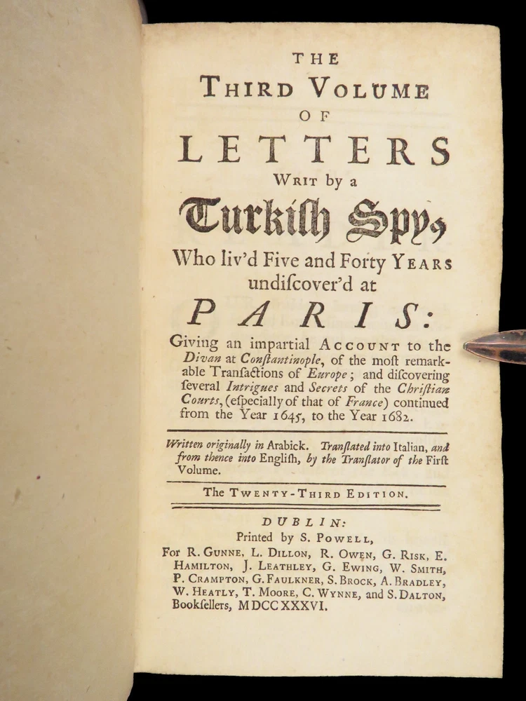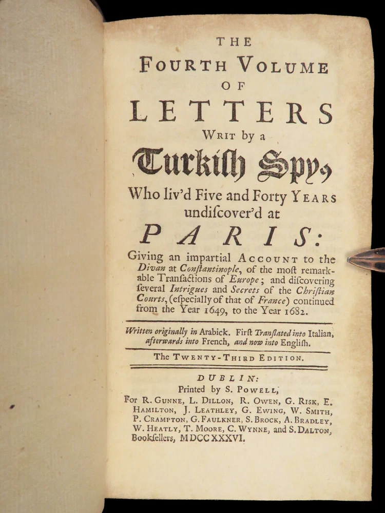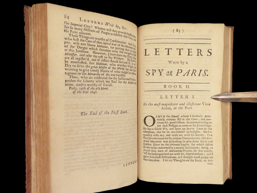 1736 ENGLISH Letters of Turkish SPY by Marana Ottoman Byzantine Political 8v SET Most known for his work ‘ Letters Writ by A Turkish Spy’ , Giovanni Paolo Marana was a political refugee during the reign of Louis XIV in France. The first volume, however, is the only volume he is known to have written. The subsequent seven volumes are attributed to various authors, even though some experts claim that Marana himself may have written them. ‘ Letters’ is a collection of hundreds of fictional letters by an Ottoman spy named Mahmut, who also happened to be in the court of Louis XIV. The correspondence in this work covers the mid-17 th -century in France are a satirical view of the current state of politics and society in Paris – making slights at figures such as Cardinal Richelieu. Item number: #27250 Price: $750 MARANA, Giovanni Paolo The eight volumes of letters writ by a Turkish spy who liv'd five and forty years undiscover'd at Paris Dublin: printed by S. Powell, 1736. Details : · Collation: Complete with all pages; 8 volumes o Each volume paginated separately o Engraved frontispiece in Vol. I · Language: English · Binding: Leather; tight and secure · Size : ~6.75in X 4in (17cm x 10cm) Our Guarantee: Very Fast. Very Safe. Free Shipping Worldwide. Customer satisfaction is our priority! Notify us with 7 days of receiving, and we will offer a full refund without reservation!