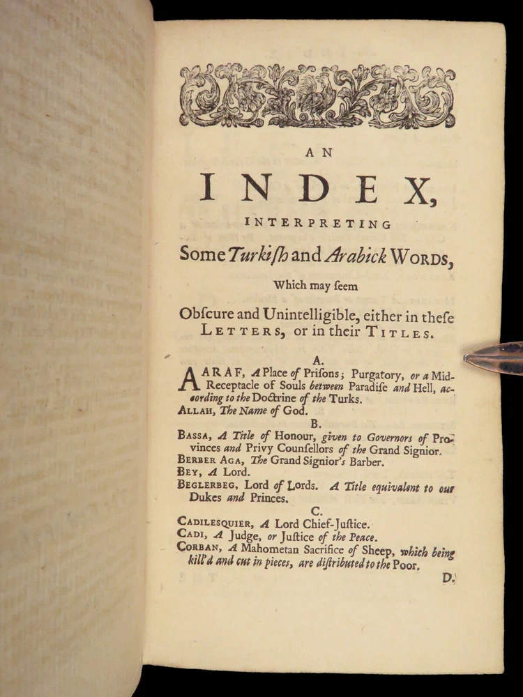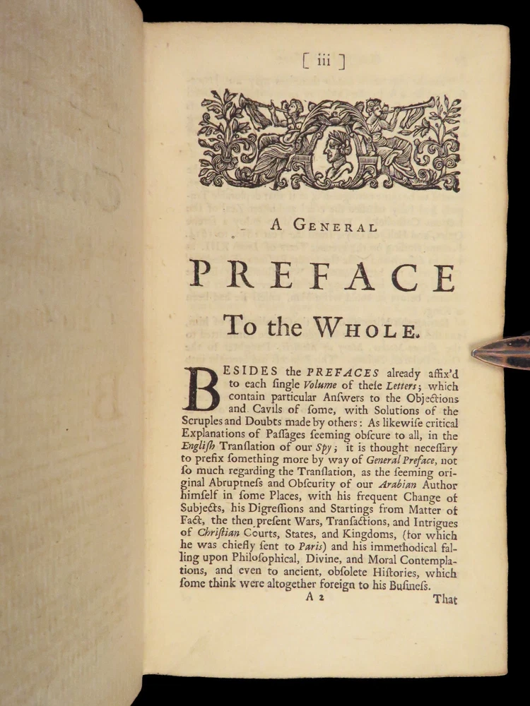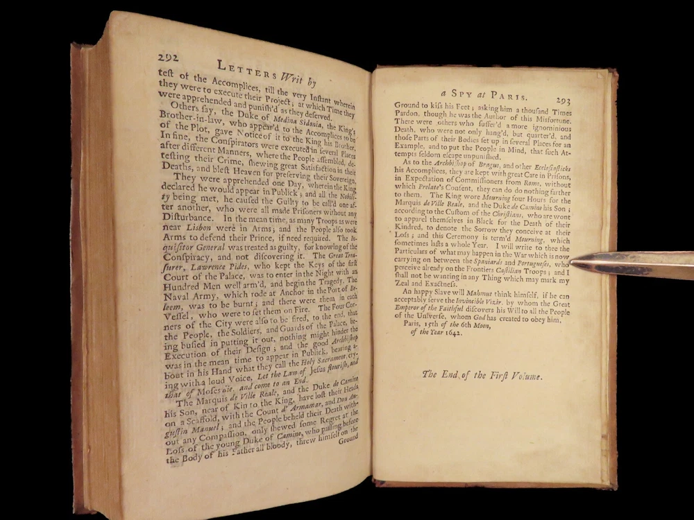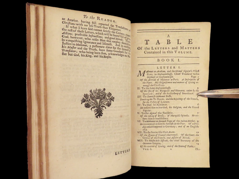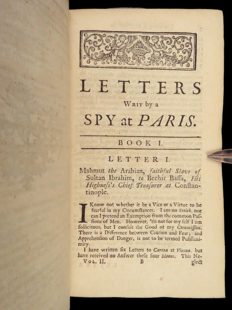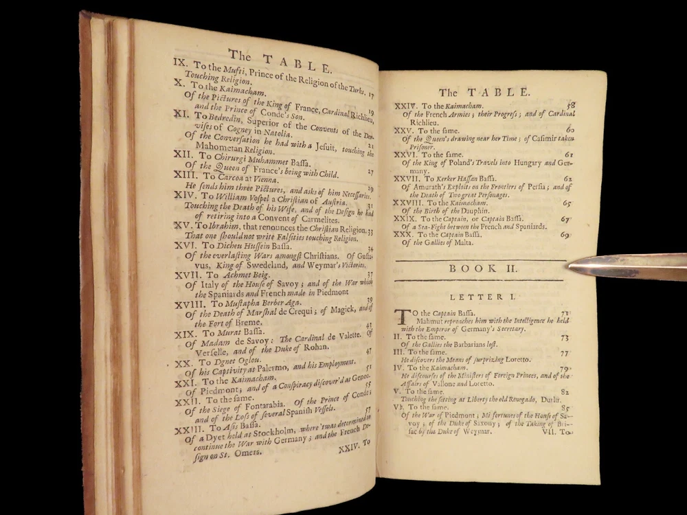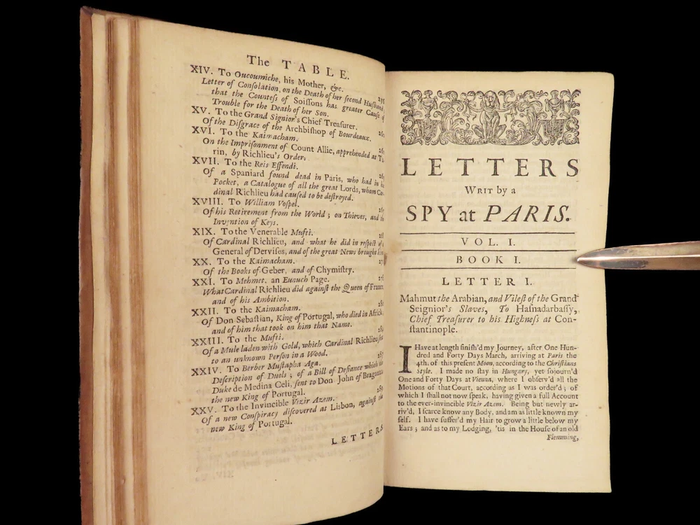 1736 ENGLISH Letters of Turkish SPY by Marana Ottoman Byzantine Political 8v SET Most known for his work ‘ Letters Writ by A Turkish Spy’ , Giovanni Paolo Marana was a political refugee during the reign of Louis XIV in France. The first volume, however, is the only volume he is known to have written. The subsequent seven volumes are attributed to various authors, even though some experts claim that Marana himself may have written them. ‘ Letters’ is a collection of hundreds of fictional letters by an Ottoman spy named Mahmut, who also happened to be in the court of Louis XIV. The correspondence in this work covers the mid-17 th -century in France are a satirical view of the current state of politics and society in Paris – making slights at figures such as Cardinal Richelieu. Item number: #27250 Price: $750 MARANA, Giovanni Paolo The eight volumes of letters writ by a Turkish spy who liv'd five and forty years undiscover'd at Paris Dublin: printed by S. Powell, 1736. Details : · Collation: Complete with all pages; 8 volumes o Each volume paginated separately o Engraved frontispiece in Vol. I · Language: English · Binding: Leather; tight and secure · Size : ~6.75in X 4in (17cm x 10cm) Our Guarantee: Very Fast. Very Safe. Free Shipping Worldwide. Customer satisfaction is our priority! Notify us with 7 days of receiving, and we will offer a full refund without reservation!