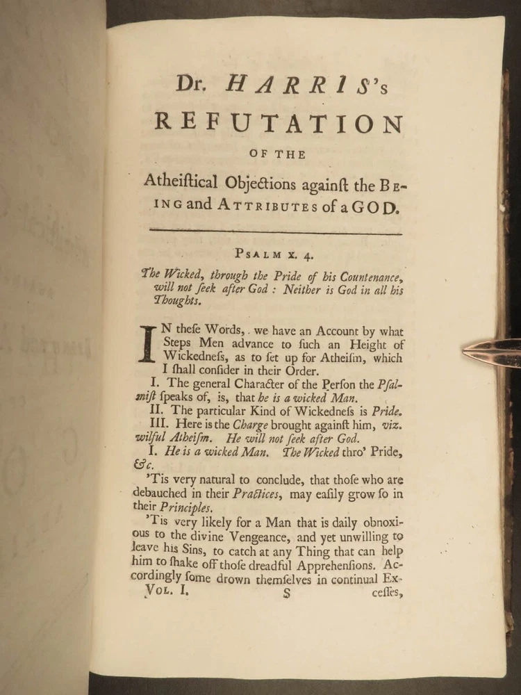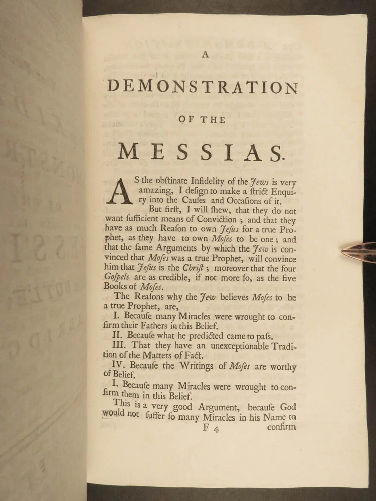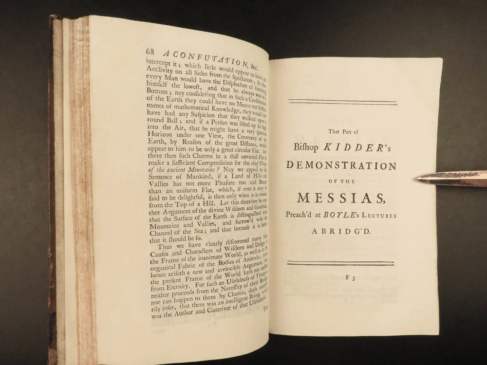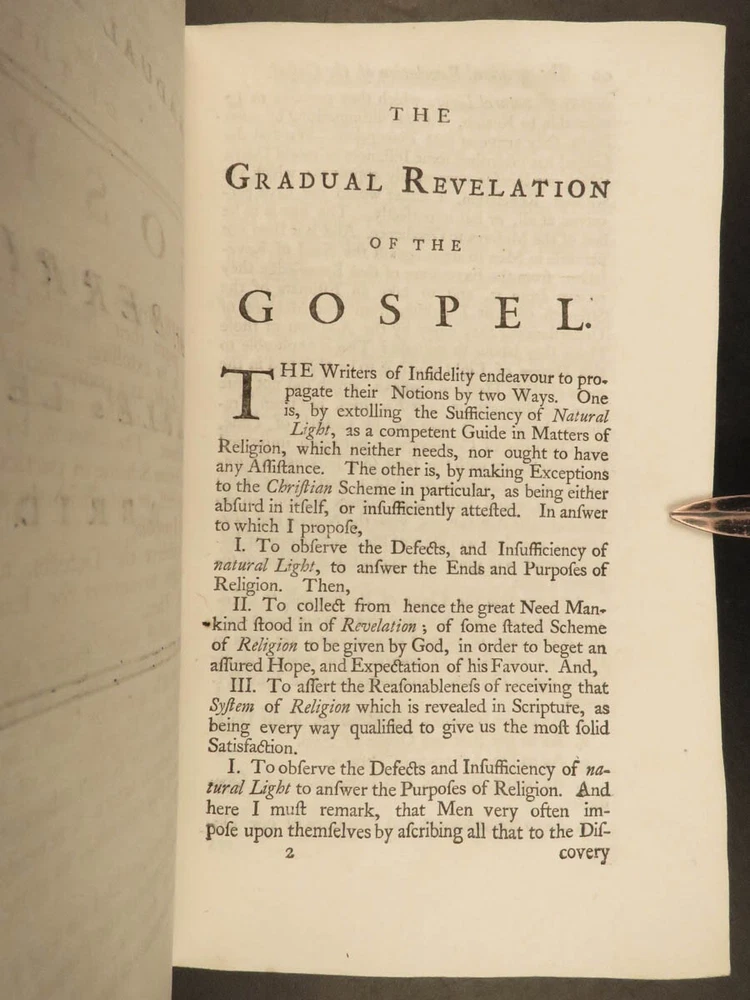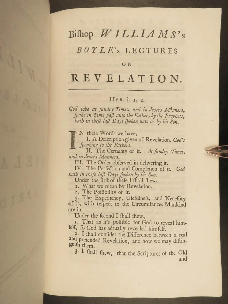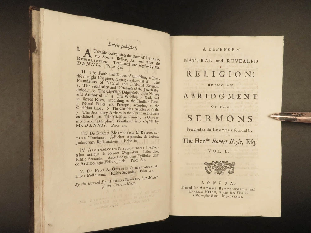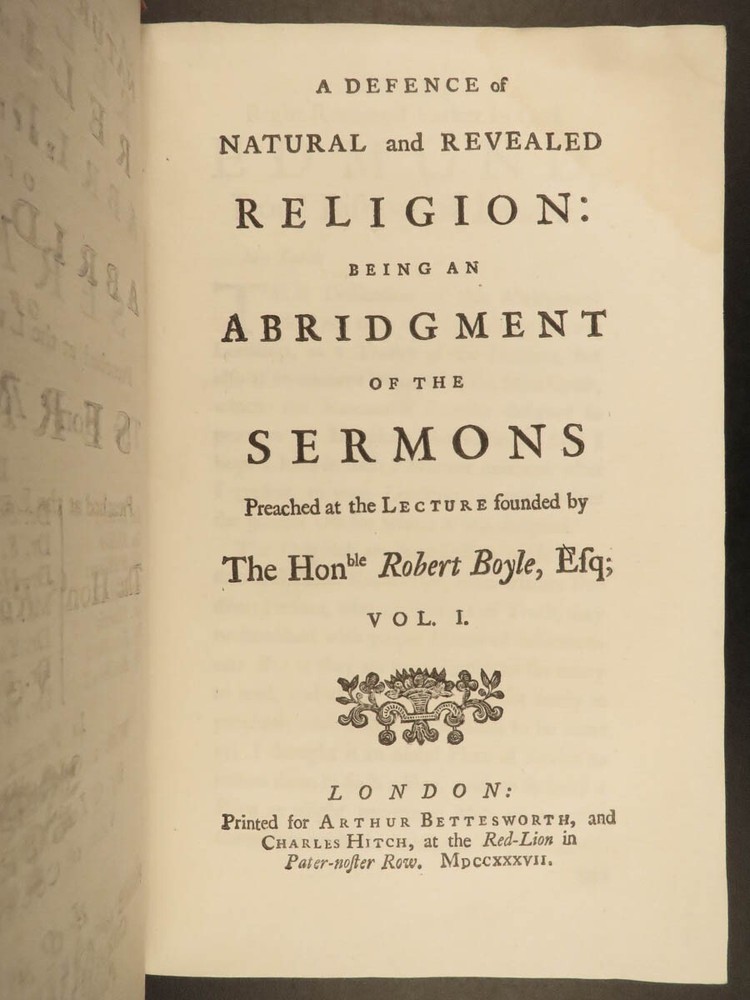 1737 1 ed Natural & Revealed Religion Bible Sermons Robert Boyle Lecture 4v SET Gilbert Burnet, best known for his historical treatises, edited and collected an important collection of English sermons. This work, “ A Defense of natural and Revealed Religion ”, contains sermons of preachers who preached at a lecture of Robert Boyle. This four-volume set was published in 1737 and includes sermons by Bentley, Kidder, Gastrell, Ibbot, Berriman, and many others. Item number: #22055 Price: $750 BURNET, Gilbert A defence of natural and revealed religion: being an abridgment of the sermons preached at the lecture founded by the Hon[ble] Robert Boyle London: Printed for Arthur Bettesworth and Charles Hitch, 1737. 1 st edition Details : · Collation: Complete with all pages; 4 volumes o Vol. 1 – [8], 490 o Vol. 2 – [4], 483, [1] o Vol. 3 – [4], 532 o Vol. 4 – [2], 413, [1] · Provenance: Bookplate – John R. Lambert · Language: English · Binding: Leather; tight and secure · Size : ~8in X 5.25in (20cm x 13cm) · Quite rare Our Guarantee: Very Fast. Very Safe. Free Shipping Worldwide. Customer satisfaction is our priority! Notify us with 7 days of receiving, and we will offer a full refund without reservation! 22055