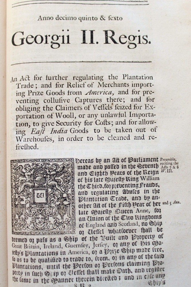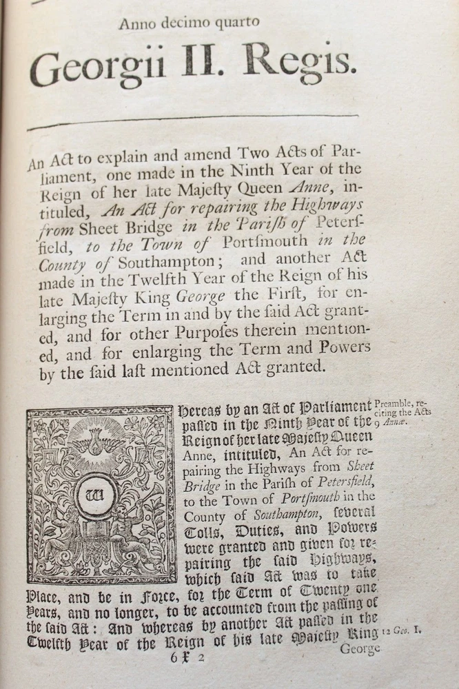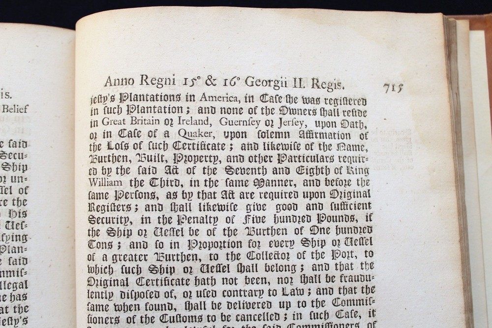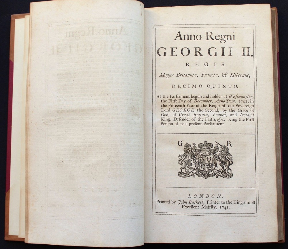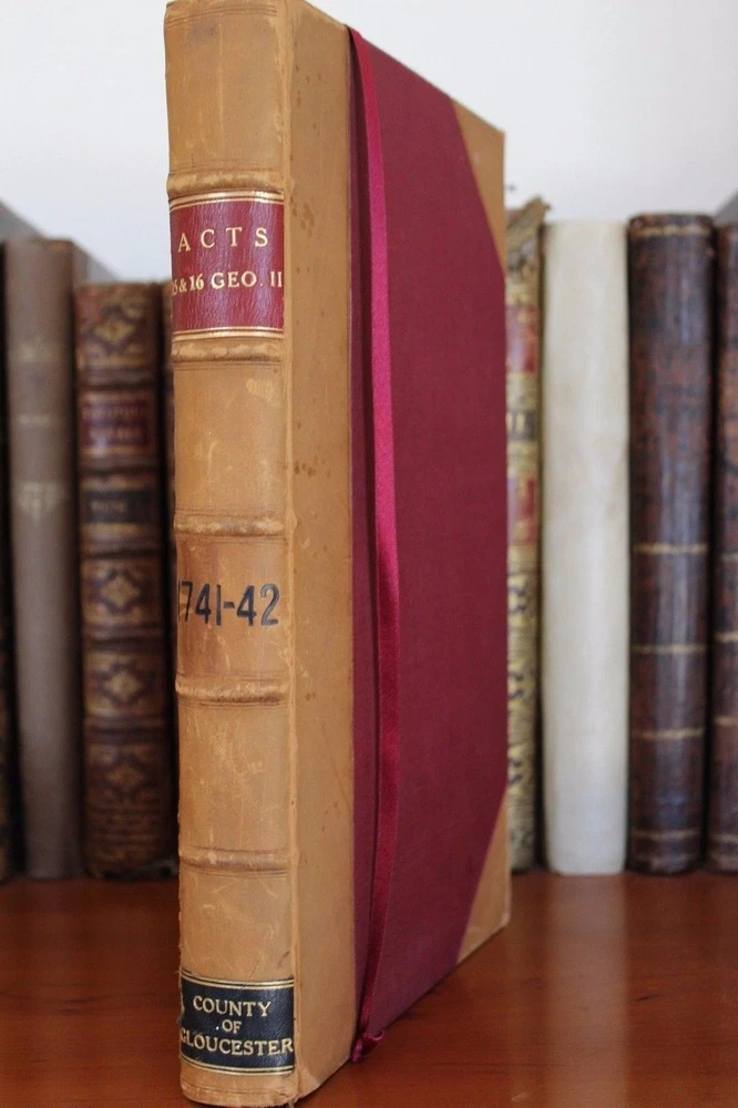Collection of 33 Acts passed during the reign of King George II (1683-1760) for the years 1741 & 1742 These historically significant laws are a valuable source for the understanding of the British internal and external policies in the 18 th century. The Acts regulate among many others, trade, commerce, tariffs, wars, society, religion, education, science, navy, privateers, sugar plantations, lotteries, construction, repairs of roads and bridges... Some of these concern directly the Empire’s colonies such as those in America and the East Indies. All the statutes in this group were passed prior to the United States independence. The complete list of Acts in this specific set is provided bellow. It includes an important and rare Act which grants John Byrom (1692- 1763), the inventor of the revolutionary shorthand writing system, the “ sole right of publishing the art and method of short-hand invented by him.”. Another most interesting legislation related with trade in America and East India is the “Act for further regulating the Plantation Trade, and for the relief of Merchants importing Prize Goods from America…”. The Act prohibiting the marriage of lunatics is scarce on the market. Physical description: (about 30 x 18 cm); Numerous Acts with separate title pages and different pagination (as issued); [8] pp. for “A Table of the Statutes Publick and Private”. Ornamental woodcut initials and vignettes. 20 th century half leather binding, spine titled “ ACTS 15& 16 GEO II | 1741-42 | COUNTY OF GLOUCESTER”. Printed: London, by John Baskett, 1741 & 1742 Provenance: County of Gloucester, England. Condition: Each Act complete by itself. Very good overall condition despite marginal stains affecting final four Acts including the listing nº 30, minor browning, some leaves a little soiled, other minor imperfections. Binding with some wear, joints cracked. Please see images. Acts titles included in this collection for the years 1741-1742: 1)“ An Act for continuing the Duties upon Malt, Mum, Cyder, and Perry, in the Part of Great Britain, called England; and for granting to His Majesty certain Duties upon Malt, Mum, Cyder, and Perry, in that Part of Great Britain called Scotland, for the Service of the Year One Thousand Seven Hundred and forty two.( Title page, pp.3 -35 as issued). 2) “An Act to to repeal so much of an Act passed in the last session of Parliament, intituled An Act for the Preservation of the Publick Roads in the Part of Great Britain called England, as obliges Persons not travelling for Hire to make use of Wagons with Wheels bound with Streaks or Tyre of a certain Breadth… ”. (title, pp. 39- 40 as issued ). 3) “An Act for granting to His Majesty a certain Sum out of the Sinking Fund, towards the Supply for the Year One Thousand Seven Hundred and Forty Two” (title, pp. 43-48 as issued ). 4) “An Act for punishing Mutiny and Desertion and for the better Payment of the Army and their Quarters. ” (title, pp.51-83 as issued ). 5) “ An Act for continuing and making more effectual an Act made in the Seventh Year of the Reign of His late Majesty King George the First, intituled, An Act for repairing the Road from Wendover to the Town of Buckingham in the County of Bucks; and for building a Bridge at Padbury, and making it a County Bridge” (title, pp.87-91 as issued ). 6) “ An Act for enlarging the Term and Powers granted by Two Acts of Parliament, one of the Eighth Year of the Reign of her late Majesty Queen Anne, and the other of ……” (title, pp. 95-99 as issued). 7) “ An Act for enlarging the Term and Powers granted by an Act ……intituled, An Act for Repairing the Roads leading from the Town of Bromsgrove to the Town of Dudley in the County of Worcester: and from the said Town of Bromsgrove to the town of Birmingham in the County of Warwick……. ”. (title, pp.103- 115 as issued ). 8) “An Act for laying a Duty of Two Pennies Scots, or One Sixth Part of a Peny Sterling, upon every Scots Pint of Ale and Beer which shall be brewed for Sale….. (title, pp. 119 – 126 as issued ). 9) “An Act for enlarging the Term and Powers granted by two Acts of Parliament, one of the First, and other….repairing Highways between Tyburn and Uxbridge in the County of Middlefex; and for amending the Road leading from Brent-Bridge…..” (title, pp. 131 – 151 as issued ). 10) “An Act for explaining, amending, and making more effectual Two Acts of Parliament…for erecting Workhouses, and Houses of Correction, in the town of Kingston upon Hull, for the Employment and maintenance of the Poor there….”. (title, pp. 155-163 as issued ). 11) “An Act to explain and aned an Act passed in the Twelfth Year of His Majesty’s Reign intituled, An Act to enable the Parishioners of Saint Catherine Coleman, in Fenchurch Street, in the city of London, to rebuild the Church of the Said Parish, and…” (title, pp. 519 – 524 as issued ). 12) “An Act for establishing an Agreement with the Governor and Company of the Bank of England, for advancing the Sum of One million six hundred thousand pounds, towards the Supply for the service of the year one thousand seven hundred and forty two.” (Title, pp. 527-539 as issued). 13) “ An Act to explain ….repairing the Highways from Sheet Bridge in the Parish of Petersfield….” (title, pp.543 – 548 as issued ). 14) “An Act for enlarging the term and Powers granted by an Act passed in the thirteenth year….for repairing the Roads leading from Cirencester town’s-end to Saint John’s Bridge in the _County of Gloucester” (title, pp. 551- 563 as issued ). 15)“An Act for continuing the Powers ….from Stump-cross to Newmarket-heath, and the town of Cambridge…..”. (title, pp. 567-574 as issued ). 16)“An Act for enlarging the term and powers granted by an Act passed in the Seventh Year of the Reign of his late Majesty King George the First, for repairing the several roads leading from the town Ledbur