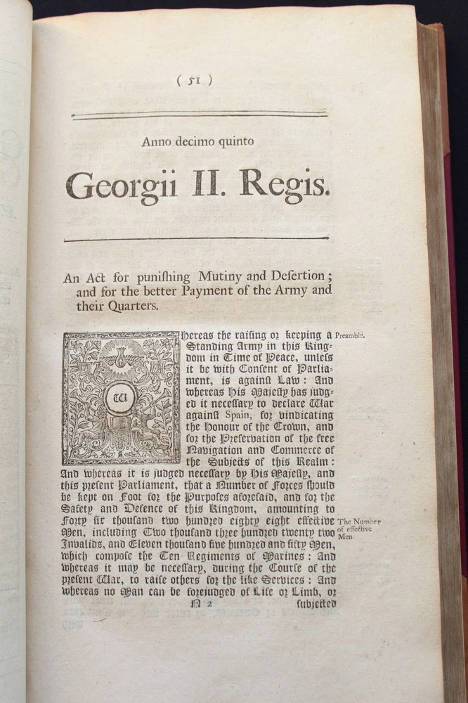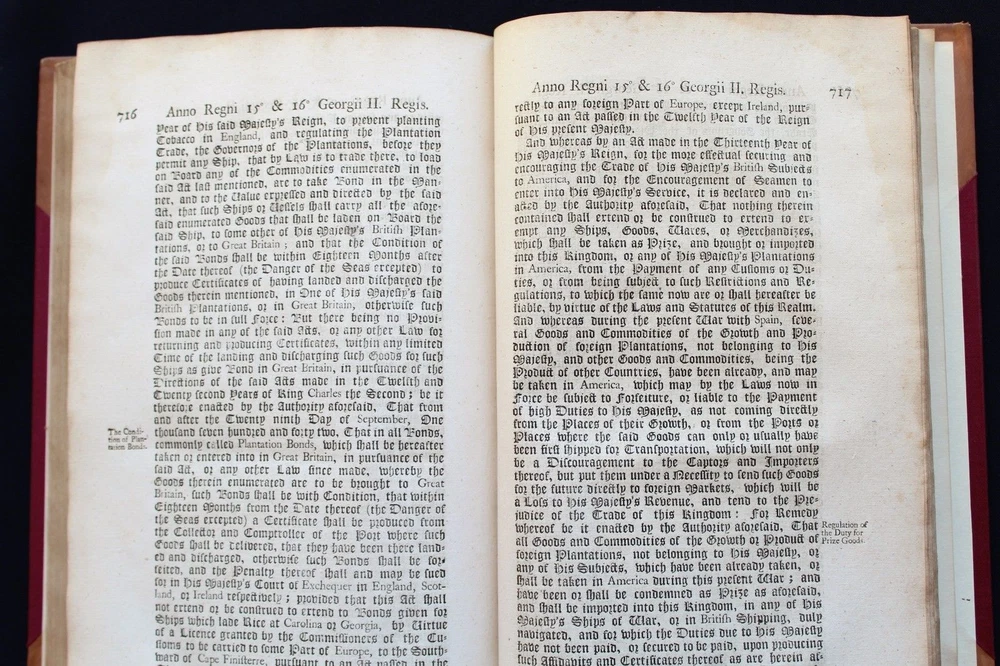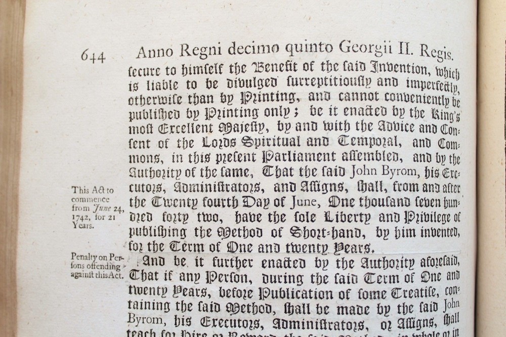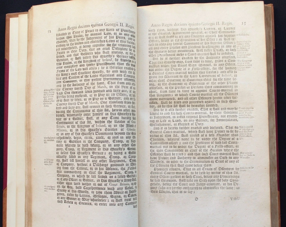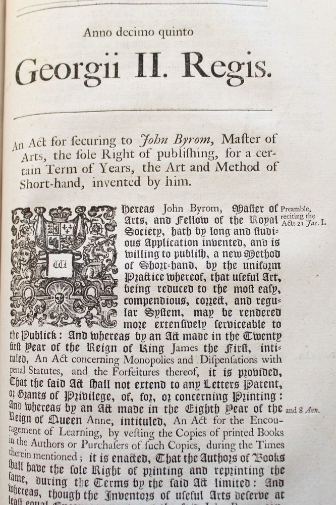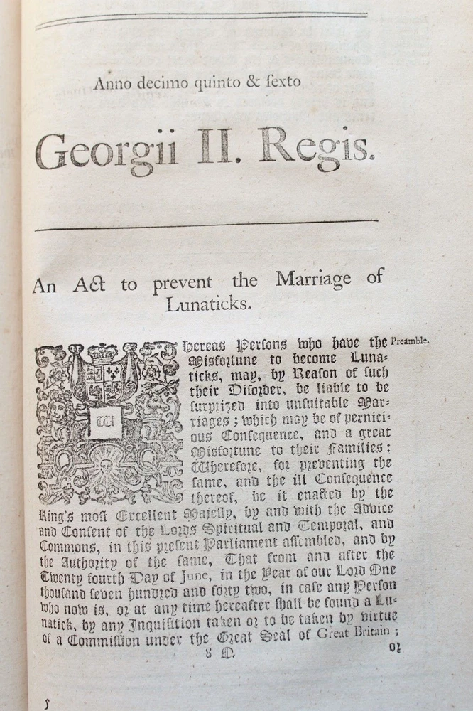 Collection of 33 Acts passed during the reign of King George II (1683-1760) for the years 1741 & 1742 These historically significant laws are a valuable source for the understanding of the British internal and external policies in the 18 th century. The Acts regulate among many others, trade, commerce, tariffs, wars, society, religion, education, science, navy, privateers, sugar plantations, lotteries, construction, repairs of roads and bridges... Some of these concern directly the Empire’s colonies such as those in America and the East Indies. All the statutes in this group were passed prior to the United States independence. The complete list of Acts in this specific set is provided bellow. It includes an important and rare Act which grants John Byrom (1692- 1763), the inventor of the revolutionary shorthand writing system, the “ sole right of publishing the art and method of short-hand invented by him.”. Another most interesting legislation related with trade in America and East India is the “Act for further regulating the Plantation Trade, and for the relief of Merchants importing Prize Goods from America…”. The Act prohibiting the marriage of lunatics is scarce on the market. Physical description: (about 30 x 18 cm); Numerous Acts with separate title pages and different pagination (as issued); [8] pp. for “A Table of the Statutes Publick and Private”. Ornamental woodcut initials and vignettes. 20 th century half leather binding, spine titled “ ACTS 15& 16 GEO II | 1741-42 | COUNTY OF GLOUCESTER”. Printed: London, by John Baskett, 1741 & 1742 Provenance: County of Gloucester, England. Condition: Each Act complete by itself. Very good overall condition despite marginal stains affecting final four Acts including the listing nº 30, minor browning, some leaves a little soiled, other minor imperfections. Binding with some wear, joints cracked. Please see images. Acts titles included in this collection for the years 1741-1742: 1)“ An Act for continuing the Duties upon Malt, Mum, Cyder, and Perry, in the Part of Great Britain, called England; and for granting to His Majesty certain Duties upon Malt, Mum, Cyder, and Perry, in that Part of Great Britain called Scotland, for the Service of the Year One Thousand Seven Hundred and forty two.( Title page, pp.3 -35 as issued). 2) “An Act to to repeal so much of an Act passed in the last session of Parliament, intituled An Act for the Preservation of the Publick Roads in the Part of Great Britain called England, as obliges Persons not travelling for Hire to make use of Wagons with Wheels bound with Streaks or Tyre of a certain Breadth… ”. (title, pp. 39- 40 as issued ). 3) “An Act for granting to His Majesty a certain Sum out of the Sinking Fund, towards the Supply for the Year One Thousand Seven Hundred and Forty Two” (title, pp. 43-48 as issued ). 4) “An Act for punishing Mutiny and Desertion and for the better Payment of the Army and their Quarters. ” (title, pp.51-83 as issued ). 5) “ An Act for continuing and making more effectual an Act made in the Seventh Year of the Reign of His late Majesty King George the First, intituled, An Act for repairing the Road from Wendover to the Town of Buckingham in the County of Bucks; and for building a Bridge at Padbury, and making it a County Bridge” (title, pp.87-91 as issued ). 6) “ An Act for enlarging the Term and Powers granted by Two Acts of Parliament, one of the Eighth Year of the Reign of her late Majesty Queen Anne, and the other of ……” (title, pp. 95-99 as issued). 7) “ An Act for enlarging the Term and Powers granted by an Act ……intituled, An Act for Repairing the Roads leading from the Town of Bromsgrove to the Town of Dudley in the County of Worcester: and from the said Town of Bromsgrove to the town of Birmingham in the County of Warwick……. ”. (title, pp.103- 115 as issued ). 8) “An Act for laying a Duty of Two Pennies Scots, or One Sixth Part of a Peny Sterling, upon every Scots Pint of Ale and Beer which shall be brewed for Sale….. (title, pp. 119 – 126 as issued ). 9) “An Act for enlarging the Term and Powers granted by two Acts of Parliament, one of the First, and other….repairing Highways between Tyburn and Uxbridge in the County of Middlefex; and for amending the Road leading from Brent-Bridge…..” (title, pp. 131 – 151 as issued ). 10) “An Act for explaining, amending, and making more effectual Two Acts of Parliament…for erecting Workhouses, and Houses of Correction, in the town of Kingston upon Hull, for the Employment and maintenance of the Poor there….”. (title, pp. 155-163 as issued ). 11) “An Act to explain and aned an Act passed in the Twelfth Year of His Majesty’s Reign intituled, An Act to enable the Parishioners of Saint Catherine Coleman, in Fenchurch Street, in the city of London, to rebuild the Church of the Said Parish, and…” (title, pp. 519 – 524 as issued ). 12) “An Act for establishing an Agreement with the Governor and Company of the Bank of England, for advancing the Sum of One million six hundred thousand pounds, towards the Supply for the service of the year one thousand seven hundred and forty two.” (Title, pp. 527-539 as issued). 13) “ An Act to explain ….repairing the Highways from Sheet Bridge in the Parish of Petersfield….” (title, pp.543 – 548 as issued ). 14) “An Act for enlarging the term and Powers granted by an Act passed in the thirteenth year….for repairing the Roads leading from Cirencester town’s-end to Saint John’s Bridge in the _County of Gloucester” (title, pp. 551- 563 as issued ). 15)“An Act for continuing the Powers ….from Stump-cross to Newmarket-heath, and the town of Cambridge…..”. (title, pp. 567-574 as issued ). 16)“An Act for enlarging the term and powers granted by an Act passed in the Seventh Year of the Reign of his late Majesty King George the First, for repairing the several roads leading from the town Ledbur