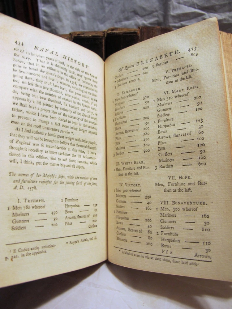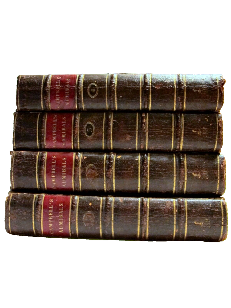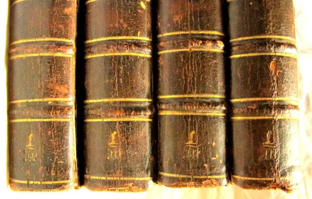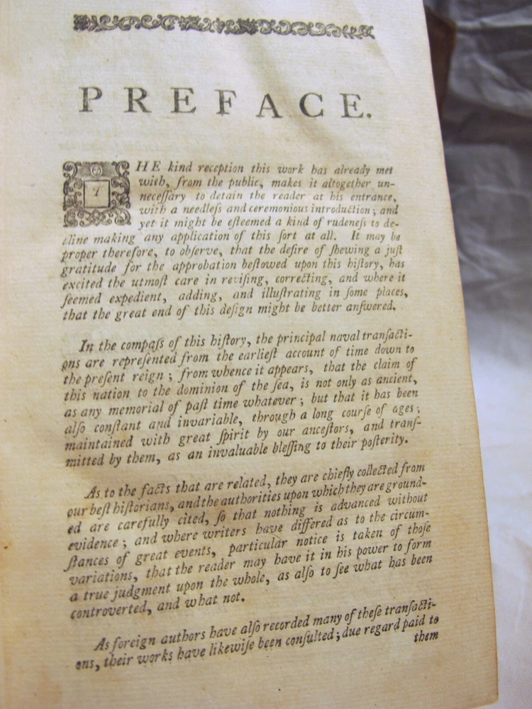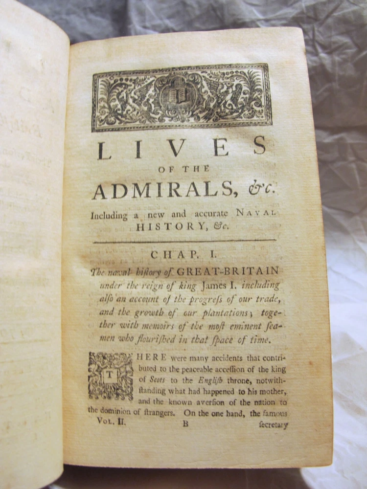 Early Naval history books, in English, from the 1700s! Bound in full leather with red leather spine labels. 1750 second edition. Complete four volume set. Volumes 1 and 2 lost their volume numbers from the spines, the other two have them intact. Splitting between covers and spines, but boards still firmly attached at the cords. Some age toning on pages. All bindings are still tight. Previous owners name handwritten on first free end paper of volume one. 8" x 5" ea. Set needs 6.25" of shelf space. A couple pictures show white between some volumes, but that is just a problem with the editing tool; sorry.
