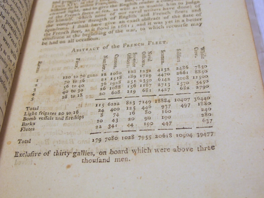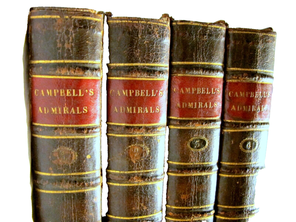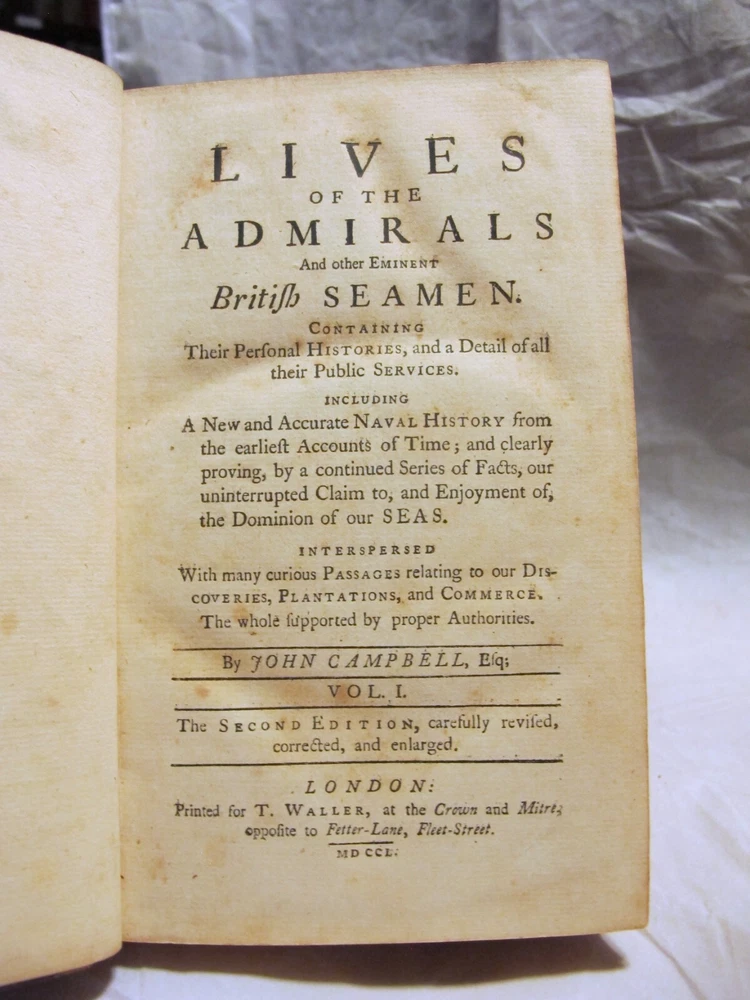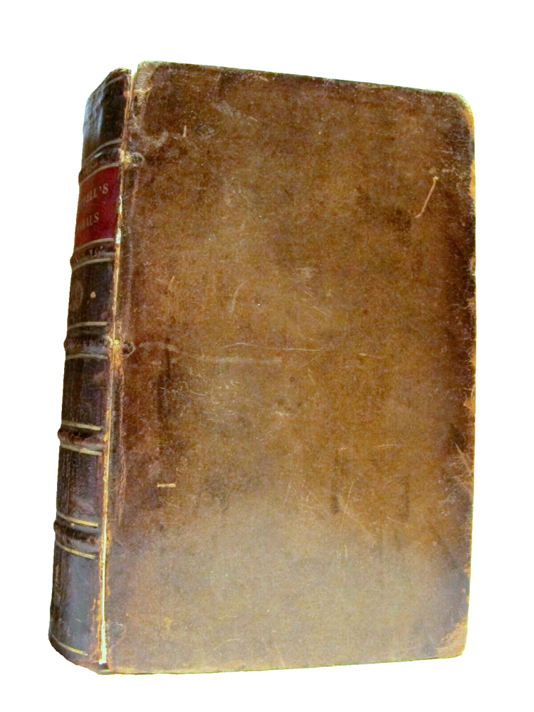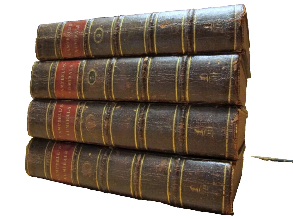 Early Naval history books, in English, from the 1700s! Bound in full leather with red leather spine labels. 1750 second edition. Complete four volume set. Volumes 1 and 2 lost their volume numbers from the spines, the other two have them intact. Splitting between covers and spines, but boards still firmly attached at the cords. Some age toning on pages. All bindings are still tight. Previous owners name handwritten on first free end paper of volume one. 8" x 5" ea. Set needs 6.25" of shelf space. A couple pictures show white between some volumes, but that is just a problem with the editing tool; sorry.