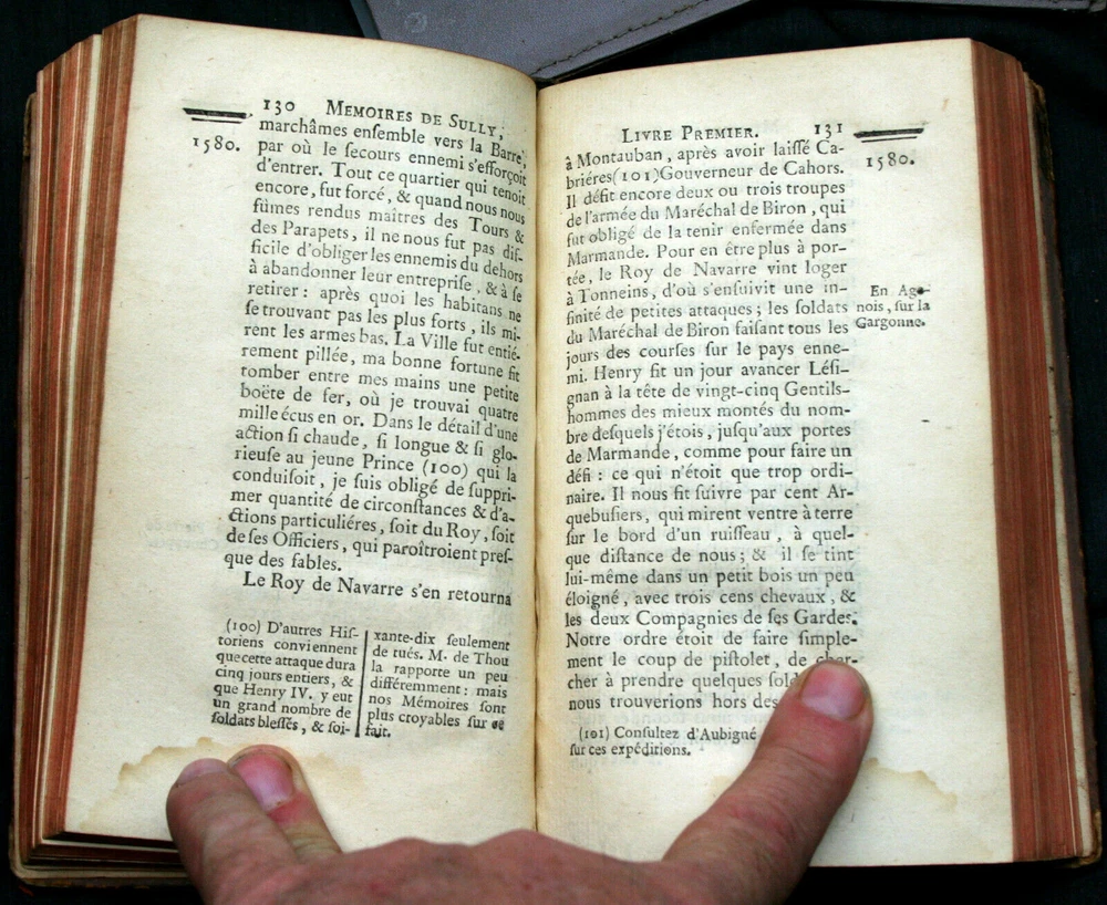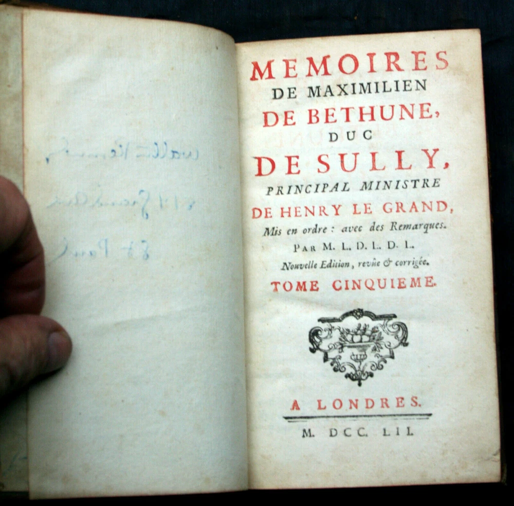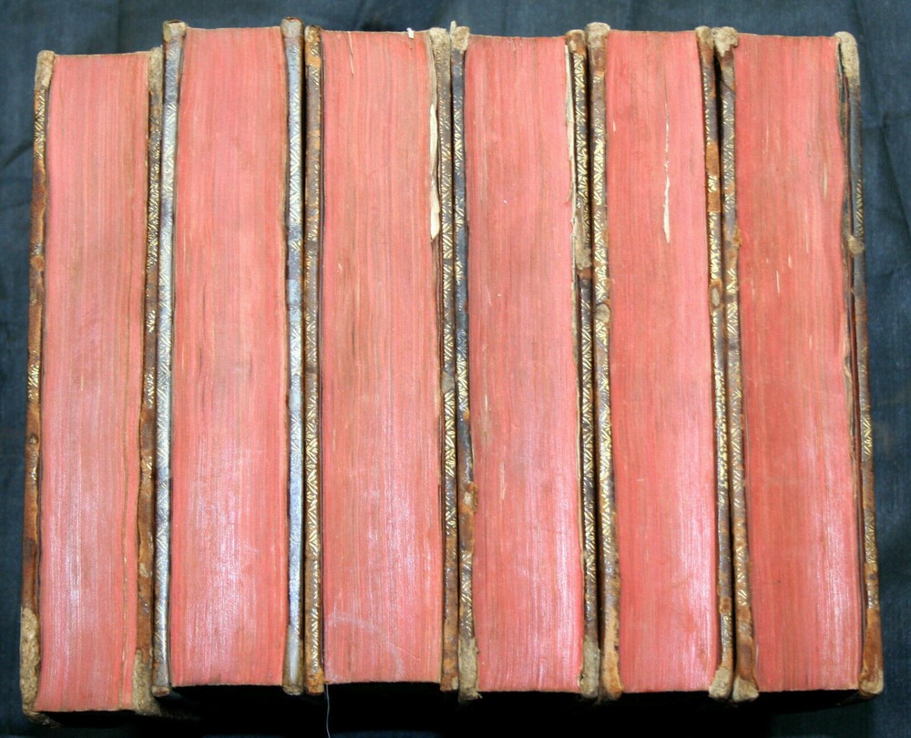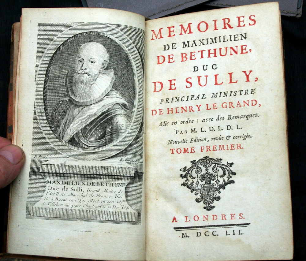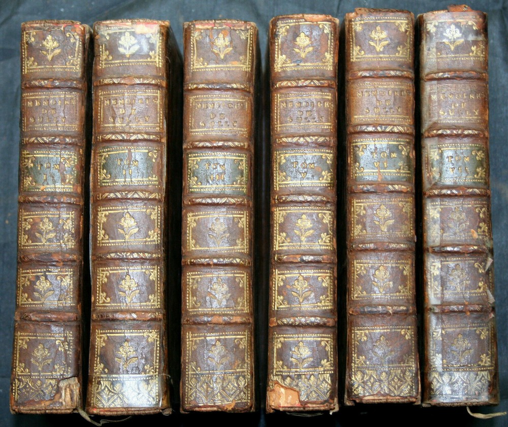 Fair to good anitquarian condition, lacking volumes 4 and 8. High rag paper shows some tide marks and occasional foxing. Some provenance on the FFEP, imported after WWII by a private citizen. Edges are worn, in some cases completely. Marking ribbons frayed and shortened to various lengths over the centuries. Marbled endpapers. A "new edition" in French, printed in London in 1752. Wood cut portrait of the Duc on the frontis of vol. 1. Most previous owner's bookplate on several volumes. Top Edge Gilt. Leather has been conditioned. Some of the gilt titling remains. Tightly sewn. Some crude repairs. Authored by M.L.D.L.D.L., i.e. Pierre Mathurin de L'Ecluse des Loges, Sully Maximilien de Bethune Duc. Henri IV, (Henry le Grand) unified France after the religious wars in Europe tore it asunder, and Duke Sully was his Prime Minister, pretty much entirely responsible for the execution of a re-organization of France under the King. The first parts of the memoirs outline a utopian Europe, divided into 15 separate and equal dominations, 11 monarchies and 4 republics, that shared in the governance of Europe without National rivalry. It took more than five hundred years to begin the formation of the Eurozone forseen in this book. Maximilien de Béthune, first Duke of Sully (13 December 1560 ? 22 December 1641) was the doughty soldier, French minister, staunch Huguenot (Protestant) and faithful right-hand man who assisted king Henry IV of France in the rule of France. Historians emphasize Sully's role in building a strong centralized administrative system in France using coercion and highly effective new administrative techniques. His policies were not original, and most were reversed. Historians have also studied his neo-Stoicism and his ideas about virtue, prudence, and discipline. Clearly the learned in what was to become the United States were familiar with these ideas, in as much as they codified the Constitution of the United States of America to the outline of these documents, especially the notion of equal sub-ordinate members of a unified whole.An important piece of American history, this, having been reintroduced to the intellectual world just before the Revolutionary War. Each volume is roughly the size of a thick paperback novel. We found hundreds of single volumes and several partial sets. No full set this old.