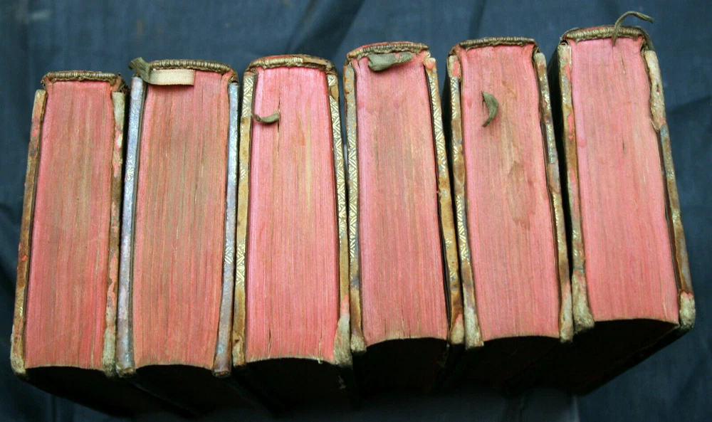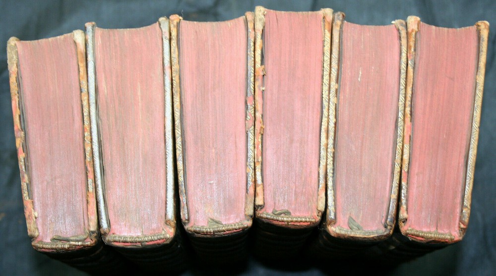 This antique set is a treasure for history lovers! The high rag paper, marbled endpapers, and woodcut portrait give it a classic charm. Though worn with age—missing two volumes, frayed ribbons, and some foxing—it carries fascinating provenance, imported post-WWII. The gilt edges and leather binding still show elegance. Perfect for collectors who appreciate rare, well-loved books with character. Holding these volumes feels like touching the past!
