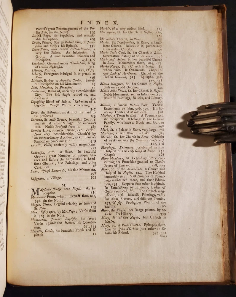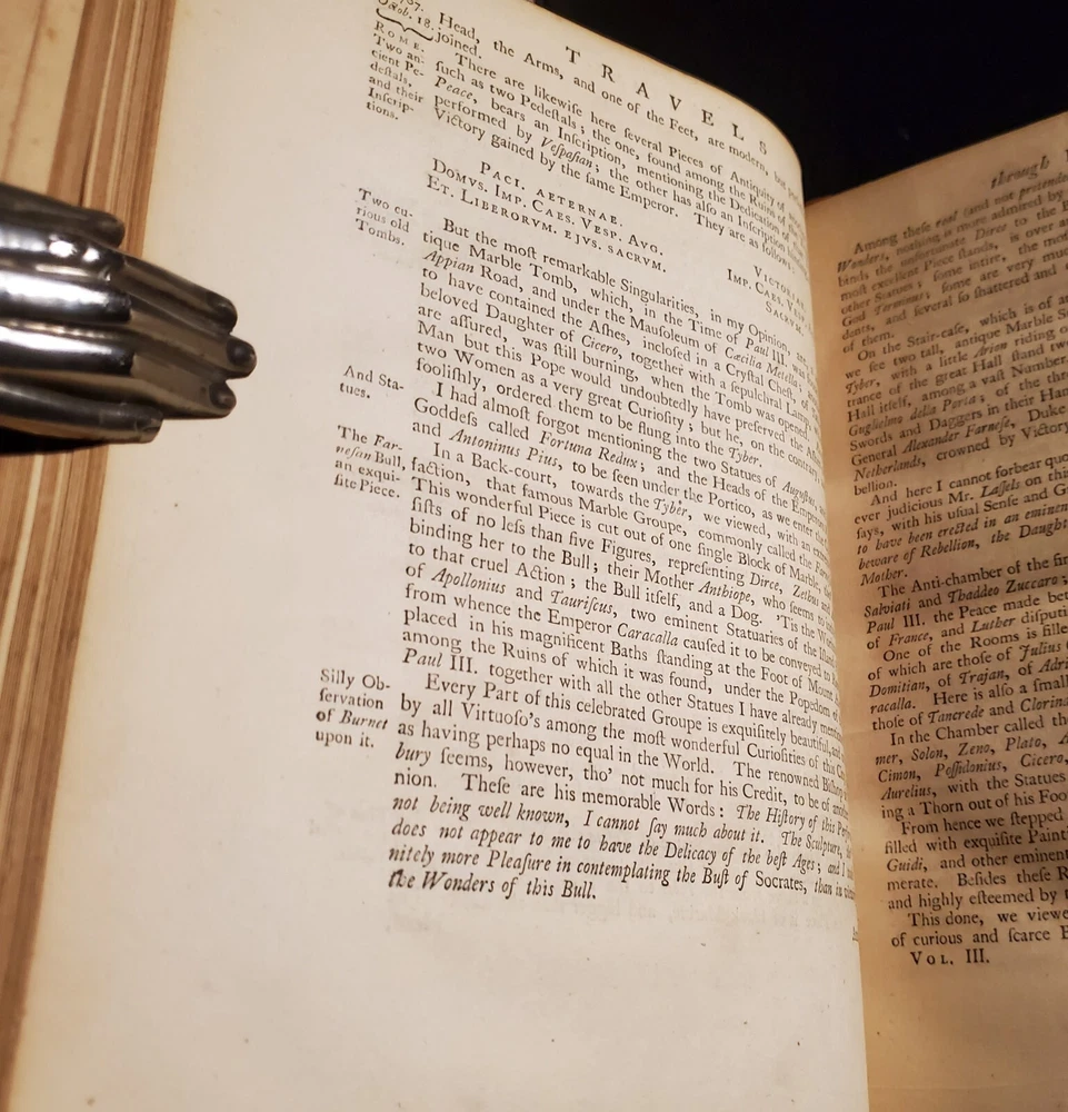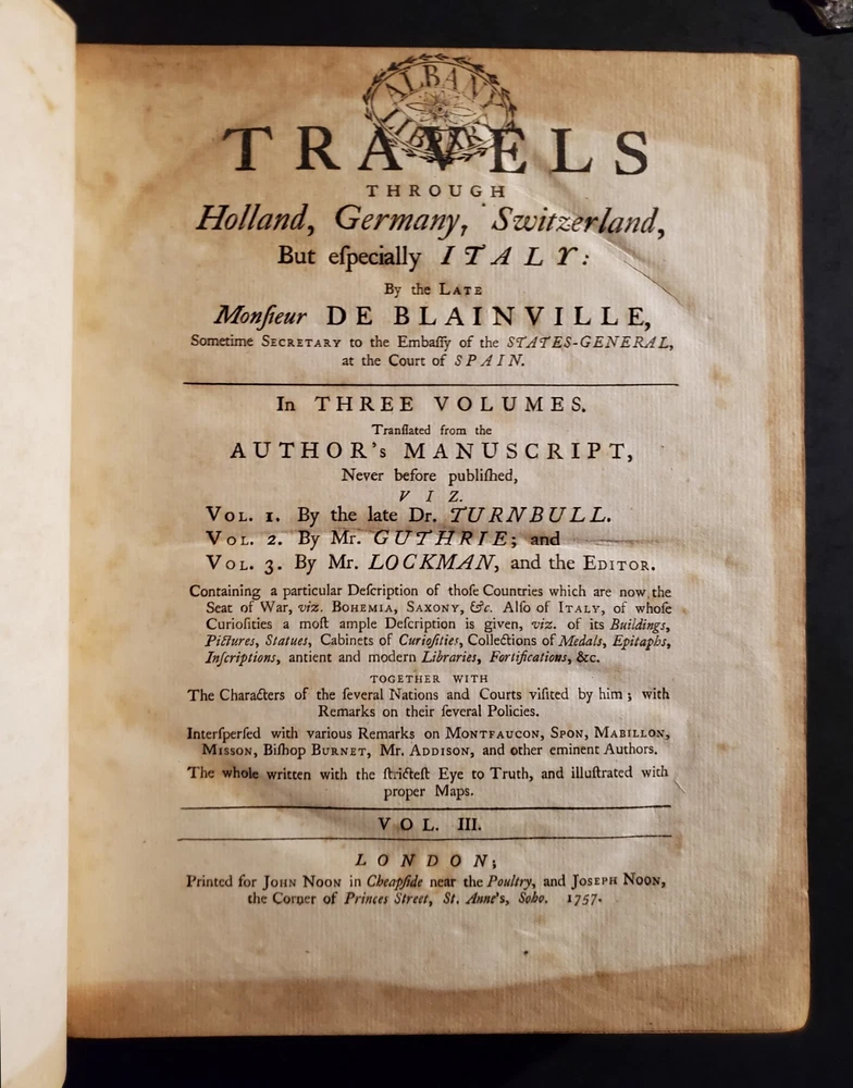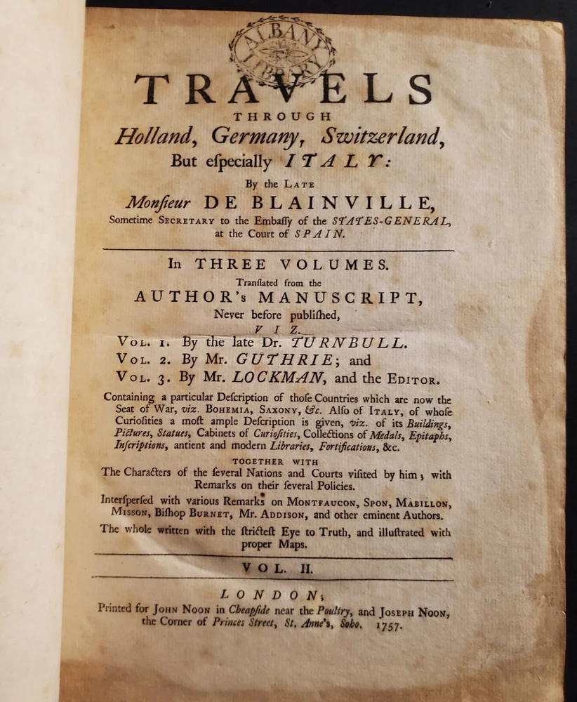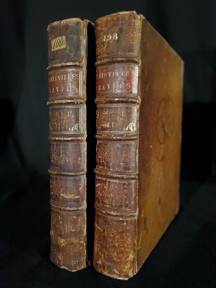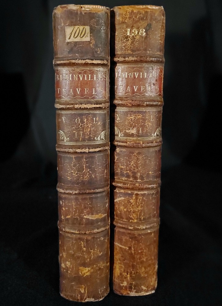 Travels through Holland, Germany, Switzerland: and other parts of Europe; but especially Italy: by the late Monsieur de Blainville, . In three volumes. Translated from the author's manuscript, never before published, viz. Vol.2. By Mr. Guthrie; and Vol.3. By Mr. Lockman, and the editor. [VOLUME II & III) By de Blainville, (J.): Published by printed for John Noon, and Joseph Noon, London, 1757 Bound in original full calf leather. Interior pages clean and bright with some foxing and toning as shown. Some bumping to corners. Shelf wear and rubbing present as shown. Binding and hinges are cracking and fragile, but are still held in-tact. Please see all of our listed photos. . . . . SunRise Rare Books - We ship items world-wide, daily. - Each item is carefully stored and protected in our temperature controlled library. We securely pack each item tightly in cardboard boxes to ensure safe delivery. - Returns accepted within 30 days.