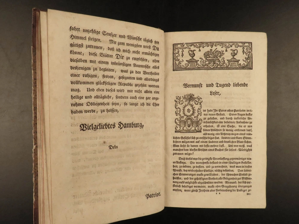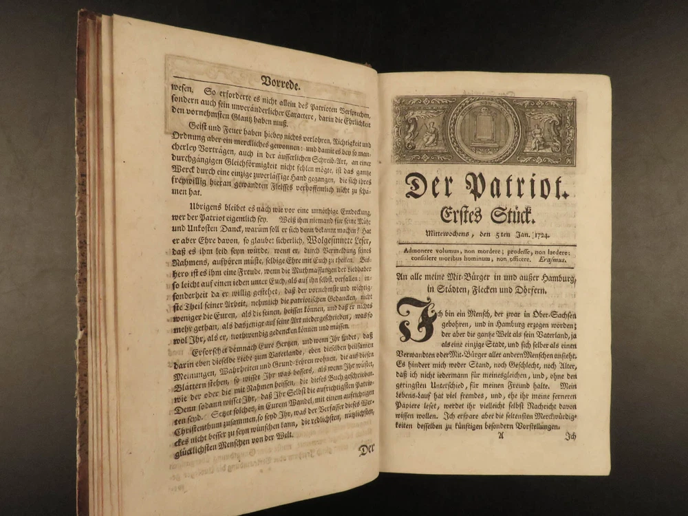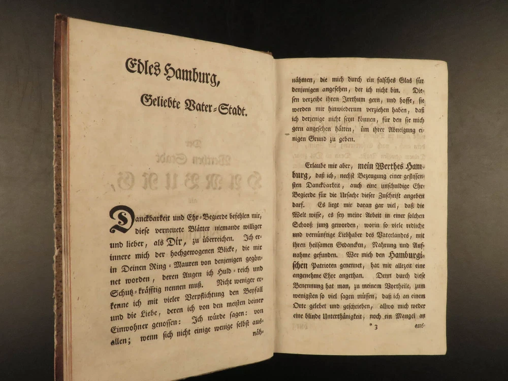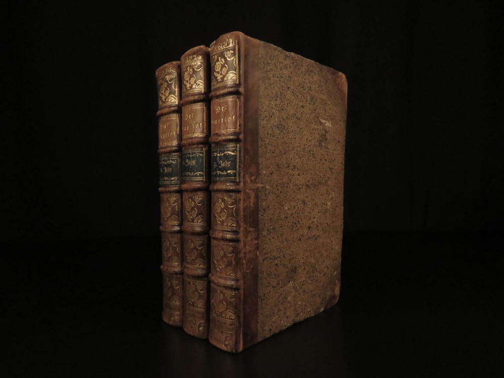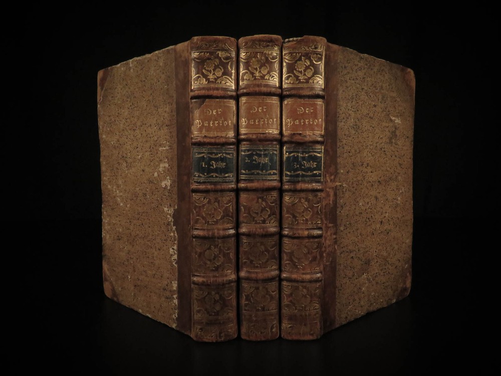 1765 1 st Der Patriot German Patriotic Journal Hamburg Germany Richey 3v SET ‘ Der Patriot’ was an early 18 th -century German journal published in Hamburg, Germany for only three years, 1724-1726. It was a weekly periodical providing information on local society, members, and events of the Patriotic Society. A fourth print run was attempted forty years later in 1765 but it was unable to garner any success and plans for more issues were nixed. This example of the 1765 printing was published in Hamburg and includes three finely-bound tomes. Item number: #17744 Price: $599 RICHEY, Michael Der Patriot Hamburg : Christian Herolds sel. Wittwe, 1765. First edition. Details : · Collation: Complete with all pages – 3 volumes o Vol. 1 – [10], 502, [32] o Vol. 2 – [2], 474, [32] o Vol. 3 – XXIV, 476, [34] · Language: German · Binding: Leather; tight and secure · Size : ~8in X 5in (20cm x 12.5cm) Our Guarantee: Very Fast. Very Safe. Free Shipping Worldwide. Customer satisfaction is our priority! Notify us with 7 days of receiving, and we will offer a full refund without reservation! 1 7744