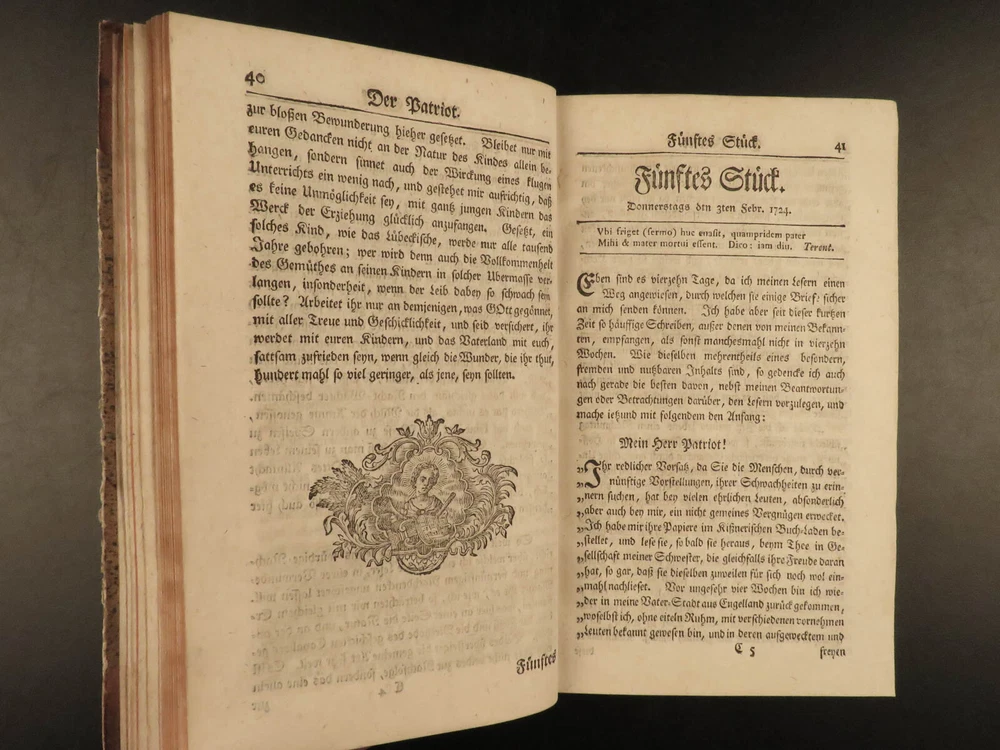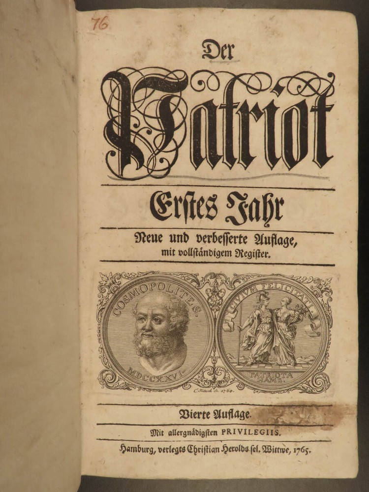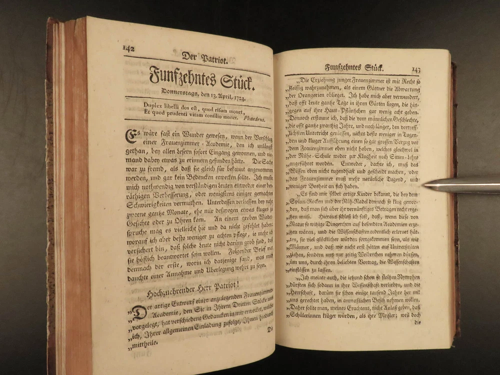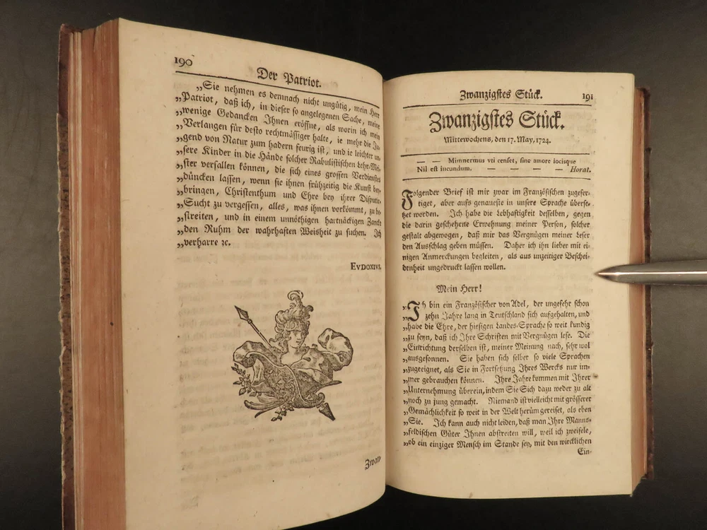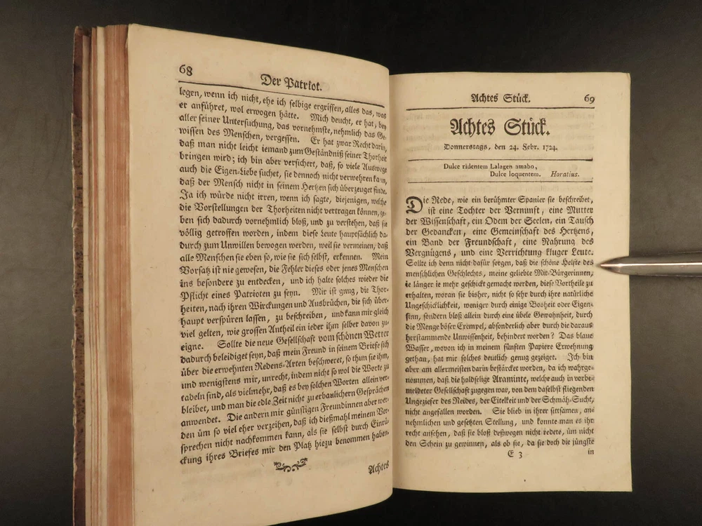 1765 1 st Der Patriot German Patriotic Journal Hamburg Germany Richey 3v SET ‘ Der Patriot’ was an early 18 th -century German journal published in Hamburg, Germany for only three years, 1724-1726. It was a weekly periodical providing information on local society, members, and events of the Patriotic Society. A fourth print run was attempted forty years later in 1765 but it was unable to garner any success and plans for more issues were nixed. This example of the 1765 printing was published in Hamburg and includes three finely-bound tomes. Item number: #17744 Price: $599 RICHEY, Michael Der Patriot Hamburg : Christian Herolds sel. Wittwe, 1765. First edition. Details : · Collation: Complete with all pages – 3 volumes o Vol. 1 – [10], 502, [32] o Vol. 2 – [2], 474, [32] o Vol. 3 – XXIV, 476, [34] · Language: German · Binding: Leather; tight and secure · Size : ~8in X 5in (20cm x 12.5cm) Our Guarantee: Very Fast. Very Safe. Free Shipping Worldwide. Customer satisfaction is our priority! Notify us with 7 days of receiving, and we will offer a full refund without reservation! 1 7744