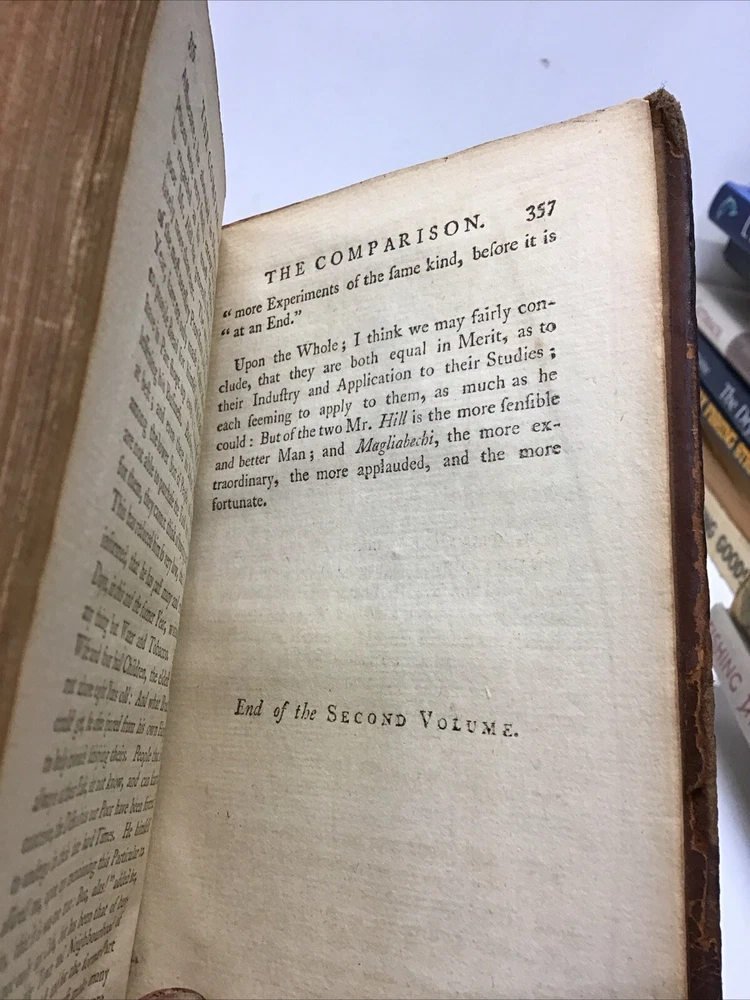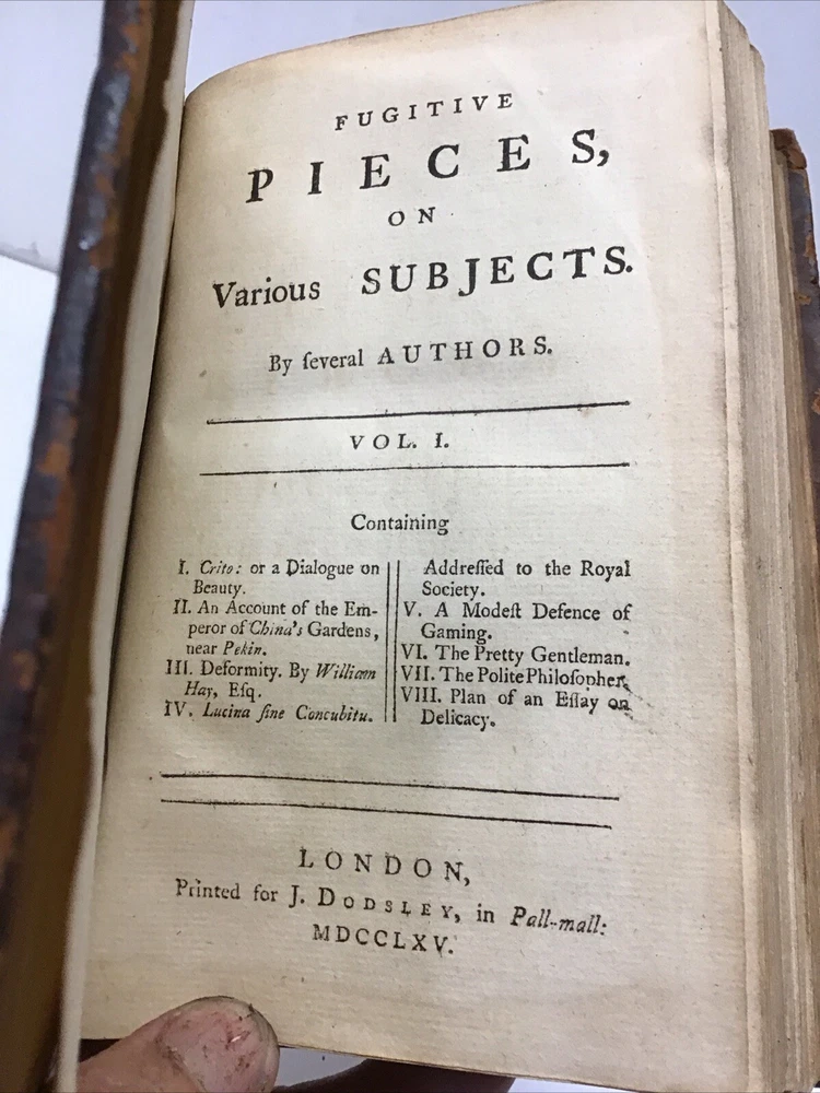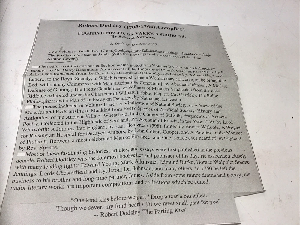 This 2-volume set of "Fugitive Pieces" by various authors is a must-have for any collector of antique books. Published in 1765 by J. Dodsley in London, these leather/hardcover books are in English language and cover a range of topics. The books are perfect for anyone interested in sets and will make a great addition to any collection. The binding of these books is stiff but intact and the pages are clean without any tears or folds. The author has done a great job of collecting and organizing the information in a logical manner. Overall, this is a fantastic set of books that any antique book collector will love. 1765 Fugitive Pieces on Various Subjects 2 Volumes Set, Robert Dodsley Fugitive Pieces, on Various Subjects. By several Authors. I. Crito: or a Dialogue on Beauty. II. An Account of the Emperor of China's Gardens, near Pekin. III. Deformity. By William Hay, Esq. IV. Lucina sine Concubitu. Address to the Royal Society. V. A Modest Defence of Gaming. Vi. The Pretty Gentleman. VII. The Polite Philosopher. VIII. Plan of an Essay on Delicacy. [Volume I] I. A Vindication of Natural Society. II. History and Antiquities of the Ancient Villa of Wheatfield. III. Fragments of ancient Poetry, collected in the Highlands of Scotland. IV. An Account of Russia, in the Year 1710. V. A Journey into England. By Paul Hentzner, in the Year 1598. VI. A Project for raising an Hospital for decayed Authors. VII. A Parallel, in the Man [DODSLEY (Robert)], ed. Published by London: Printed for J. Dodsley., 1765 Size 4.7/8” x 7.1/8” 352 & 357 pages. Binding is stiff but intact, separation on cover multiple imperfections as seen in picture being 255+ years old. Bookplate of Sir Ashton Lever who was a businessman and collector; friend of Captain James Cook. His property included coal mines and Manchester real estate; had a great interest in ornithology. In the 1760s and 1770s, acquired an enormous collection of birds and other natural history. He also collected ethnographical material, owning the largest group of objects brought back by Cook's expeditions. Keep in mind the shipping price also covers handling fees, packaging materials & time, not just postage. See our eBay store for thousands of our other items. B12D