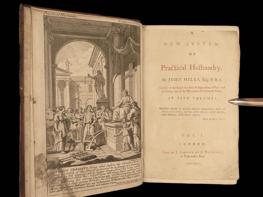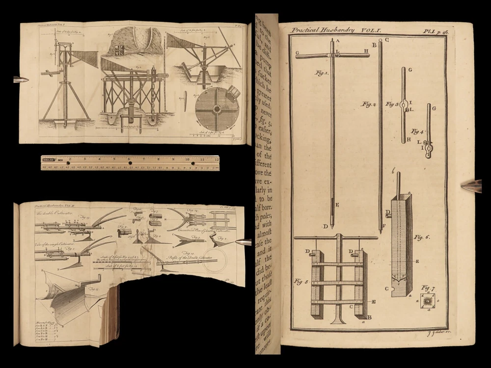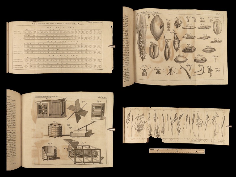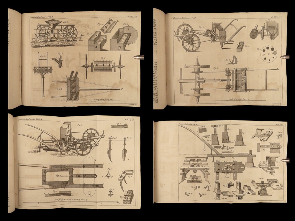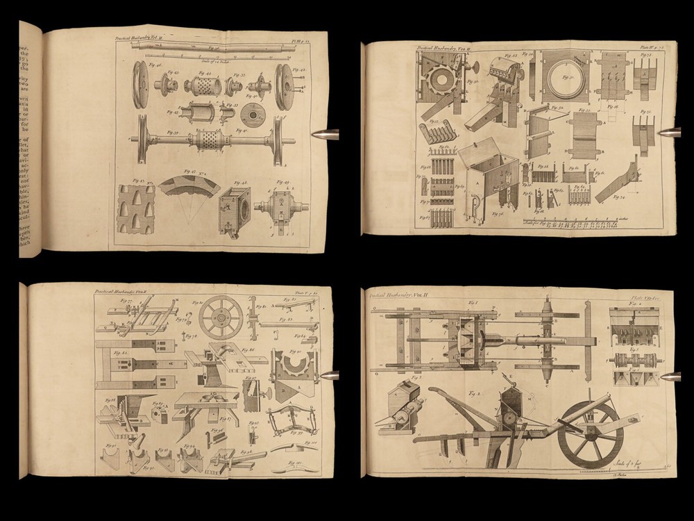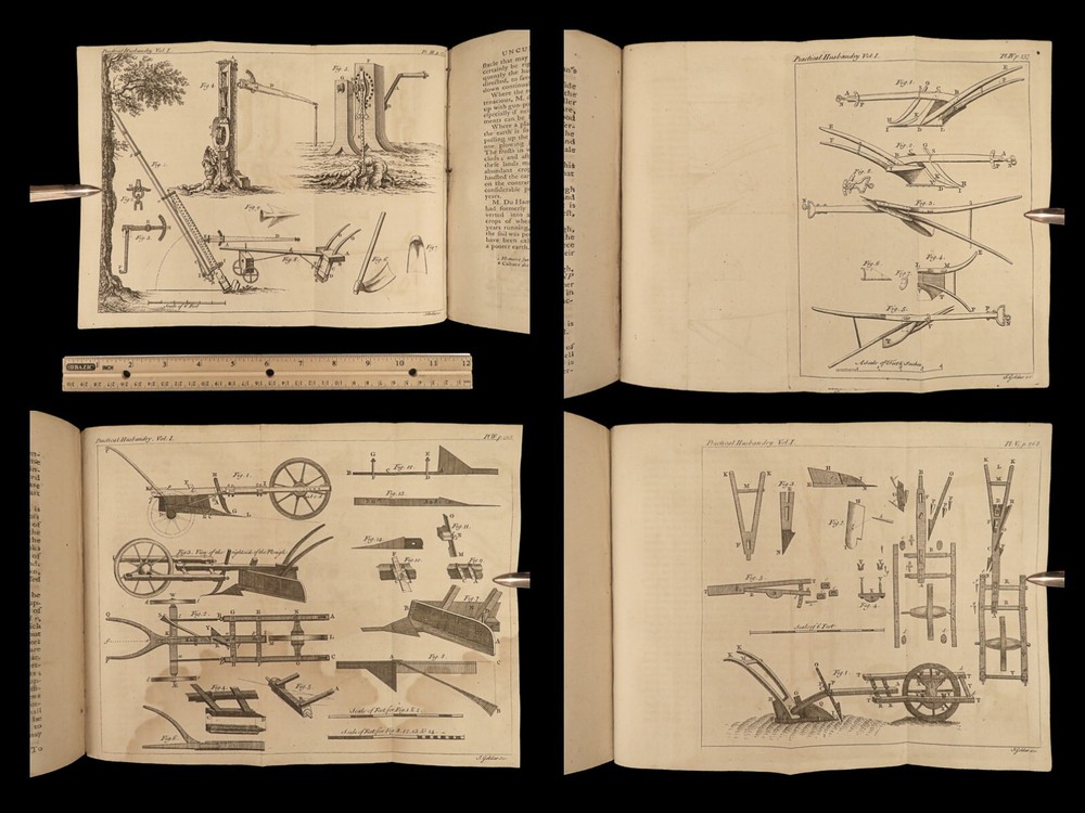 1767 Husbandry FARMING Horses BEER Wine Horseshoes Mills 5v SET John Adams USA John Mills’s “ Practical Husbandry ” is a thorough survey on farming and rural life. Mills offers direction producing strong soils for plant growth, cultivating the land, farming tools and plows, shoeing horses, fermenting beers and wine, harvesting fruits and vegetables, and so much more. This impressive five-volume set is known to have been in the library of famous founding fathers, including John Adams! This 1676 edition includes numerous full-page and folding engravings! Item number: #25966 Price: $750 MILLS, John A new and complete system of practical husbandry London: printed for J. Johnson and B. Davenport, 1767. Details : · Collation: Complete with all pages; 5 volumes o Vol. 1 – [2], xxii, 483, [1] o Vol. 2 – [2], xv, [1], 437, [1] o Vol. 3 – [2], xii, 3-466 o Vol. 4 – [2], xii, 3-465, [1] o Vol. 5 – [2], v (i.e., xii), 342, xcviii o 20 engravings (most folding; 3 present but incomplete) · Provenance: Handwritten o John J. Robinson, Althorne, 1903 o James Robinson, Latimer, 1840 · Language: English · Binding: Leather; secure · Size : ~8in x 5.25in (20.5cm x 13.5cm) Our Guarantee: Very Fast. Very Safe. Free Shipping Worldwide. Customer satisfaction is our priority! Notify us with 7 days of receiving, and we will offer a full refund without reservation! 25966