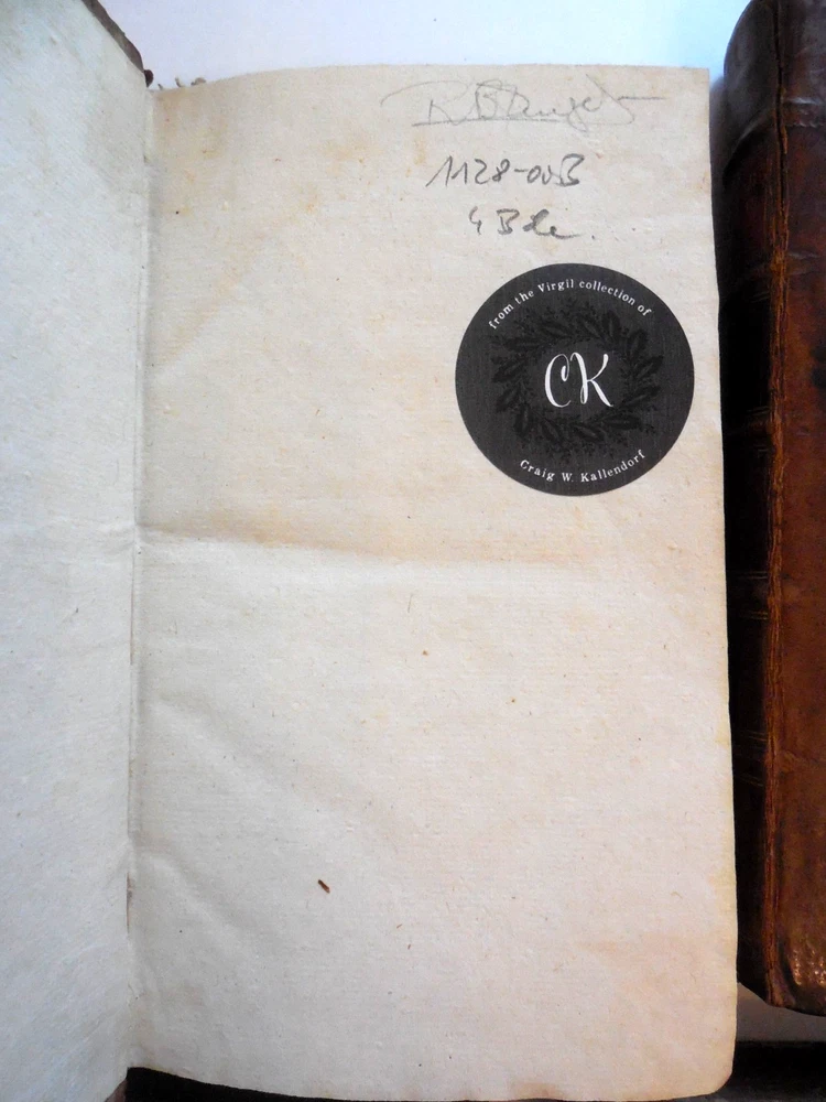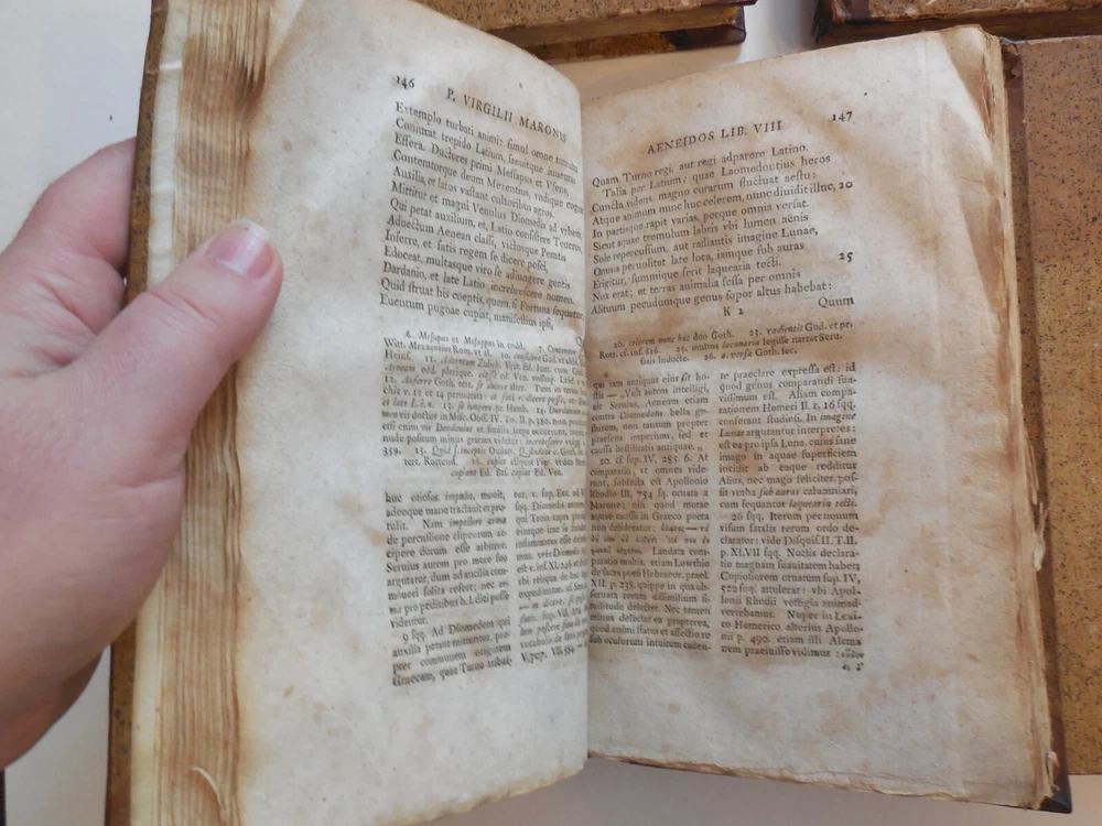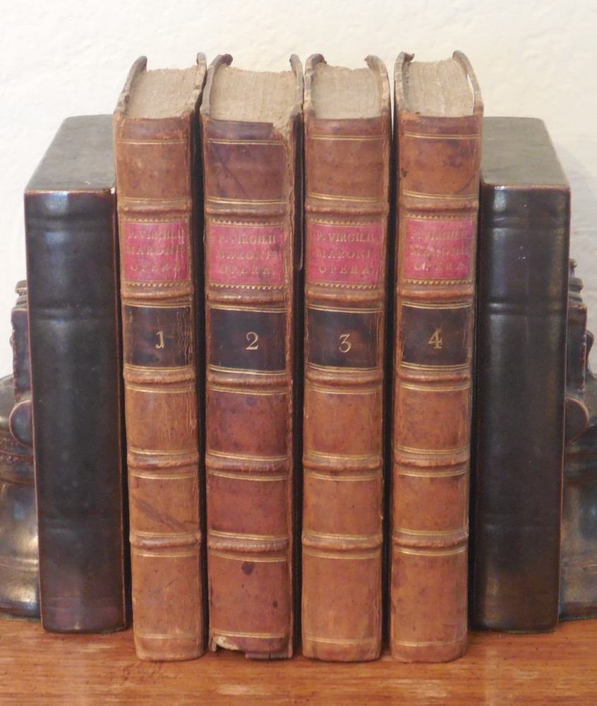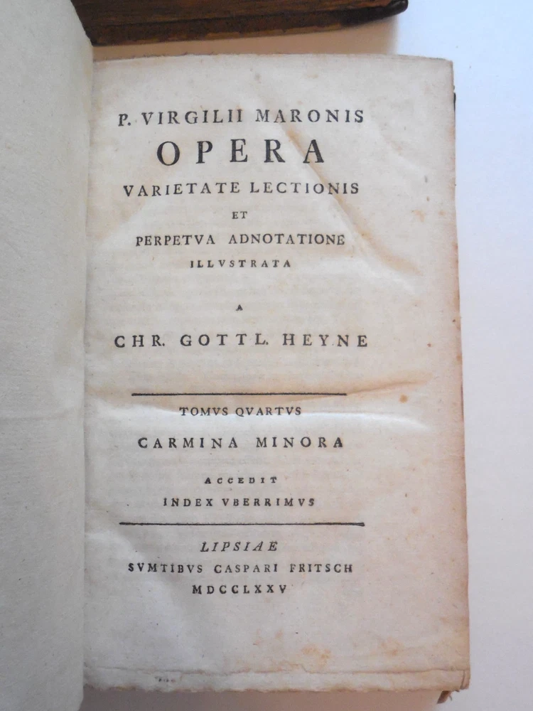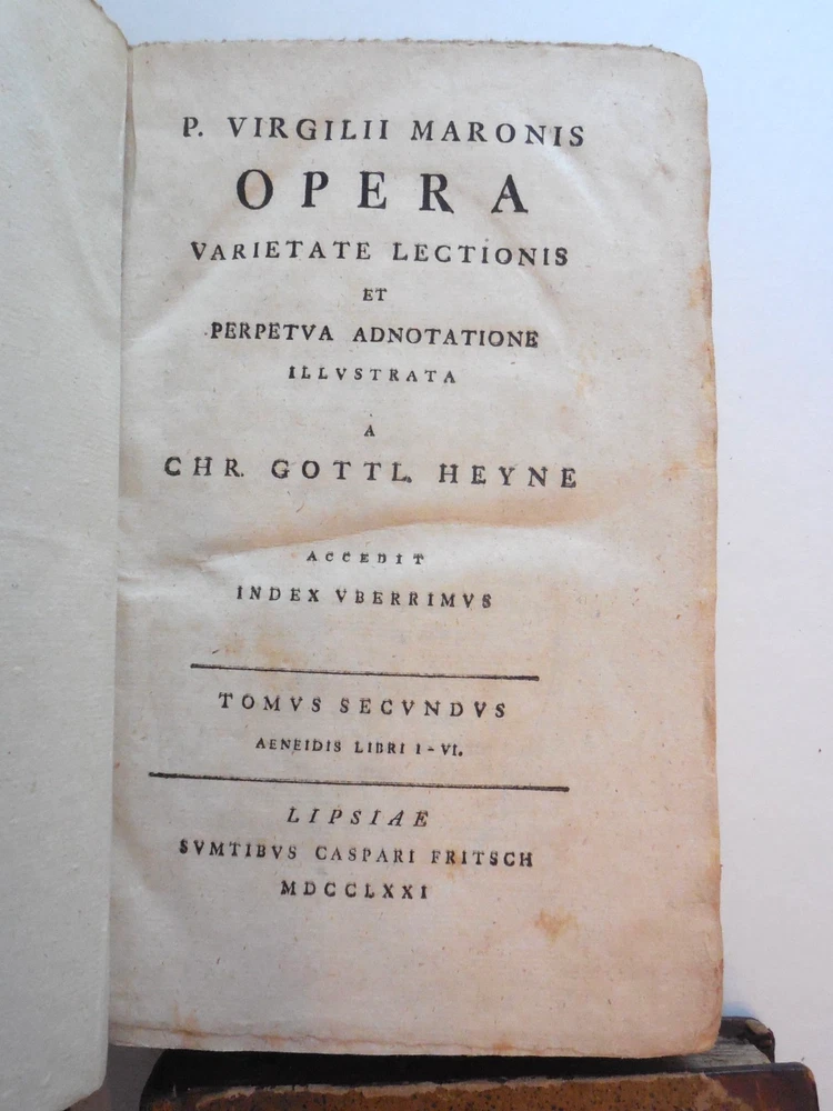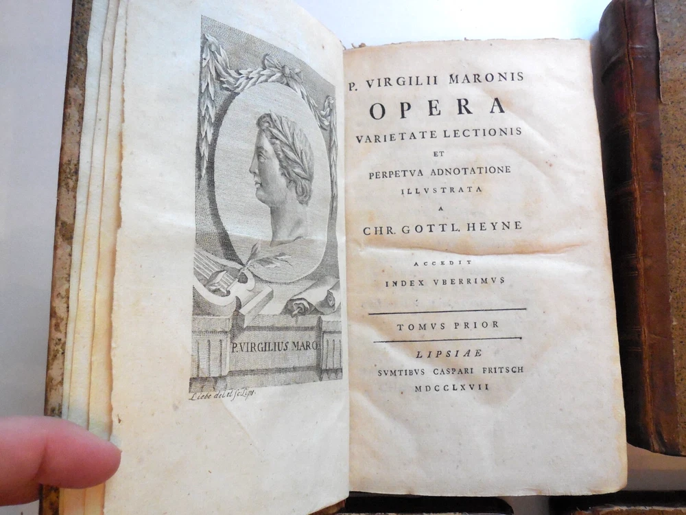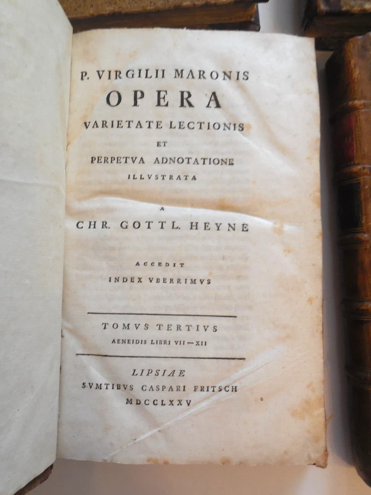 "P. Virgilii Maronis Opera Varietate Lectionis Et Perpetua Adnotatione Illustrata A Chr. Gottl Heyne. Published in 1767 by Caspar Fritsch, as far as I can tell. 4-Volume set. Quarter leather binding. These books belonged to Craig Kallendorf, the noted Virgil scholar and professor at Texas A&M University, and both have his sticker in them. One is shown in the 6th picture. I am not an expert on antiquarian books. They are in very decent condition for their age, but well used and showing wear. The leather portion is in good condition, showing some wear. The hardcover portion of the covers all show varying damage, as shown in the 4th and 5th pictures, although they are all in good structural condition. Pages are tanned and have some staining. The pages are somewhat wavy and soft - I wonder if they got wet at some point in the past. They are not stiff, though. Please see the last picture. Will be shipped with Signature Confirmation required. We can ship only to the name and address provided by eBay. Thank you!