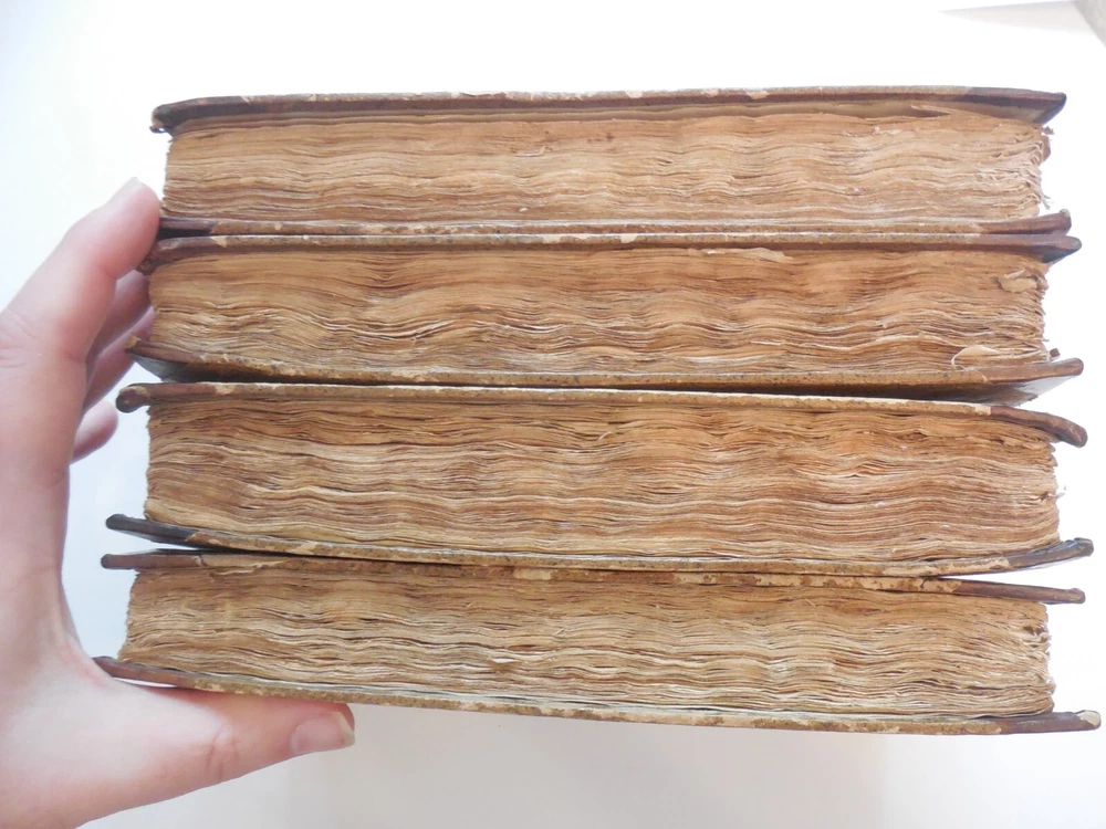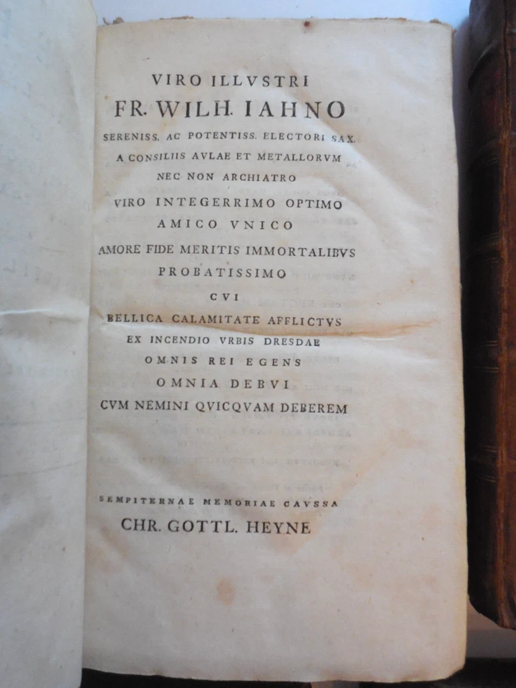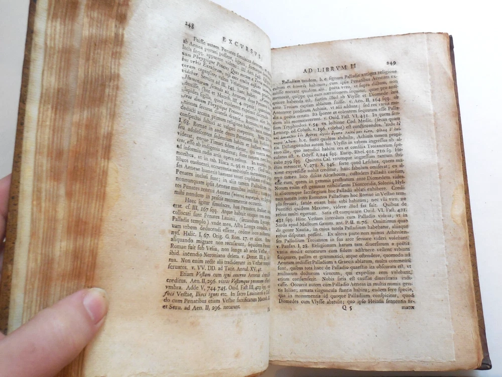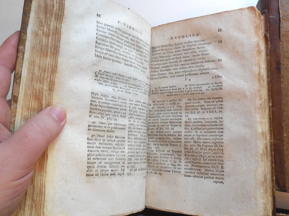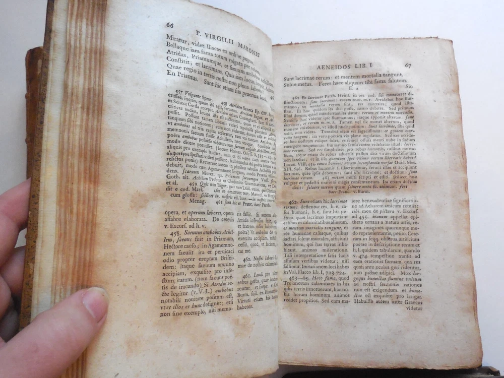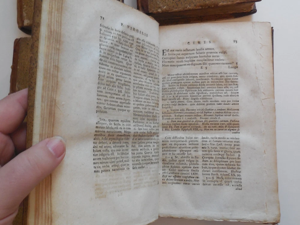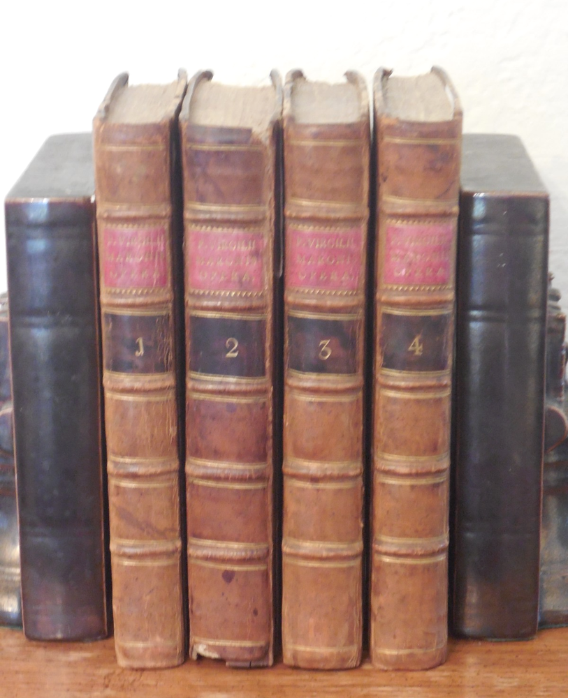 "P. Virgilii Maronis Opera Varietate Lectionis Et Perpetua Adnotatione Illustrata A Chr. Gottl Heyne. Published in 1767 by Caspar Fritsch, as far as I can tell. 4-Volume set. Quarter leather binding. These books belonged to Craig Kallendorf, the noted Virgil scholar and professor at Texas A&M University, and both have his sticker in them. One is shown in the 6th picture. I am not an expert on antiquarian books. They are in very decent condition for their age, but well used and showing wear. The leather portion is in good condition, showing some wear. The hardcover portion of the covers all show varying damage, as shown in the 4th and 5th pictures, although they are all in good structural condition. Pages are tanned and have some staining. The pages are somewhat wavy and soft - I wonder if they got wet at some point in the past. They are not stiff, though. Please see the last picture. Will be shipped with Signature Confirmation required. We can ship only to the name and address provided by eBay. Thank you!