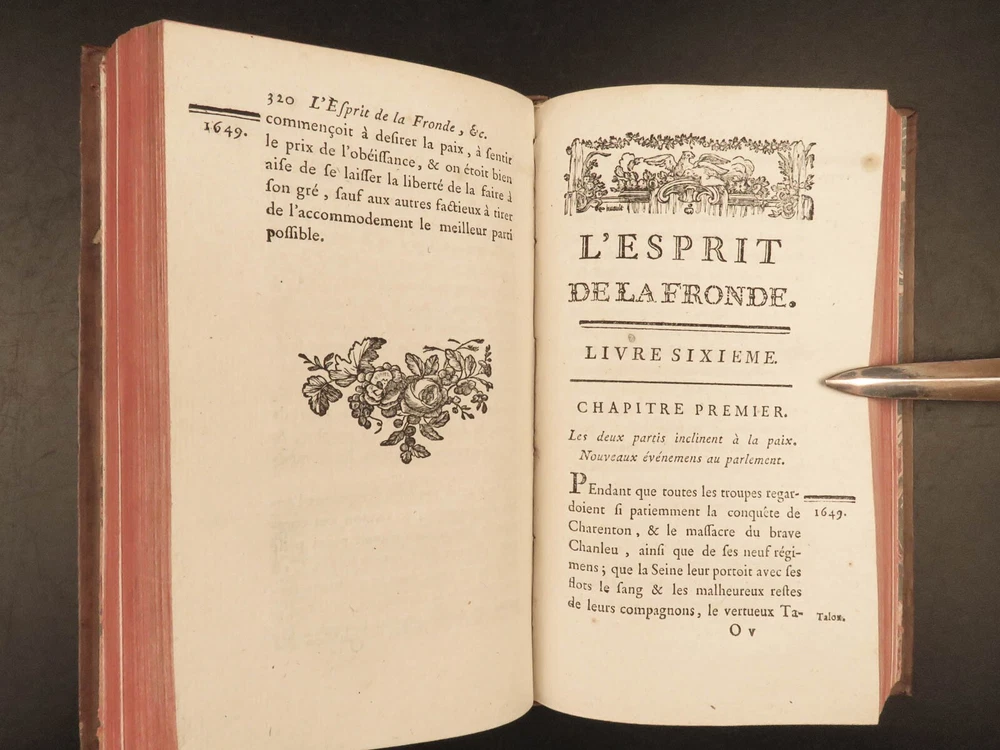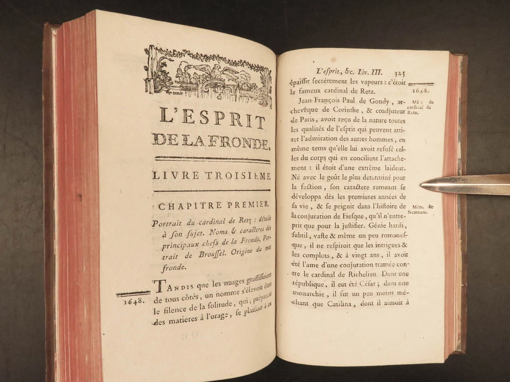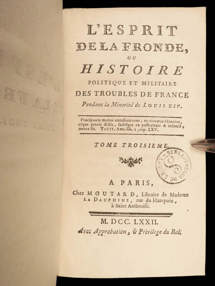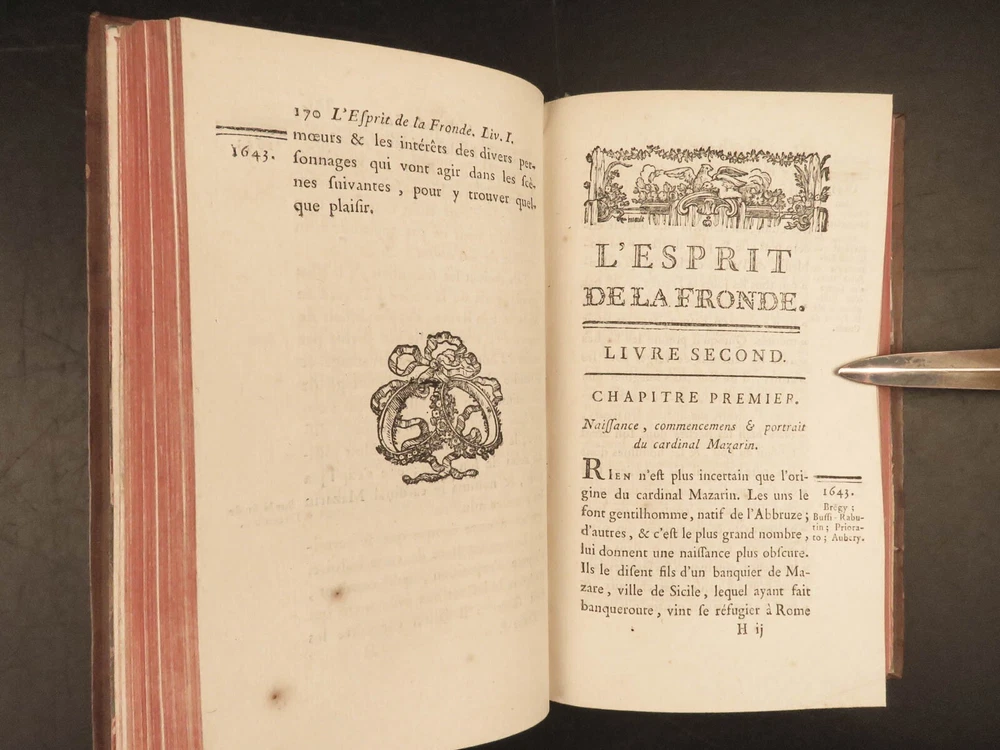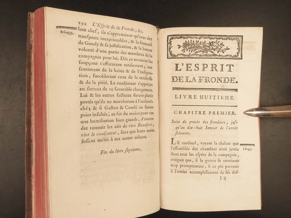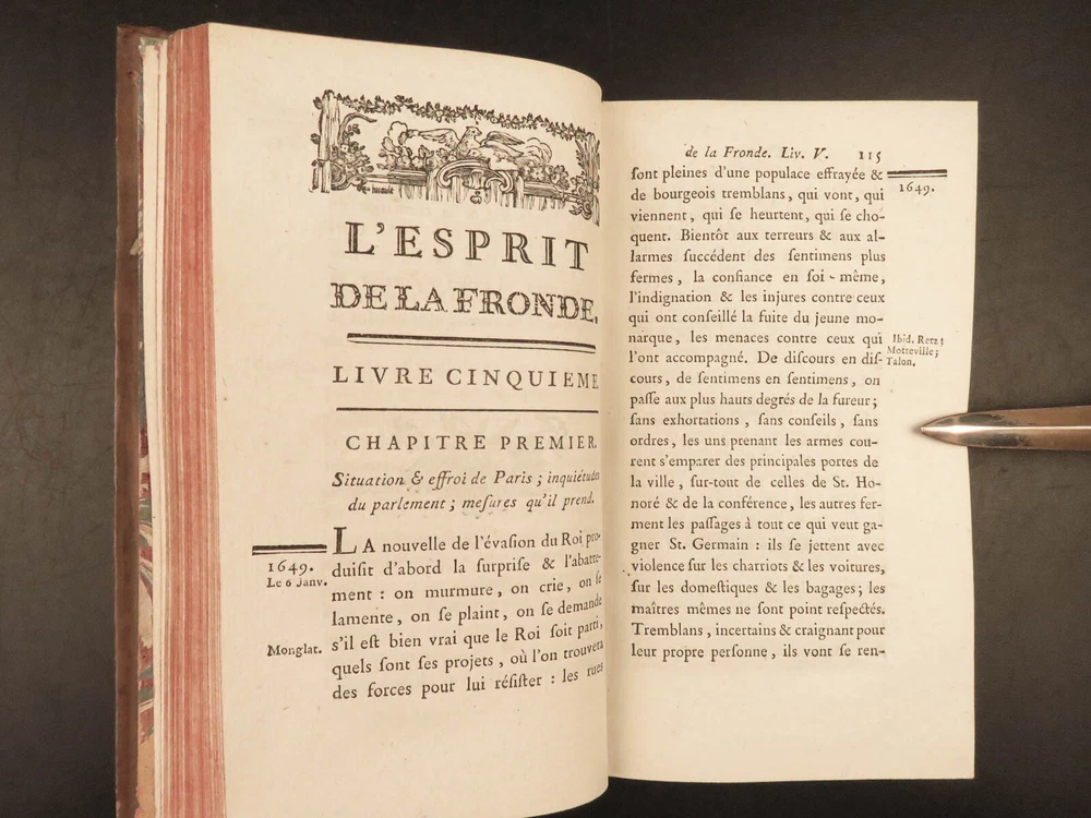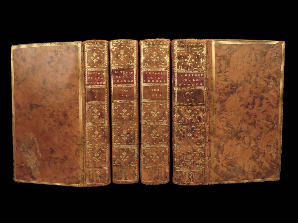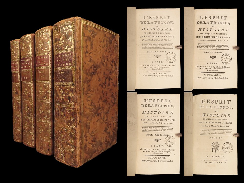 1772 History of The FRONDE 1 ed French Civil Wars SPAIN Pyrenees Mailly 4v SET During the mid-1600s, a series of civil wars erupted in France during the height of the Franco-Spanish War. This time period, which lasted for only five years during the reign of Louis XIV, has become known as The Fronde. These wars, most of which were spear-headed by the king himself, helped establish what would become an the absolute monarchy in France. Author Jean Baptiste Mailly wrote one of the best accounts of the history of The Fronde providing details on Louis XIV’s commands, as well as the struggles of the Spanish Empire against France, and the influence of the English military in the successes of the French throne and the Peace of the Pyrenees. Item number: #25768 Price: $599 MAILLY, Jean Baptiste L'Esprit de la Fronde, ou histoire politique et militaire des troubles de France pendant la minorité de Louis XIV A Paris: chez Moutard, 1772-73. First edition. Details : · Collation: Complete with all pages; 4 volumes o Vol. I – lxii, 63-482 o Vol. II – 592, [4] o Vol. III – [4], 684, vii, [1] o Vol. IV – 801, [3] · Language: French · Binding: Leather; tight and secure · Size : ~6.75in X 4in (17cm x 10cm) Our Guarantee: Very Fast. Very Safe. Free Shipping Worldwide. Customer satisfaction is our priority! Notify us with 7 days of receiving, and we will offer a full refund without reservation! 25768