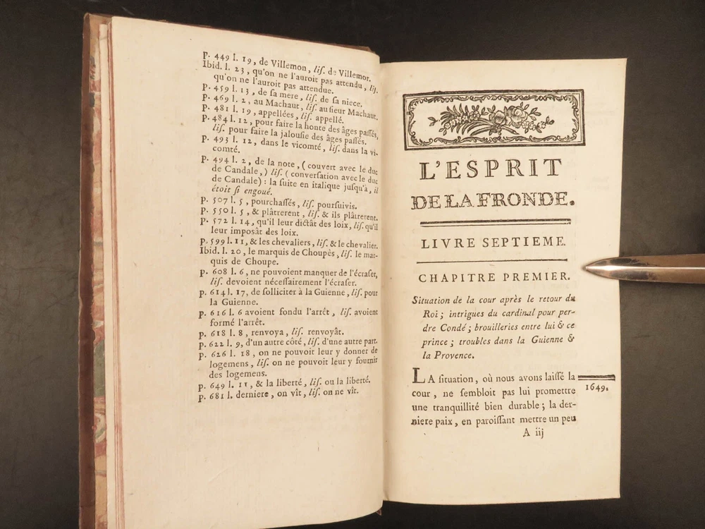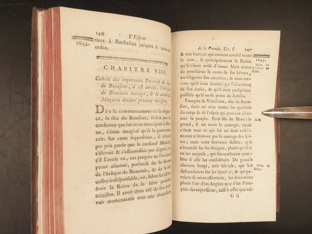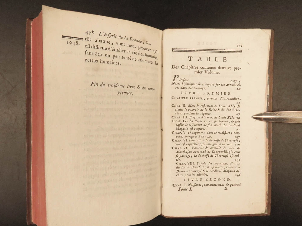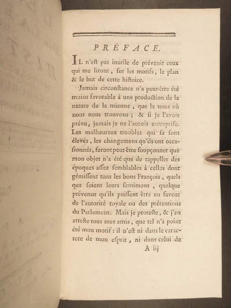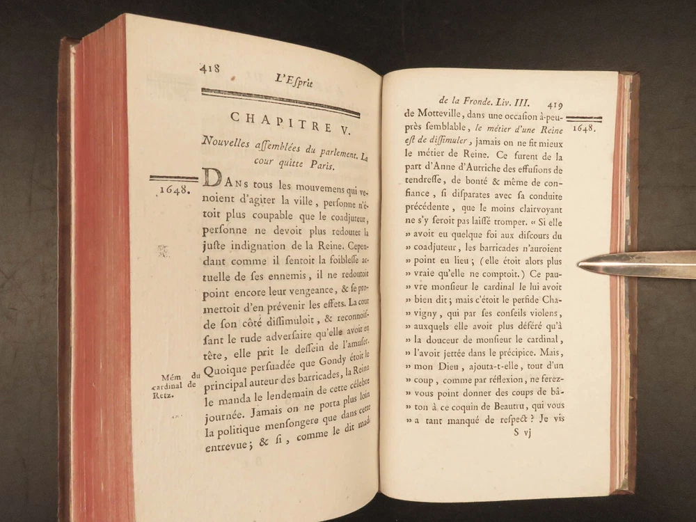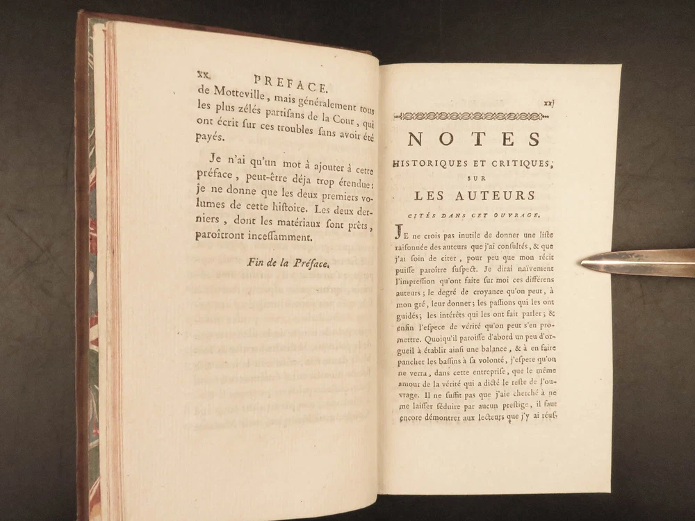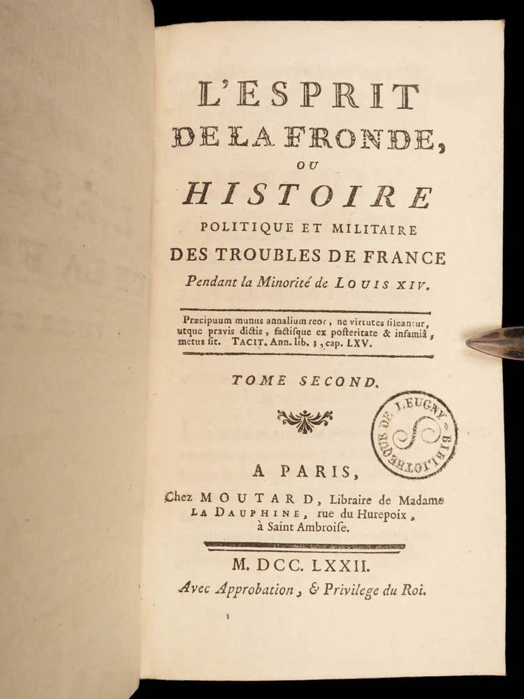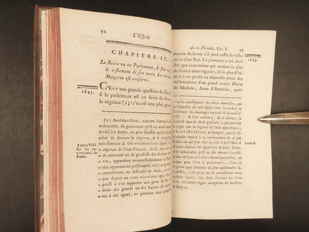 1772 History of The FRONDE 1 ed French Civil Wars SPAIN Pyrenees Mailly 4v SET During the mid-1600s, a series of civil wars erupted in France during the height of the Franco-Spanish War. This time period, which lasted for only five years during the reign of Louis XIV, has become known as The Fronde. These wars, most of which were spear-headed by the king himself, helped establish what would become an the absolute monarchy in France. Author Jean Baptiste Mailly wrote one of the best accounts of the history of The Fronde providing details on Louis XIV’s commands, as well as the struggles of the Spanish Empire against France, and the influence of the English military in the successes of the French throne and the Peace of the Pyrenees. Item number: #25768 Price: $599 MAILLY, Jean Baptiste L'Esprit de la Fronde, ou histoire politique et militaire des troubles de France pendant la minorité de Louis XIV A Paris: chez Moutard, 1772-73. First edition. Details : · Collation: Complete with all pages; 4 volumes o Vol. I – lxii, 63-482 o Vol. II – 592, [4] o Vol. III – [4], 684, vii, [1] o Vol. IV – 801, [3] · Language: French · Binding: Leather; tight and secure · Size : ~6.75in X 4in (17cm x 10cm) Our Guarantee: Very Fast. Very Safe. Free Shipping Worldwide. Customer satisfaction is our priority! Notify us with 7 days of receiving, and we will offer a full refund without reservation! 25768