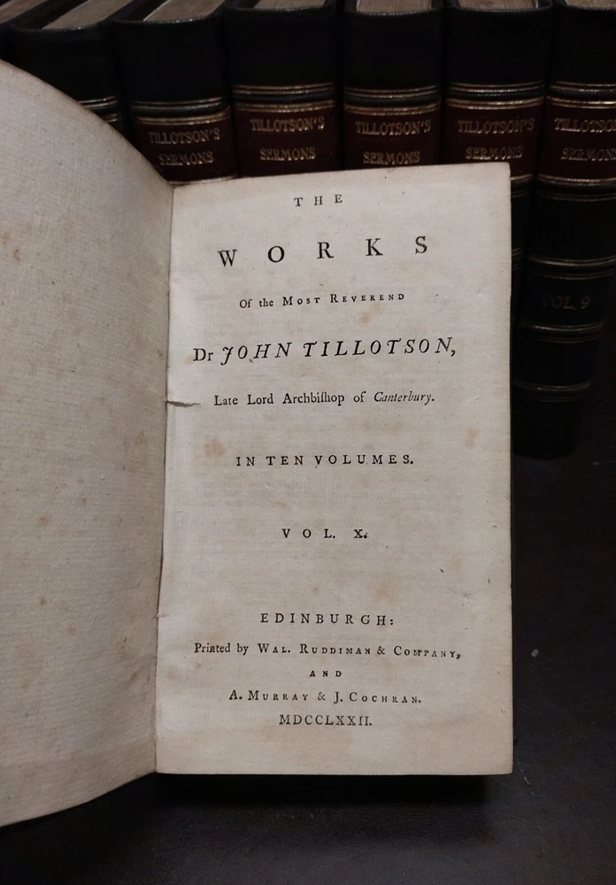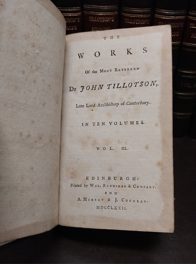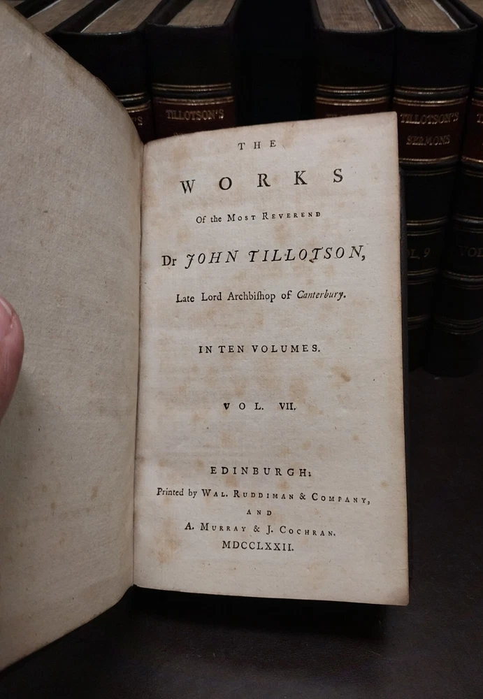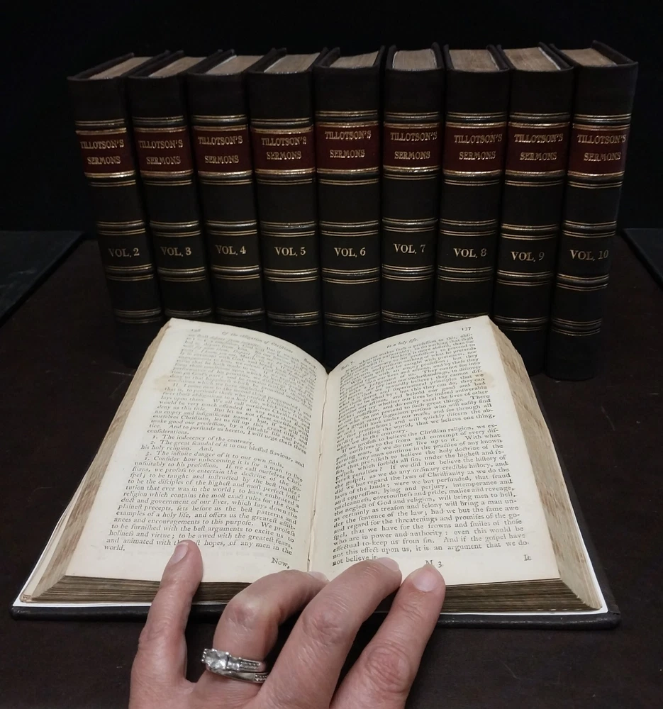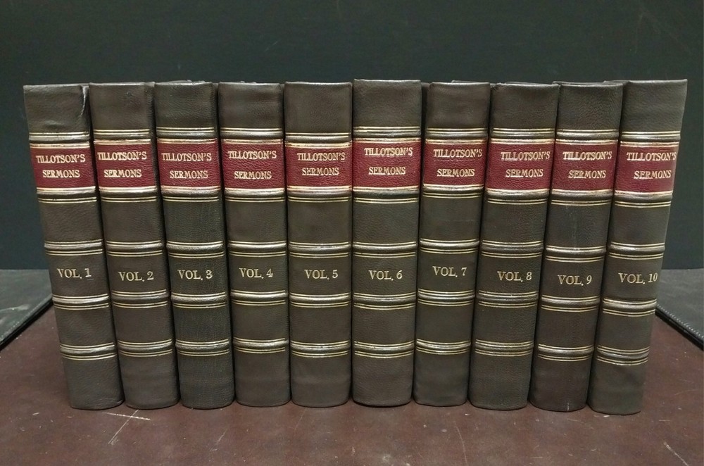 This is a ten volume set of The Works of the Most Reverend Dr John Tillotson, Late Lord Archbishop of Canterbury. John Tillotson (1630-1694), Archbishop of Canterbury. Each volume has been rebound and measures approx. 4.25 in. x 6.75 in and 1 inch thick. Tennessee Bible Museum English Room Tillotson was the son of a Puritan clothier in Sowerby, Yorkshire, where he was born in October 1630. He entered as a pensioner of Clare Hall, Cambridge, in 1647, graduated in 1650 and was made fellow of his college in 1651. About 1661 he was ordained without subscription by T. Sydserf, a Scottish bishop. Tillotson was present at the Savoy Conference in 1661, and remained identified with the Presbyterians till the passing of the Act of Uniformity in 1662. Shortly afterwards he became curate of Cheshunt, Herts and in 1663, rector of Kedington, Suffolk. He now devoted himself to an exact study of biblical and patristic writers, especially Basil and Chrysostom. The result of this reading, and of the influence of John Wilkins, master of Trinity College, Cambridge, was seen in the general tone of his preaching, which was practical rather than theological. In 1664 he became preacher at Lincoln's Inn. The same year he married Elizabeth French. In 1663 he published a characteristic sermon on "The Wisdom of being Religious," and in 1666 replied to John Sergeant's Sure Footing in Christianity by a pamphlet on the "Rule of Faith." The same year he received the degree of D.D. In 1670 he became prebendary and in 1672 dean of Canterbury. In 1675 he edited John Wilkins's Principles of Natural Religion, completing what was left unfinished of it, and in 1682 his Sermons. Along with Burnet, Tillotson attended Lord Russell on the scaffold in 1683. He afterwards enjoyed the friendship of Lady Russell, and it was partly through her that he obtained so much influence with Princess Anne, who followed his advice in regard to the settlement of the crown on William of Orange. He possessed the special confidence of William and Mary, and was made clerk of the closet to the king in March 1689. It was chiefly through his advice that the king appointed an ecclesiastical commission for the reconciliation of the Dissenters. In August of this year he was appointed by the chapter of his cathedral to exercise the archiepiscopal jurisdiction of the province of Canterbury during the suspension of Sancroft. He was also about the same time named dean of St Paul's. Soon afterwards he was elected to succeed Sancroft; but accepted the promotion with extreme reluctance, and it was deferred from time to time, at his request, till April 1691. In 1693 he published four lectures on the Socinian controversy. His attempts to reform certain abuses of the Church, especially that of clerical nonresidence, awakened much ill-will, and of this the Jacobites took advantage, pursuing him to the end of his life with insult and reproach. He died on the 22nd of November 1694.