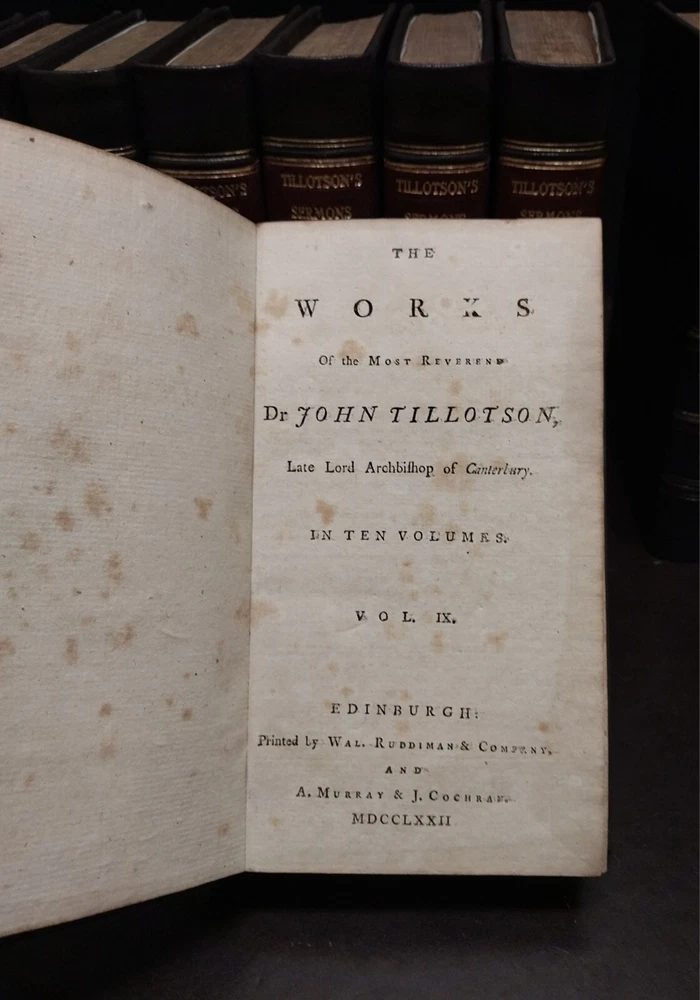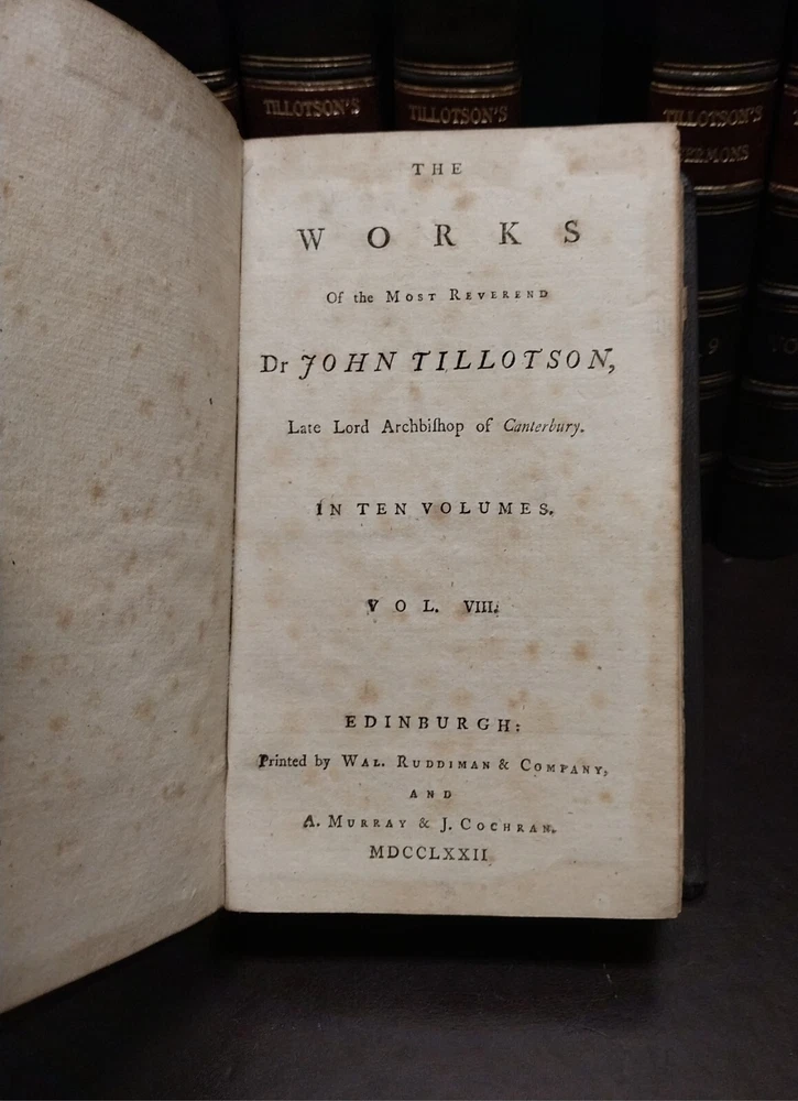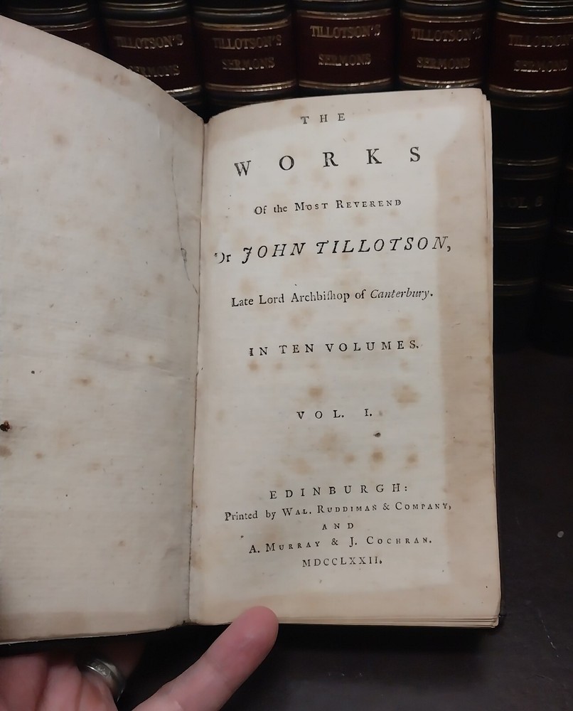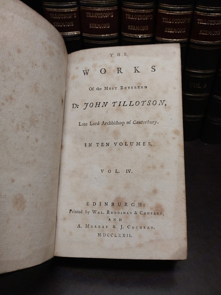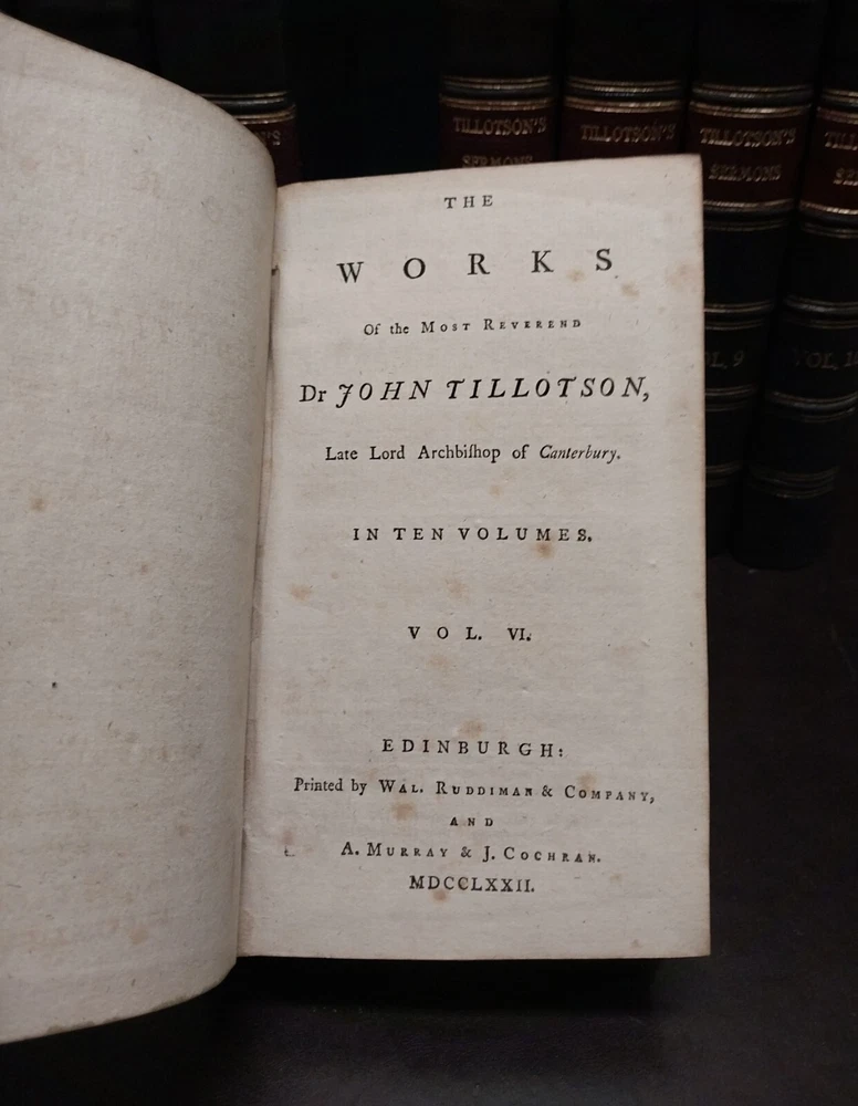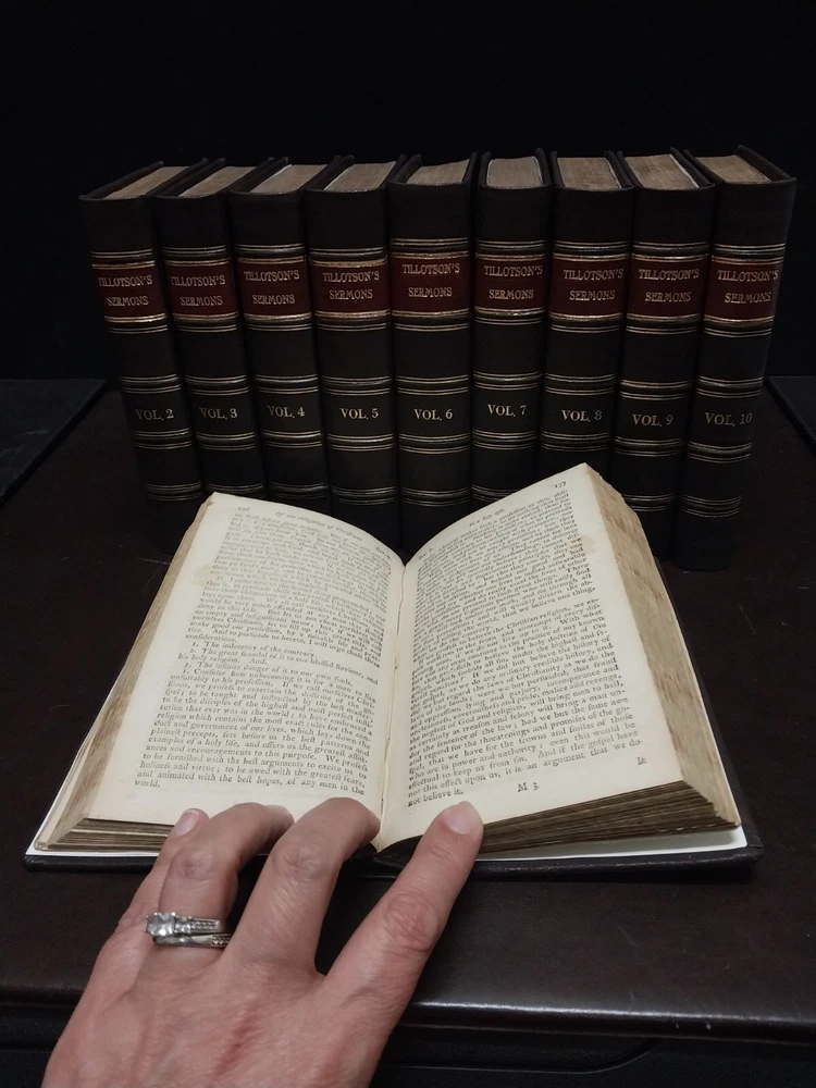 This is a ten volume set of The Works of the Most Reverend Dr John Tillotson, Late Lord Archbishop of Canterbury. John Tillotson (1630-1694), Archbishop of Canterbury. Each volume has been rebound and measures approx. 4.25 in. x 6.75 in and 1 inch thick. Tennessee Bible Museum English Room Tillotson was the son of a Puritan clothier in Sowerby, Yorkshire, where he was born in October 1630. He entered as a pensioner of Clare Hall, Cambridge, in 1647, graduated in 1650 and was made fellow of his college in 1651. About 1661 he was ordained without subscription by T. Sydserf, a Scottish bishop. Tillotson was present at the Savoy Conference in 1661, and remained identified with the Presbyterians till the passing of the Act of Uniformity in 1662. Shortly afterwards he became curate of Cheshunt, Herts and in 1663, rector of Kedington, Suffolk. He now devoted himself to an exact study of biblical and patristic writers, especially Basil and Chrysostom. The result of this reading, and of the influence of John Wilkins, master of Trinity College, Cambridge, was seen in the general tone of his preaching, which was practical rather than theological. In 1664 he became preacher at Lincoln's Inn. The same year he married Elizabeth French. In 1663 he published a characteristic sermon on "The Wisdom of being Religious," and in 1666 replied to John Sergeant's Sure Footing in Christianity by a pamphlet on the "Rule of Faith." The same year he received the degree of D.D. In 1670 he became prebendary and in 1672 dean of Canterbury. In 1675 he edited John Wilkins's Principles of Natural Religion, completing what was left unfinished of it, and in 1682 his Sermons. Along with Burnet, Tillotson attended Lord Russell on the scaffold in 1683. He afterwards enjoyed the friendship of Lady Russell, and it was partly through her that he obtained so much influence with Princess Anne, who followed his advice in regard to the settlement of the crown on William of Orange. He possessed the special confidence of William and Mary, and was made clerk of the closet to the king in March 1689. It was chiefly through his advice that the king appointed an ecclesiastical commission for the reconciliation of the Dissenters. In August of this year he was appointed by the chapter of his cathedral to exercise the archiepiscopal jurisdiction of the province of Canterbury during the suspension of Sancroft. He was also about the same time named dean of St Paul's. Soon afterwards he was elected to succeed Sancroft; but accepted the promotion with extreme reluctance, and it was deferred from time to time, at his request, till April 1691. In 1693 he published four lectures on the Socinian controversy. His attempts to reform certain abuses of the Church, especially that of clerical nonresidence, awakened much ill-will, and of this the Jacobites took advantage, pursuing him to the end of his life with insult and reproach. He died on the 22nd of November 1694.