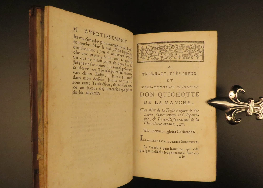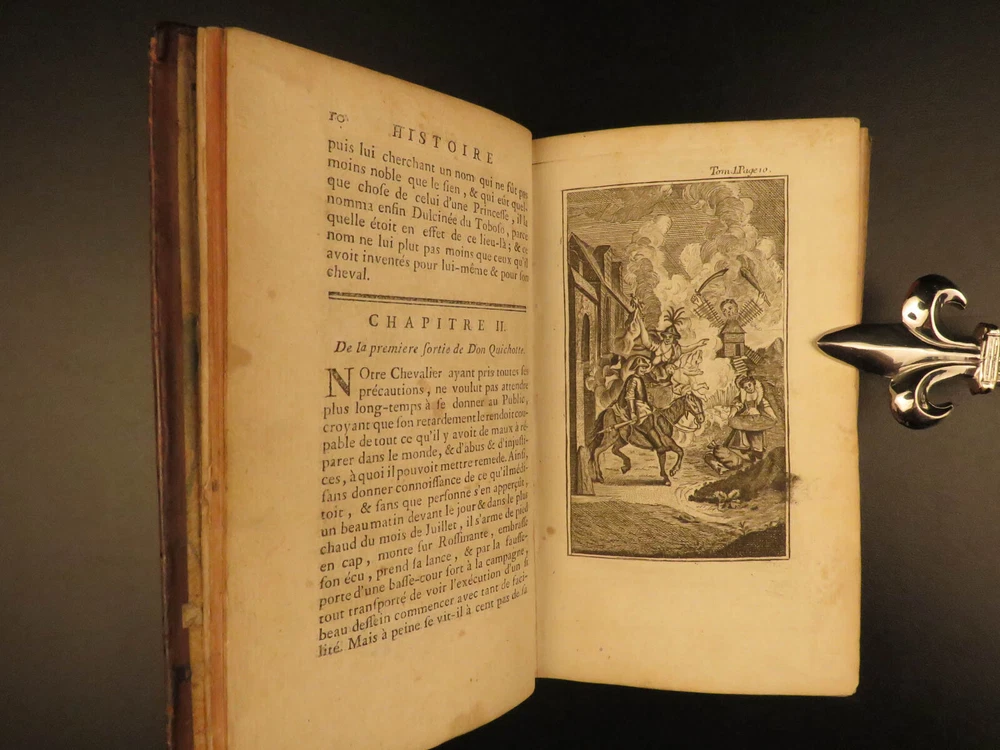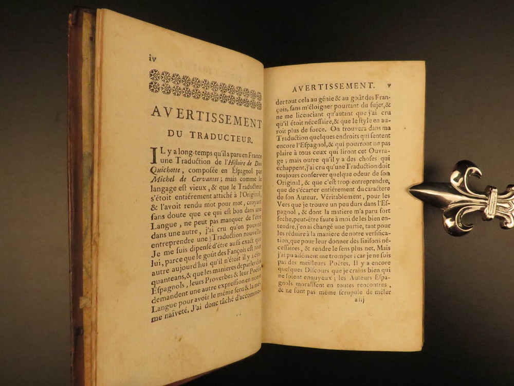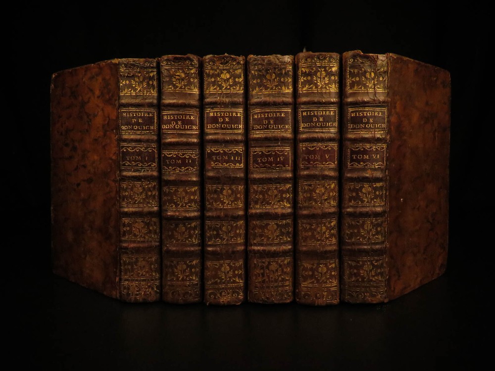 1773 Don Quixote Cervantes Saint-Martin French NEW ENDING Illustrated 6v SET Miguel de Cervantes’s ‘ Don Quixote’ is one of the most famous works of literature and is one of the most popular adventure tales to be written. This 1773 printing features François Filleau de Saint-Martin's French translation and is iconic for its full-page engravings depicting scenes from the famous story. Saint-Martin’s edition was first published in 1678 who modified the original ending by making Don Quixote live at the end! Item number: #10648 Price: $950 CERVANTES Saavedra, Miguel de Histoire de l'admirable Don Quichotte de la Manche. La Haye : & se vend chez Bassompierre, père, libr. à Liege, 1773. Details : · Collation: Complete with all pages; 6 volumes o Vol. I – [4], 397, [1] § 4 engraved plates o Vol. II – [4], 400, [4] § 2 engraved plates o Vol. III – [8], 403, [1] § 8 engraved plates o Vol. IV – [8], 488 § 10 engraved plates o Vol. V – [8], 451, [1] § 4 engraved plates o Vol. VI – [8], 452 § 4 engraved plates · Provenance: Handwritten – François Victor Euvrard, A Paris · Language: French · Binding: Leather; tight & secure · Size : ~6.5in X 3.75in (16.5cm x 9.5cm) Our Guarantee: Very Fast. Very Safe. Free Shipping Worldwide. Customer satisfaction is our priority! Notify us with 7 days of receiving, and we will offer a full refund without reservation! 10648
