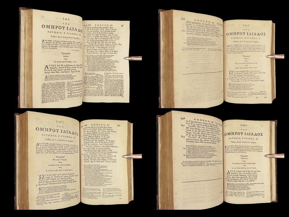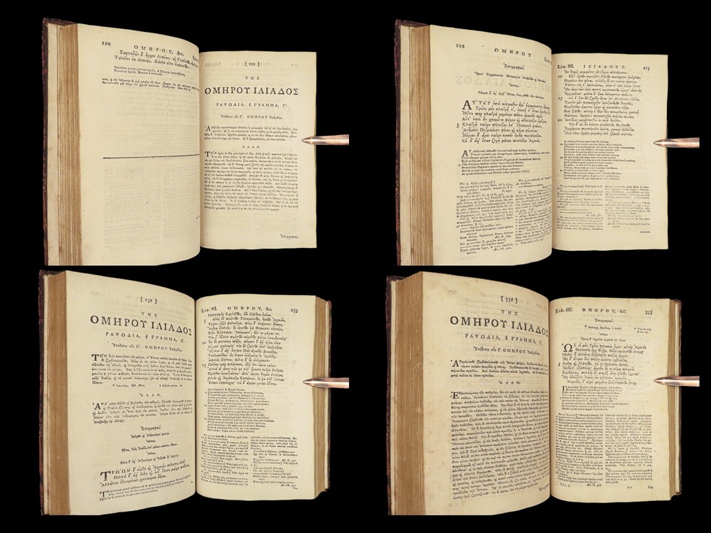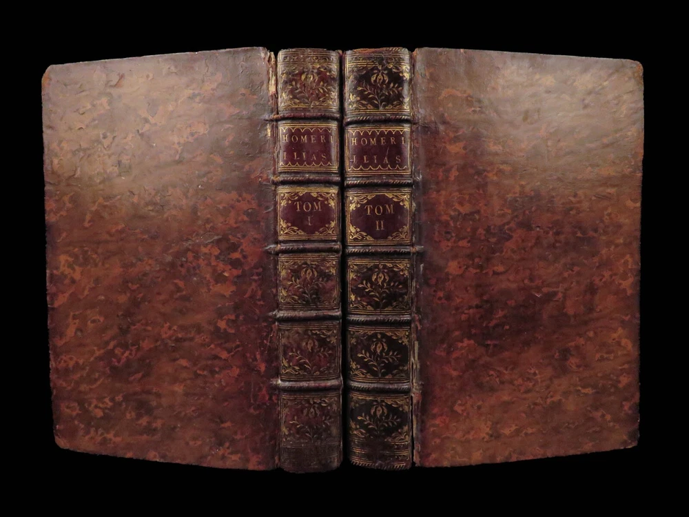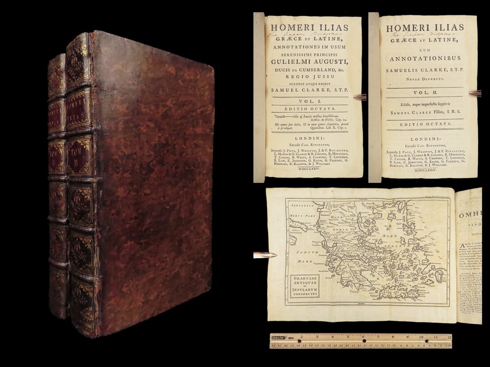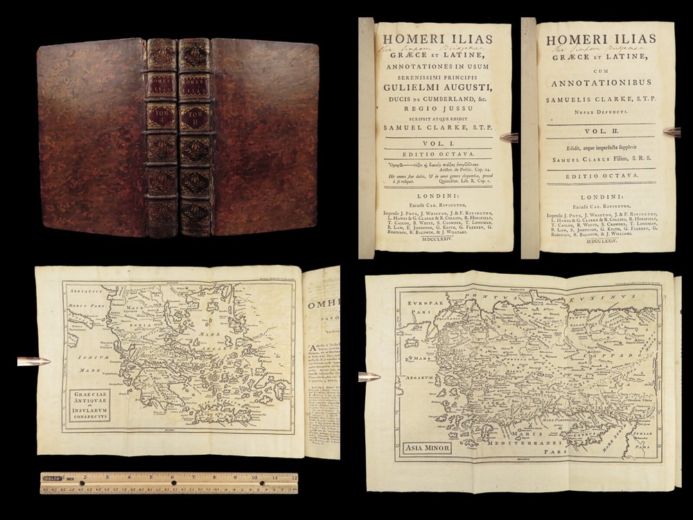 1774 Homer ILIAD Mythology Samuel Clarke Latin Greek Trojan War MAPS 2v SET “Hateful to me as the gates of Hades is that man who hides one thing in his heart and speaks another.” ― Homer, The Iliad A very rare 18 th -century edition of Homer, the legendary Greek poet responsible for the mythological epic poems the ‘ Iliad’ and the ‘ Odyssey . These two poems focus on Greek mythological heroes, their military conquests, and involvement in the Trojan War. Each of these titles have been printed and reprinted countless times. This edition of the ‘ Iliad’ was edited and translated by Samuel Clarke, who included both the Latin and Greek texts in top/bottom format. Clarke died in 1729 and was only able to complete the first 12 books of the ‘ Iliad’ before his death. His son completed the set, which was finalized in 1732. This 1774 two-volume set is highly desirable and valuable in part to the inclusion of both folding maps! Item number: #28338 Price: $950 HOMER Homeri Ilias graece et latine : annotationes in usum serenissimi principis Gulielmi Augusti ... Londini: Excudit Car. Rivington, impensis J. Pote…, 1774 . Details : · Collation: Complete with all pages; 2 volumes o Vol. I – [8], 510 o Vol. II – 510, [16] o 2 folding maps · Provenance: o Armorial bookplate – Weston Library § Likely referring to Weston Park, home and seat of Henry Bridgeman, 1st Baron Bradford (1725–1800). o Handwritten – Hen. Simpson Bridgeman § Henry Simpson Bridgeman (1757–1782) was a British politician who sat in the House of Commons from 1780 to 1782, and son of Henry Bridgeman, 1st Baron Bradford. · Language: Greek / Latin · Binding: Leather; secure · Size: ~8.5in X 5.5in (21.5cm x 14cm) Our Guarantee: Very Fast. Very Safe. Free Shipping Worldwide. Customer satisfaction is our priority! Notify us with 7 days of receiving, and we will offer a full refund without reservation!