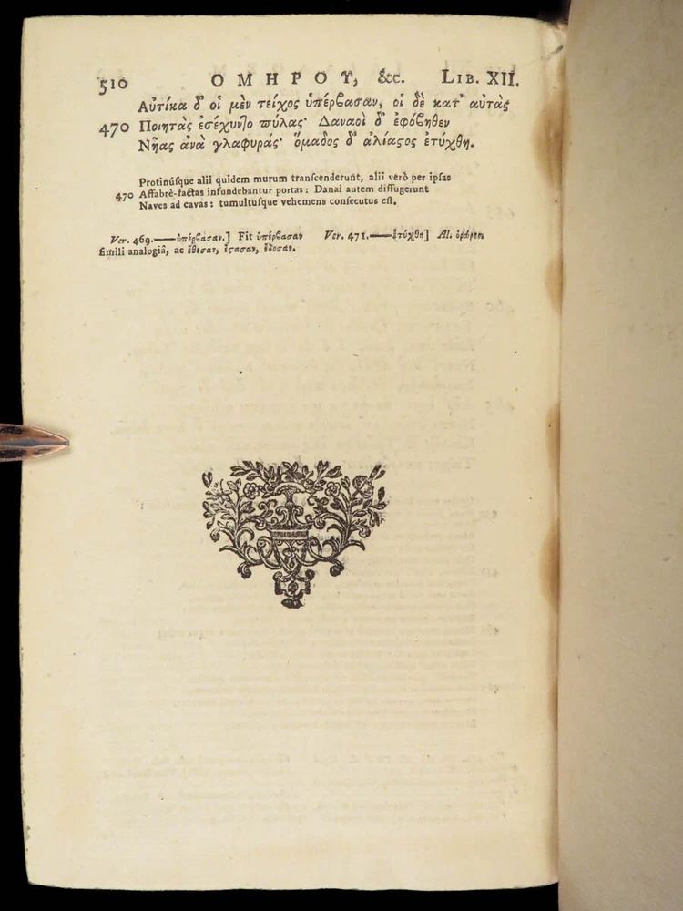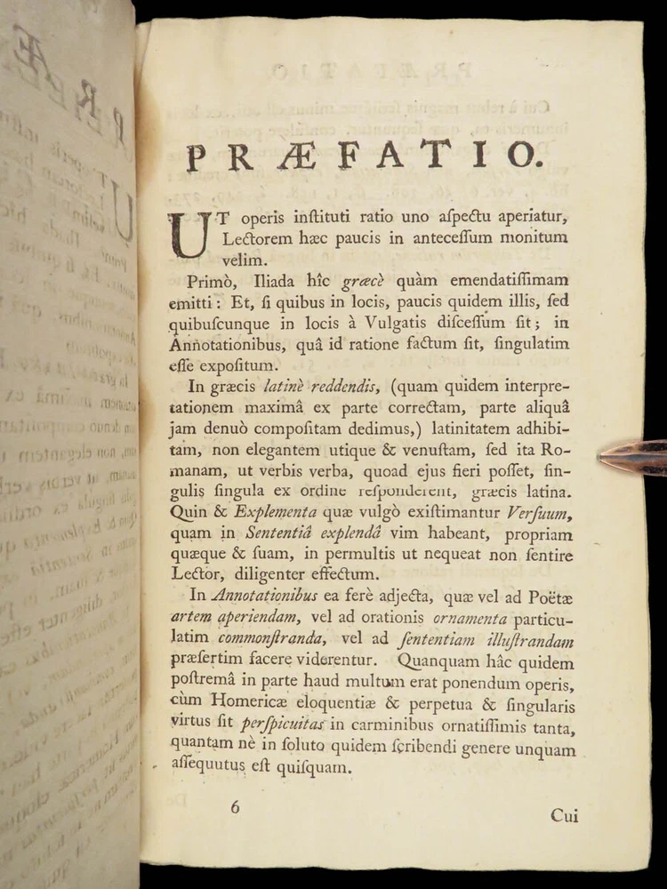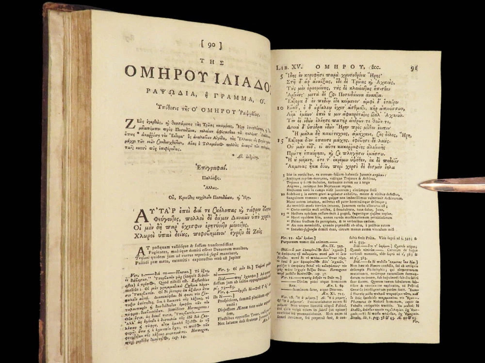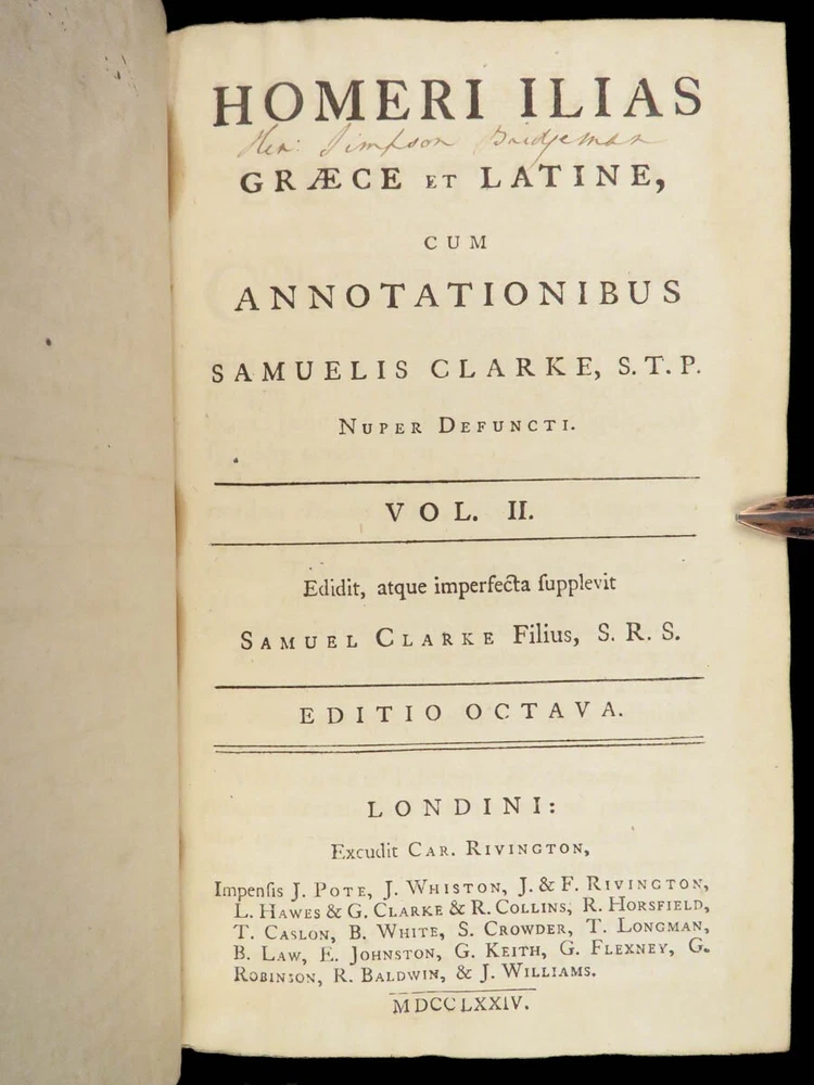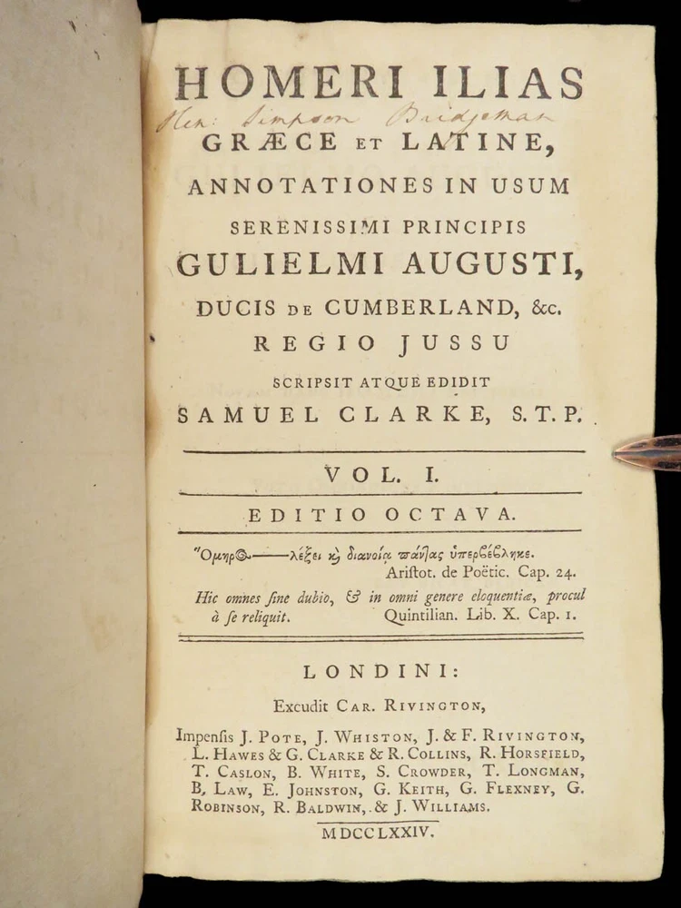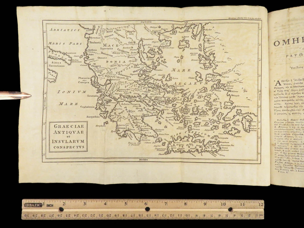1774 Homer ILIAD Mythology Samuel Clarke Latin Greek Trojan War MAPS 2v SET “Hateful to me as the gates of Hades is that man who hides one thing in his heart and speaks another.” ― Homer, The Iliad A very rare 18 th -century edition of Homer, the legendary Greek poet responsible for the mythological epic poems the ‘ Iliad’ and the ‘ Odyssey . These two poems focus on Greek mythological heroes, their military conquests, and involvement in the Trojan War. Each of these titles have been printed and reprinted countless times. This edition of the ‘ Iliad’ was edited and translated by Samuel Clarke, who included both the Latin and Greek texts in top/bottom format. Clarke died in 1729 and was only able to complete the first 12 books of the ‘ Iliad’ before his death. His son completed the set, which was finalized in 1732. This 1774 two-volume set is highly desirable and valuable in part to the inclusion of both folding maps! Item number: #28338 Price: $950 HOMER Homeri Ilias graece et latine : annotationes in usum serenissimi principis Gulielmi Augusti ... Londini: Excudit Car. Rivington, impensis J. Pote…, 1774 . Details : · Collation: Complete with all pages; 2 volumes o Vol. I – [8], 510 o Vol. II – 510, [16] o 2 folding maps · Provenance: o Armorial bookplate – Weston Library § Likely referring to Weston Park, home and seat of Henry Bridgeman, 1st Baron Bradford (1725–1800). o Handwritten – Hen. Simpson Bridgeman § Henry Simpson Bridgeman (1757–1782) was a British politician who sat in the House of Commons from 1780 to 1782, and son of Henry Bridgeman, 1st Baron Bradford. · Language: Greek / Latin · Binding: Leather; secure · Size: ~8.5in X 5.5in (21.5cm x 14cm) Our Guarantee: Very Fast. Very Safe. Free Shipping Worldwide. Customer satisfaction is our priority! Notify us with 7 days of receiving, and we will offer a full refund without reservation!