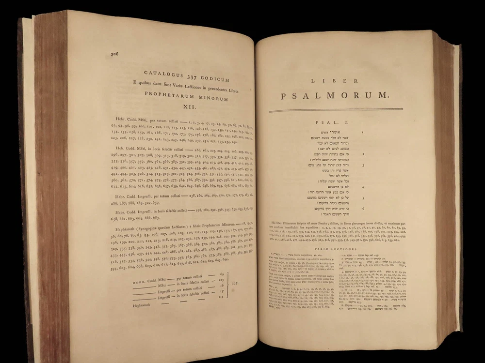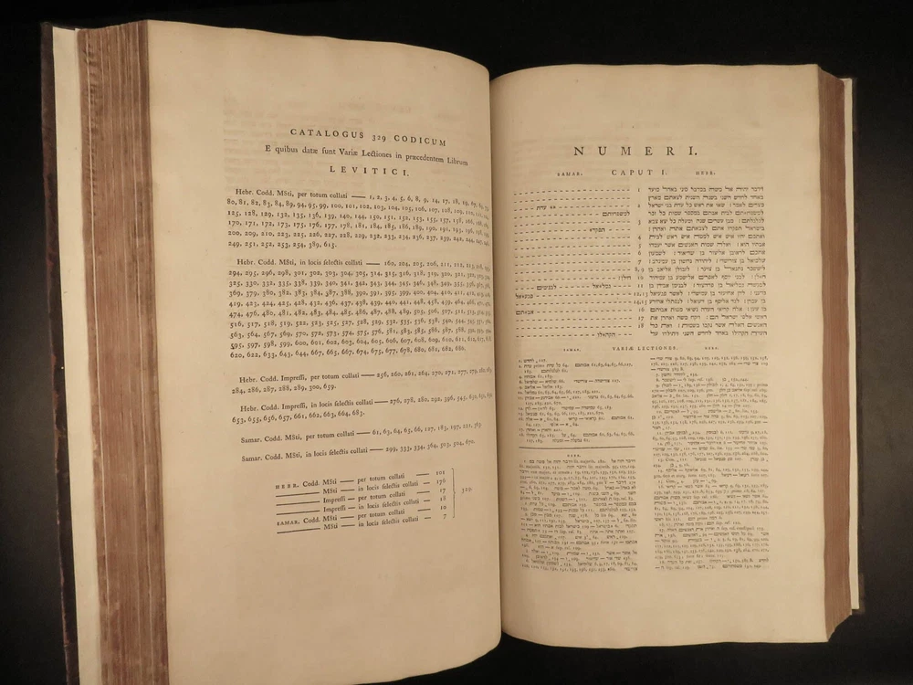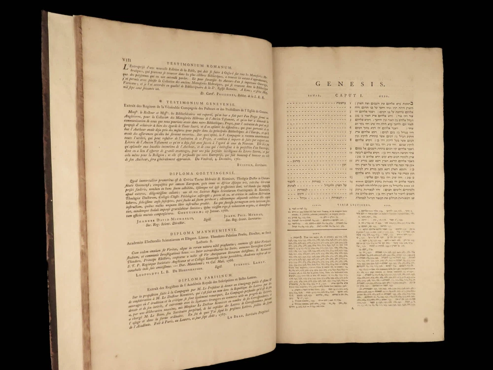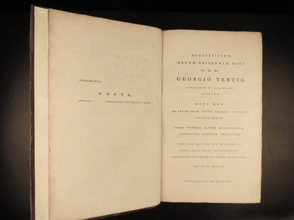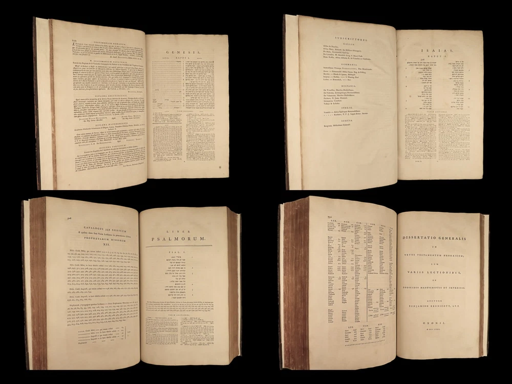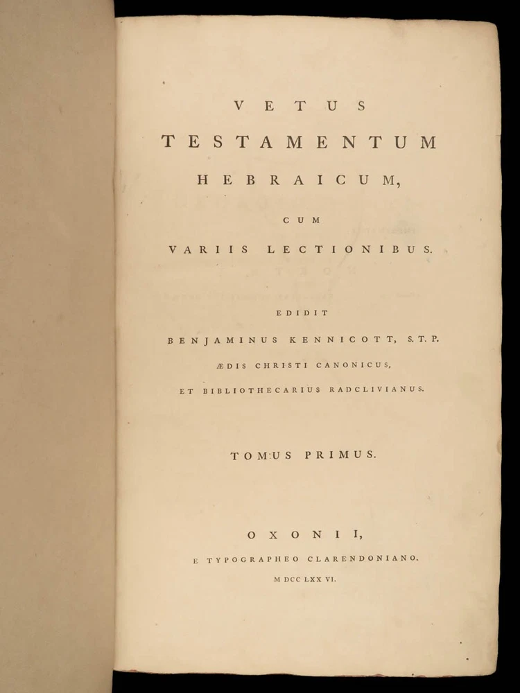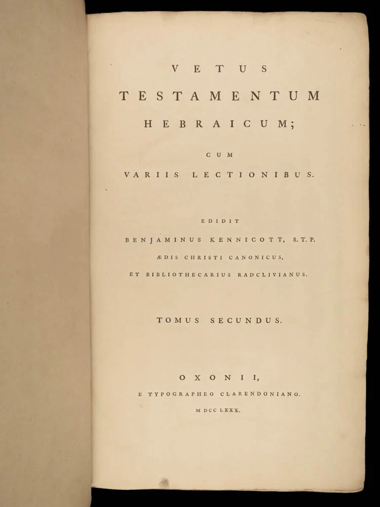 1776 FAMED 1 st Kennicott Hebrew BIBLE Hebraica Oxford ENORMOUS 2v SET Judaica The ‘Kennicott Bible’ has long been known as one of the most important Bibles of the 18 th -century . Benjamin Kennicott was a well-known English Hebraist who studied the Hebrew Bible and made his life’s work studying and comparing variants of Hebrew manuscripts. This utterly massive 1776 Oxford first edition of the Kennicott Bible was published by in two huge tomes, filled with Kennicott’s Hebrew annotations and scriptural references. Kennicott spent years collecting hundreds of Hebrew manuscripts, which made this one of the most thorough and comprehensive collections of variant readings of the Old Testament. According to Andrews, “Kennicott's edition was a significant contribution to biblical scholarship in the 18th century. It was the first edition to include variant readings from such a large number of Hebrew manuscripts and helped to establish the original text of the Hebrew Bible”. Item number: #24464 Price: $1500 KENNICOTT, Benjamin Vetus Testamentum Hebraicum, cum variis lectionibus Oxonii: E. typographeo Clarendoniano, 1776-1780. First edition! Details : · Collation: Complete with all pages; 2 volumes o Vol. I – xxiii, [1], VIII, 684, [2] o Vol. II – [4], 732, 129, [7] · References: Edward D. Andrews: Introduction to the Text of the Old Testament, p.106; Darlow & Moule 5160 · Language: Hebrew / Latin · Binding: Leather; tight and secure · Size : ~17.5in X 11in (44.5cm x 28cm) Our Guarantee: Very Fast. Very Safe. Free Shipping Worldwide. Customer satisfaction is our priority! Notify us with 7 days of receiving, and we will offer a full refund without reservation! 24464