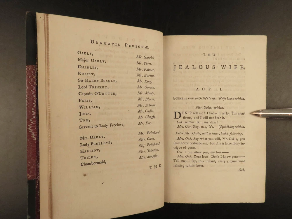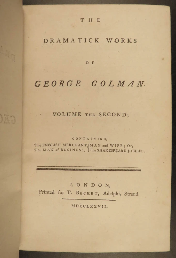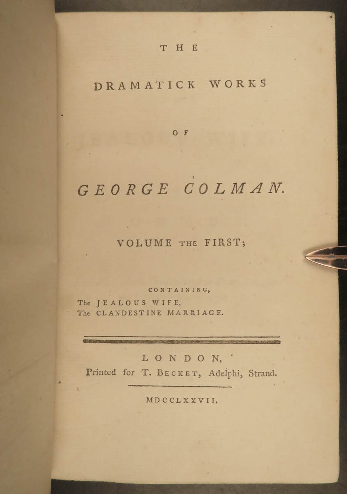 1777 1 ed Works George Colman Theater Plays Polly Honeycomb Silent Woman 4v SET George Colman was an 18 th -century English playwright. While Colman was not the most famous dramatist of the 1700s, his plays are still considered to be valuable works in English theater. This four-volume 1777 set of the works of Colman includes his most important works including ‘ The Jealous Wife’, ‘The Clandestine Marriage’, and ‘Polly Honeycomb’. Item number: #19222 Price: $750 COLMAN, George The dramatick works of George Colman London : Printed for T. Becket, Adelphi, 1777. 1 st edition Details : · Collation: Complete with all pages; 4 volumes o Vol. 1 – [4], 292, [10] § The Jealous Wife § The Clandestine Marriage o Vol. 2 – [4], 294 § The English Merchant § The Man of Business § Man and Wife; or, The Shakespeare Jubilee o Vol. 3 – [4], 324 § Philaster § King Lear § Epicoene, the Silent Woman o Vol. 4 – [4], 348 § Polly Honeycomb § Musical Lady § Deuce is in Him § Oxonian in Town § Fairy Prince § plus more · Language: English · Binding: Leather; tight and secure · Size : ~7in X 4.75in (18cm x 12cm) · Quite rare Our Guarantee: Very Fast. Very Safe. Free Shipping Worldwide. Customer satisfaction is our priority! Notify us with 7 days of receiving, and we will offer a full refund without reservation! 19222