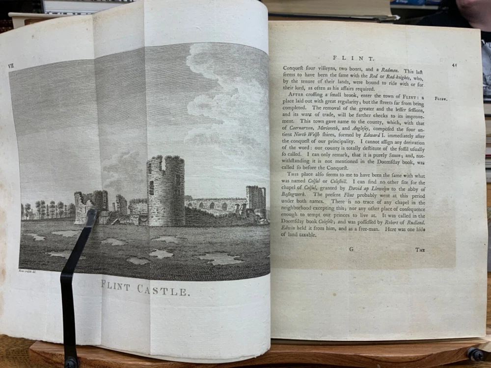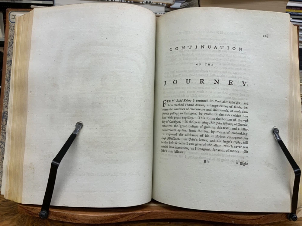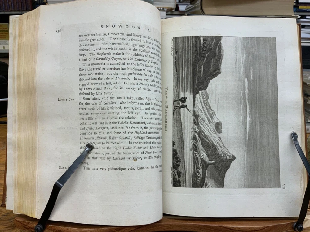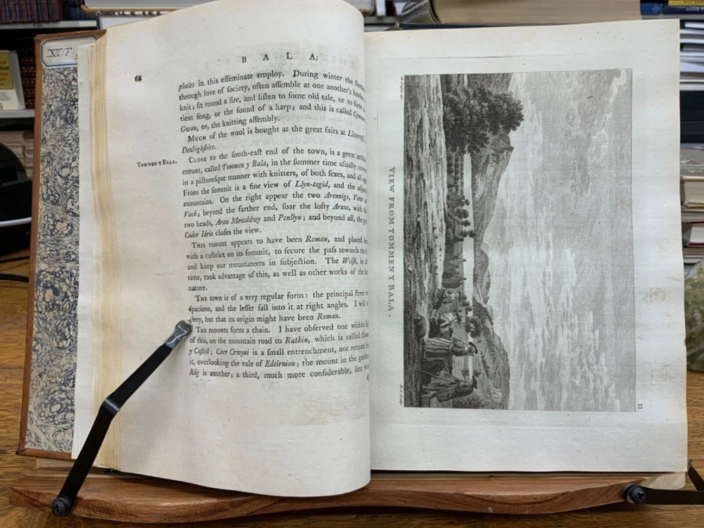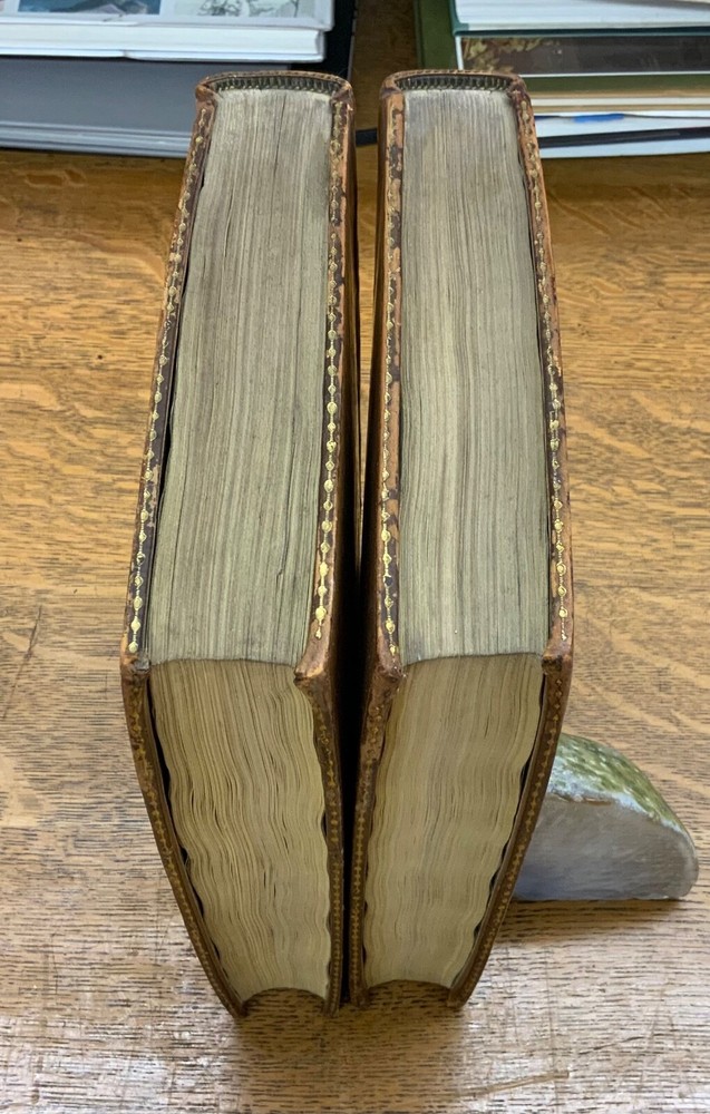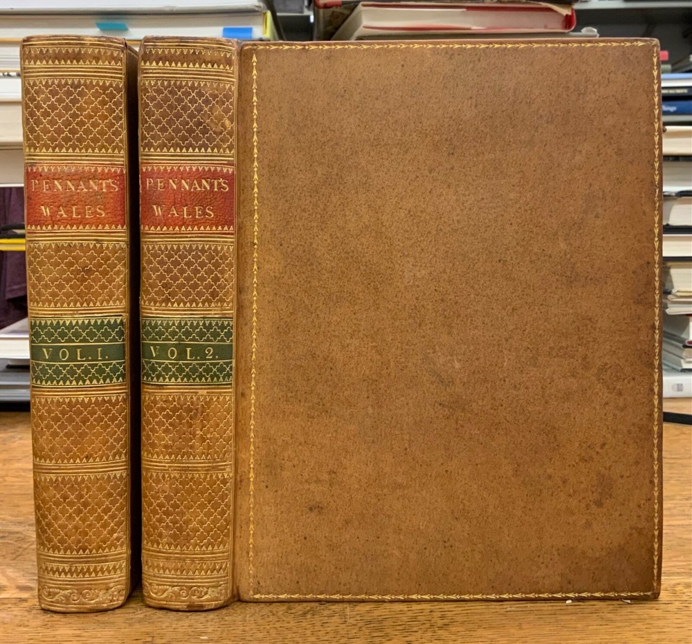 Uniform & modern full-leather binding measuring 10 x 7.75”, royal 8vos. A Tour in Wales. 1773. London: Printed by Henry Hughes. 1778. XXVI plts (Complete). 455 p. First Edition. The Journey to Snowdon. London: Printed by Henry Hughes. 1781. XI plts (Complete). 487 p. First Edition. In good condition. Modern full leather boards normally rubbed at edges and corners. Head and tail of spines rubbed; title and volume labels lightly soiled but attractive and intact. Gilt lettering and deco on spines bright and clean. Edges of text-blocks painted yellow. Ex-library (most likely) manuscript stickers found on top corners of both front paste-downs. Light foxing found around edges of vignette title pages. Normal toning throughout text-blocks; instances of finger-soiling found on fore-edges of leaves. Some light off-setting to leaves adjacent to plates. Some pencil marginalia found on preliminary pages in both volumes. Modern binding tight and intact. Please see photos and ask questions, if any, before purchasing. Thomas Pennant (1726 – 1798) was a Welsh naturalist, traveller, writer and antiquarian. He was born and lived his whole life at his family estate, Downing Hall, near Whitford, Flintshire, in Wales. As a traveller he visited Scotland and many other parts of Britain and wrote about them. Many of his travels took him to places that were little known to the British public and the travelogues he produced, accompanied by painted and engraved colour plates, were much appreciated. Each tour started at his home and related in detail the route, the scenery, the habits and activities of the people he met, their customs and superstitions, and the wildlife he saw or heard about. He travelled on horseback accompanied by his servant, Moses Griffith, who sketched the things they encountered and later worked these up into illustrations for the books. He was an amiable man with a large circle of friends and was still busily following his interests into his sixties. He enjoyed good health throughout his life and died at Downing at the age of seventy-two. Rare 1st Edition complete set. With plates. RAREB1778HPQB 11/24 - HK2162