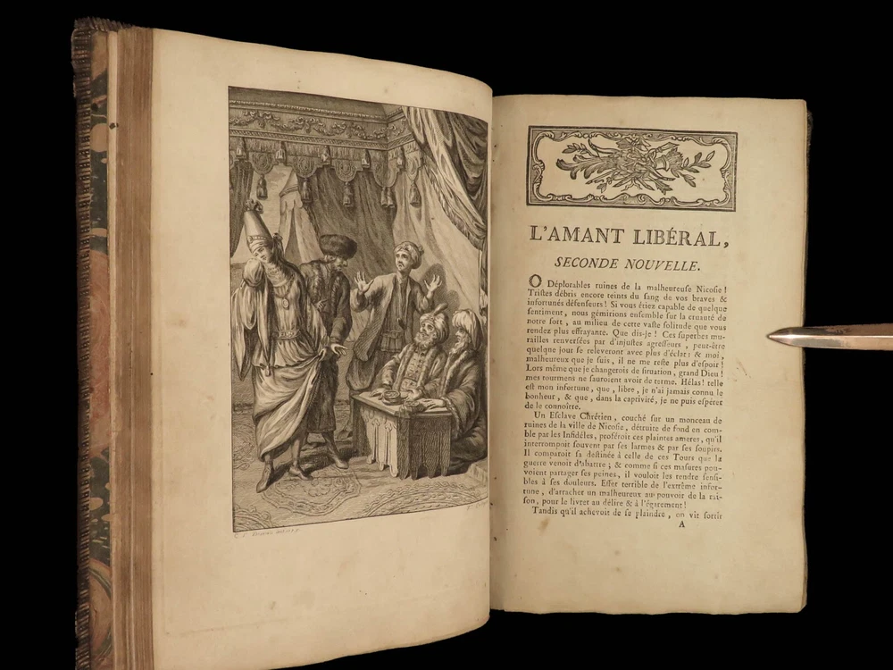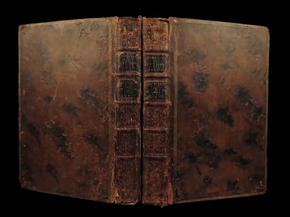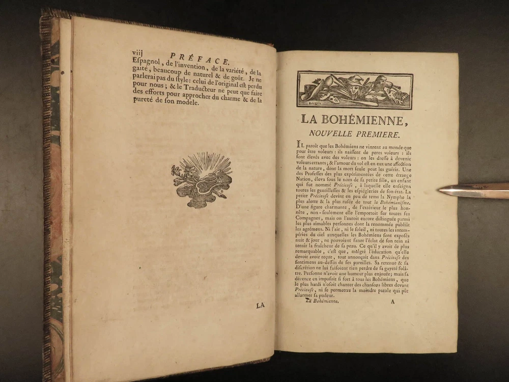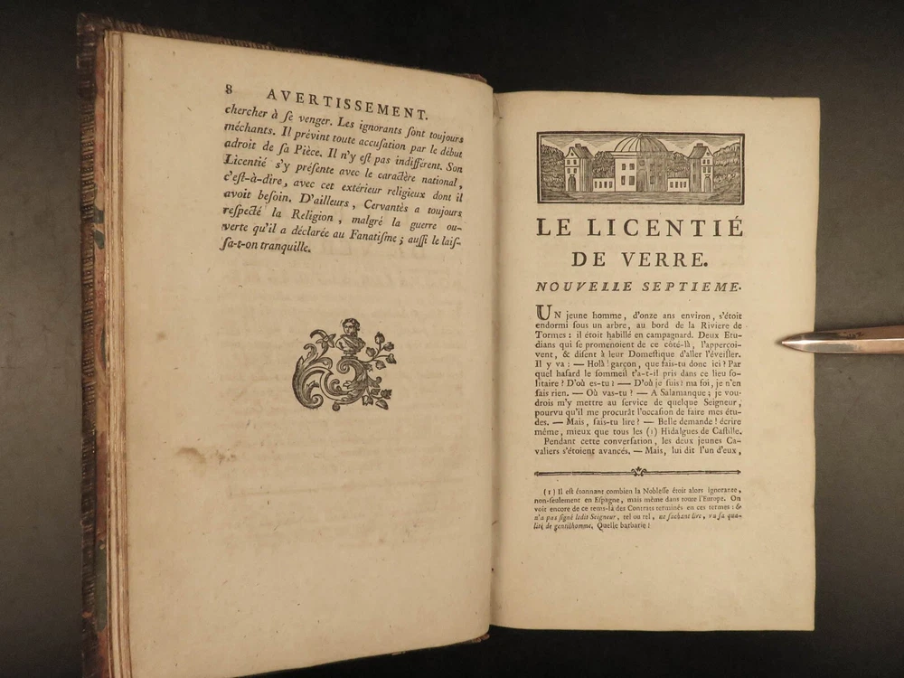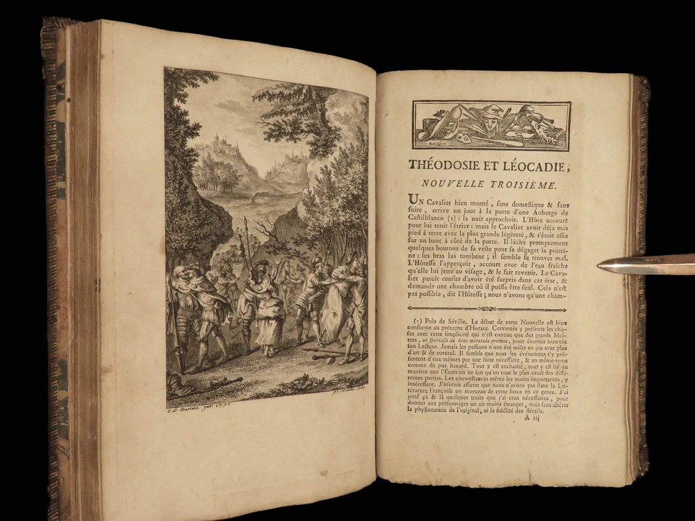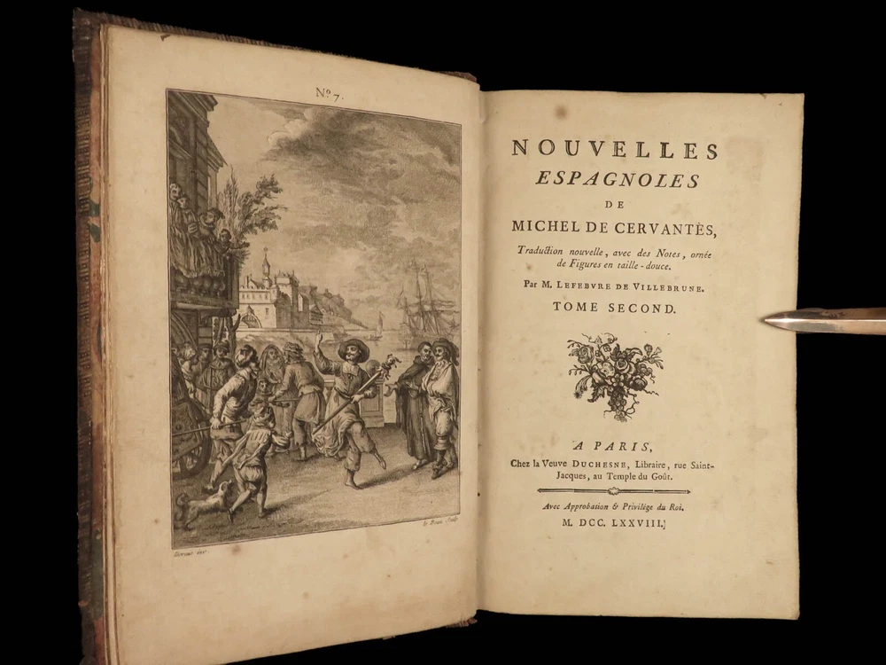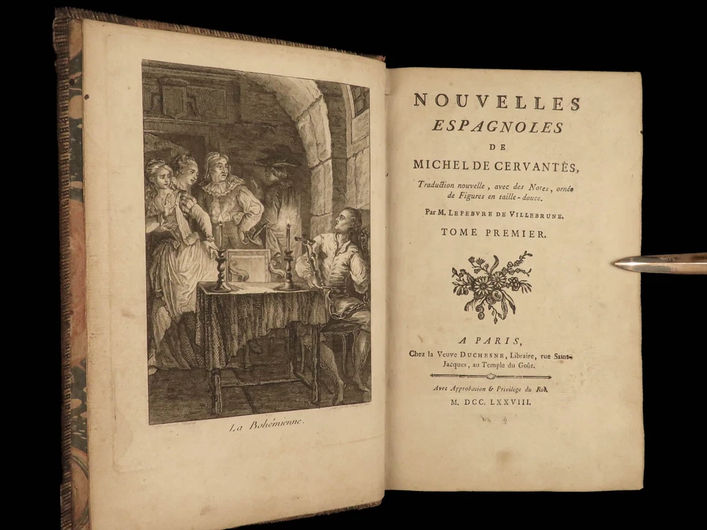 1778 Spanish Cervantes Exemplary Novels Villebrune Illustrated 2v SET Quixote “My genius and my inclination prompt me to this kind of writing; the more so as I consider (and with truth) that I am the first who has written novels in the Spanish language, though many have hitherto appeared among us, all of them translated from foreign authors. But these are my own, neither imitated nor stolen from anyone; my genius has engendered them, my pen has brought them forth, and they are growing up in the arms of the press.” ― Miguel de Cervantes, boasting of being the first to write novellas in Spanish. In 1613, when this collection of Spanish novellas was first printed, they were the most popular novellas of the time. Many of Cervantes’s novellas are still popular today, even though none of his work is as significant as ‘ Don Quixote .’ These short stories would inspire many English dramas especially Middleton and Fletcher. This rare French two-volume edition features ornate figures and illustrations by Lefebvre de Villebrune. Item number: #22777 Price: $599 CERVANTES, Miguel de Saavedra Nouvelles espagnoles de Michel de Cervantès. A Paris : chez la veuve Duchesne ..., 1778. Details : · Collation: 2 volumes o Vol. 1 § La Bohemienne – viii, 71, [1] § L’Amant Liberal – 50 § Theodosie et Leocadie – [5]-40, [2] § Le Jaloux D’Estremadure – [7]-48 § L’Espagnole Angloise – 2, [5]-56 § Le Sot Curieux – [5]-63, [1] o Vol. 2 § Le Licentie de Verre – 56 § L’illustre Fregone – [3]-84 · Wanting p. 7-10 § La Force du Sang – [3]-56 § Cornelie – [3]-76 § Le Mariage Trompeur – [3]-96 § Les Filoux – [3]-63, [1] o 12 full-page engravings · Language: French · Binding: Leather; tight and secure · Size: ~ 9.25in X 6in (23.5cm x 15cm) Our Guarantee: Very Fast. Very Safe. Free Shipping Worldwide. Customer satisfaction is our priority! Notify us with 7 days of receiving, and we will offer a full refund without reservation! 22777