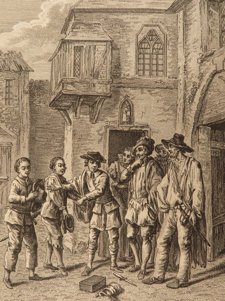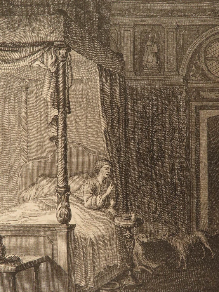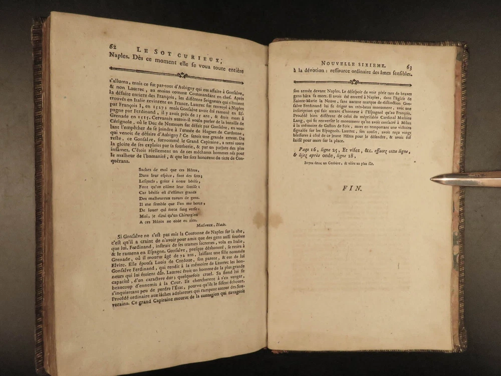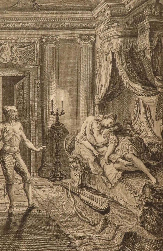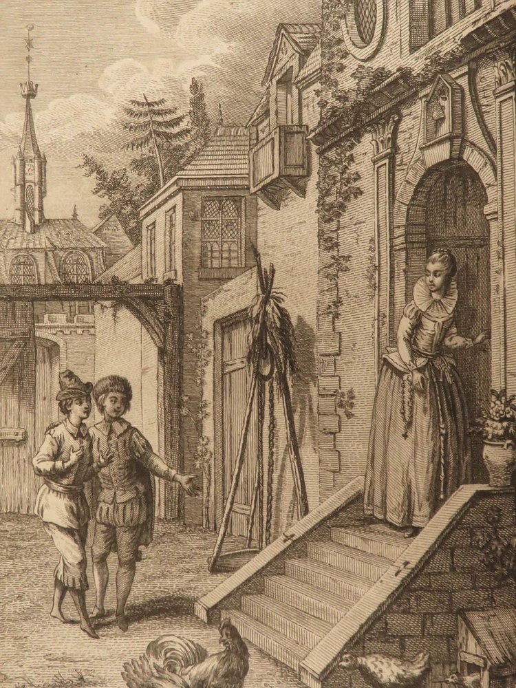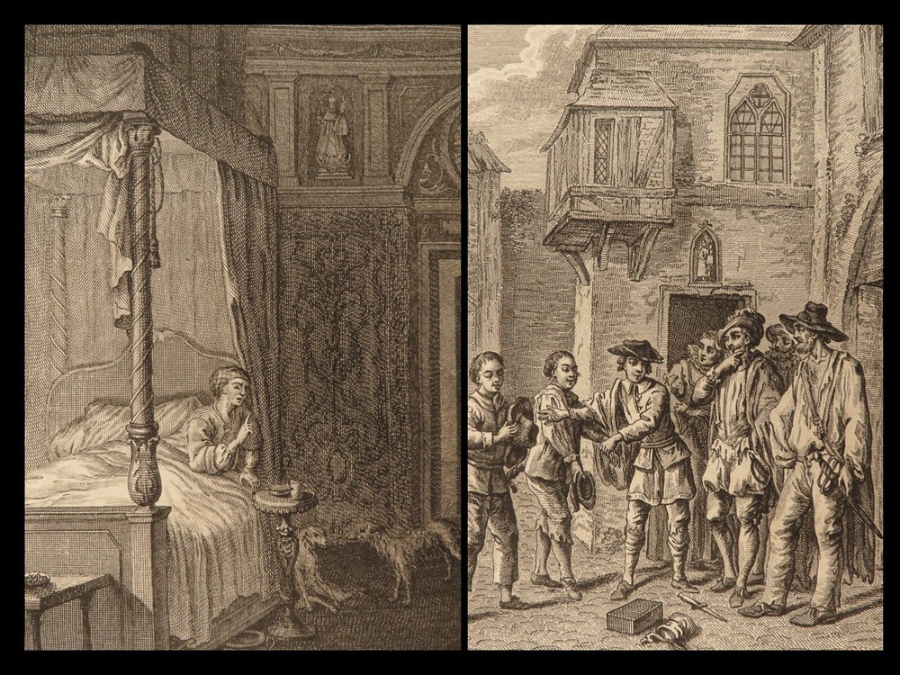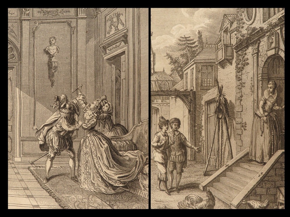 1778 Spanish Cervantes Exemplary Novels Villebrune Illustrated 2v SET Quixote “My genius and my inclination prompt me to this kind of writing; the more so as I consider (and with truth) that I am the first who has written novels in the Spanish language, though many have hitherto appeared among us, all of them translated from foreign authors. But these are my own, neither imitated nor stolen from anyone; my genius has engendered them, my pen has brought them forth, and they are growing up in the arms of the press.” ― Miguel de Cervantes, boasting of being the first to write novellas in Spanish. In 1613, when this collection of Spanish novellas was first printed, they were the most popular novellas of the time. Many of Cervantes’s novellas are still popular today, even though none of his work is as significant as ‘ Don Quixote .’ These short stories would inspire many English dramas especially Middleton and Fletcher. This rare French two-volume edition features ornate figures and illustrations by Lefebvre de Villebrune. Item number: #22777 Price: $599 CERVANTES, Miguel de Saavedra Nouvelles espagnoles de Michel de Cervantès. A Paris : chez la veuve Duchesne ..., 1778. Details : · Collation: 2 volumes o Vol. 1 § La Bohemienne – viii, 71, [1] § L’Amant Liberal – 50 § Theodosie et Leocadie – [5]-40, [2] § Le Jaloux D’Estremadure – [7]-48 § L’Espagnole Angloise – 2, [5]-56 § Le Sot Curieux – [5]-63, [1] o Vol. 2 § Le Licentie de Verre – 56 § L’illustre Fregone – [3]-84 · Wanting p. 7-10 § La Force du Sang – [3]-56 § Cornelie – [3]-76 § Le Mariage Trompeur – [3]-96 § Les Filoux – [3]-63, [1] o 12 full-page engravings · Language: French · Binding: Leather; tight and secure · Size: ~ 9.25in X 6in (23.5cm x 15cm) Our Guarantee: Very Fast. Very Safe. Free Shipping Worldwide. Customer satisfaction is our priority! Notify us with 7 days of receiving, and we will offer a full refund without reservation! 22777