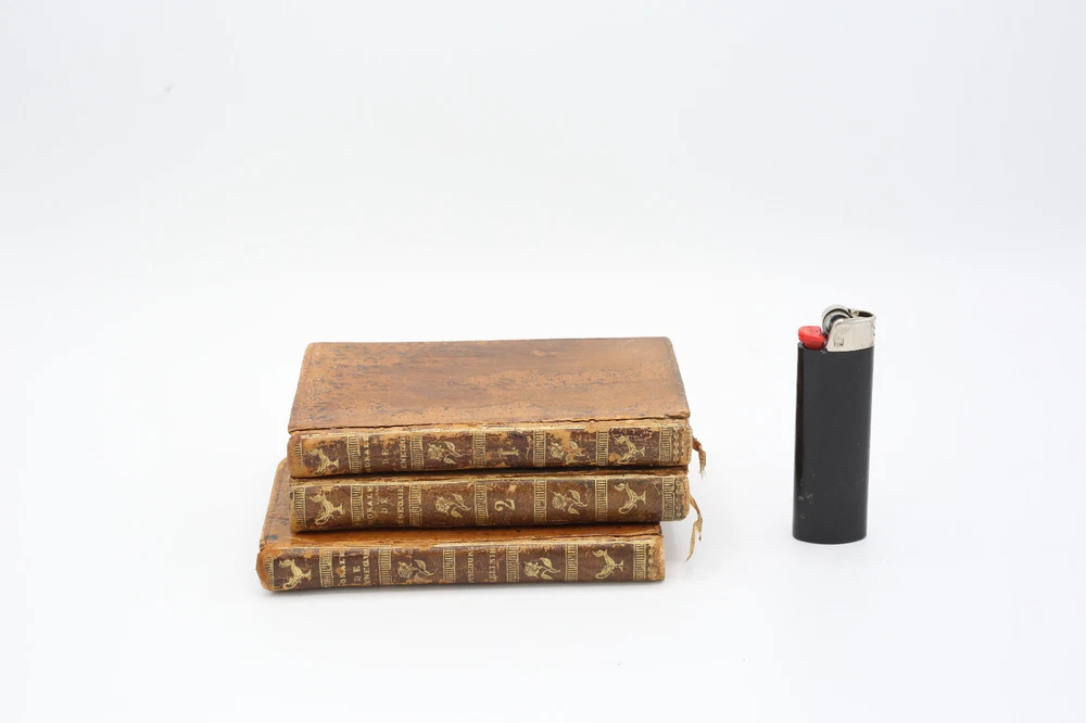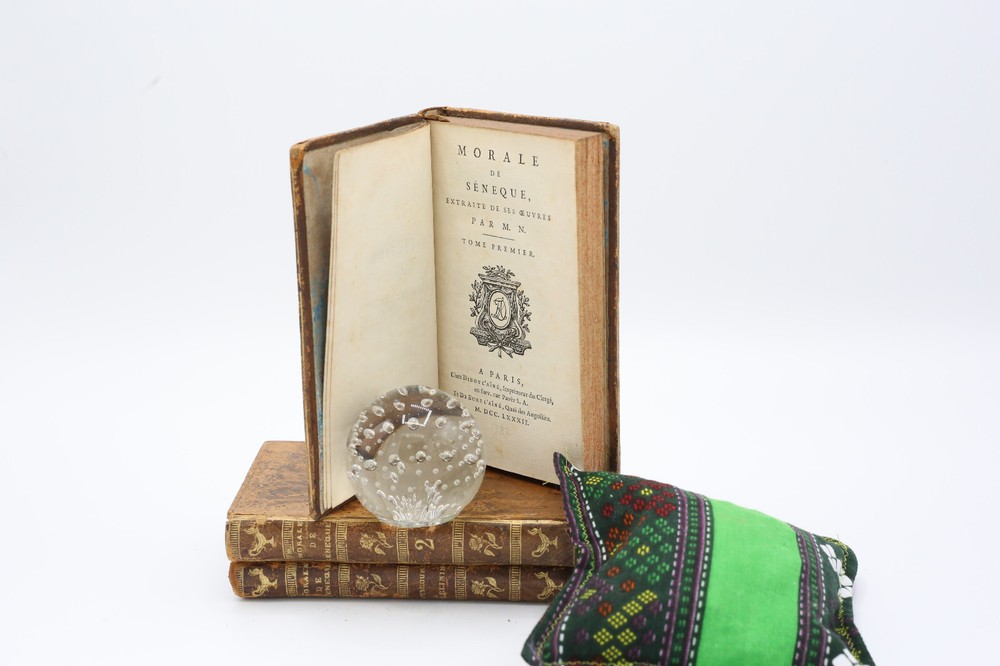 1782, Paris, Chez Didot L'aîné, Imprimeur du clergé Morales de Seneque, Collection de Moralistes Anciens, Volumes 1, 2, 3. Beautifully produced editions, brown calf boards with gilt lettering and edging.Inside front and back pages marbled paper. Cover fair condition for it's age, in very good condition.