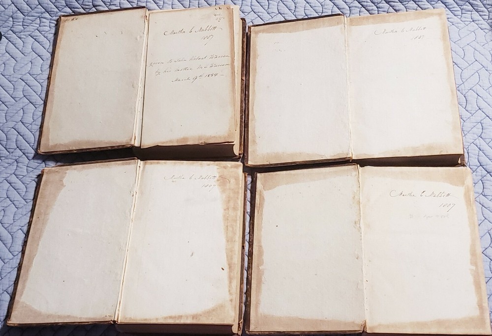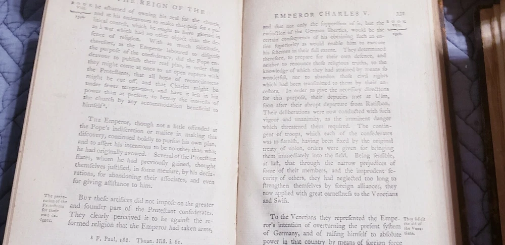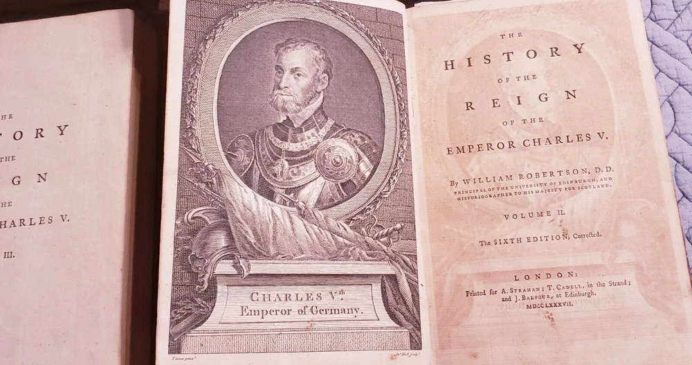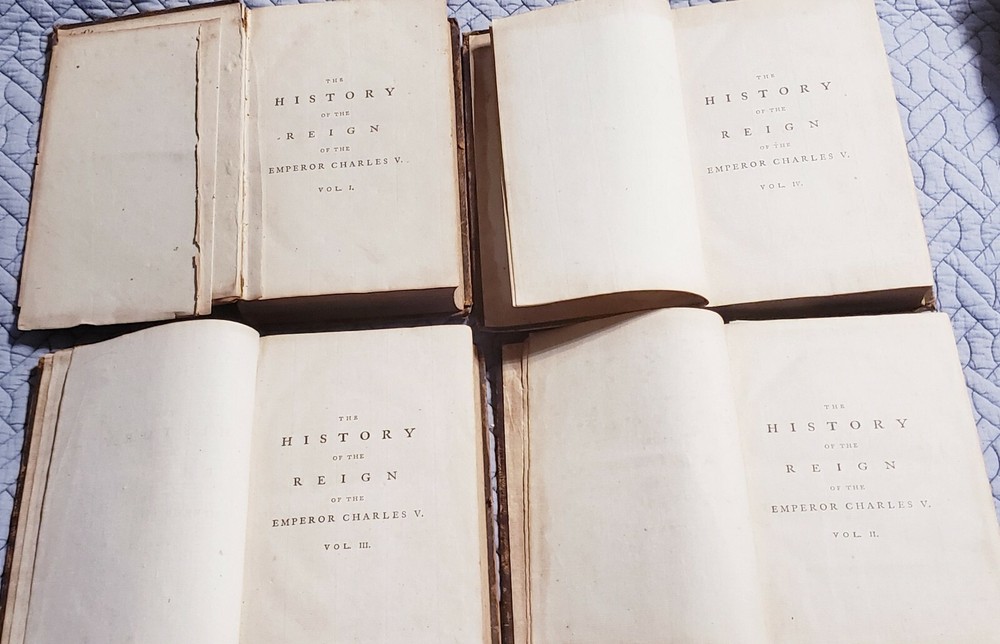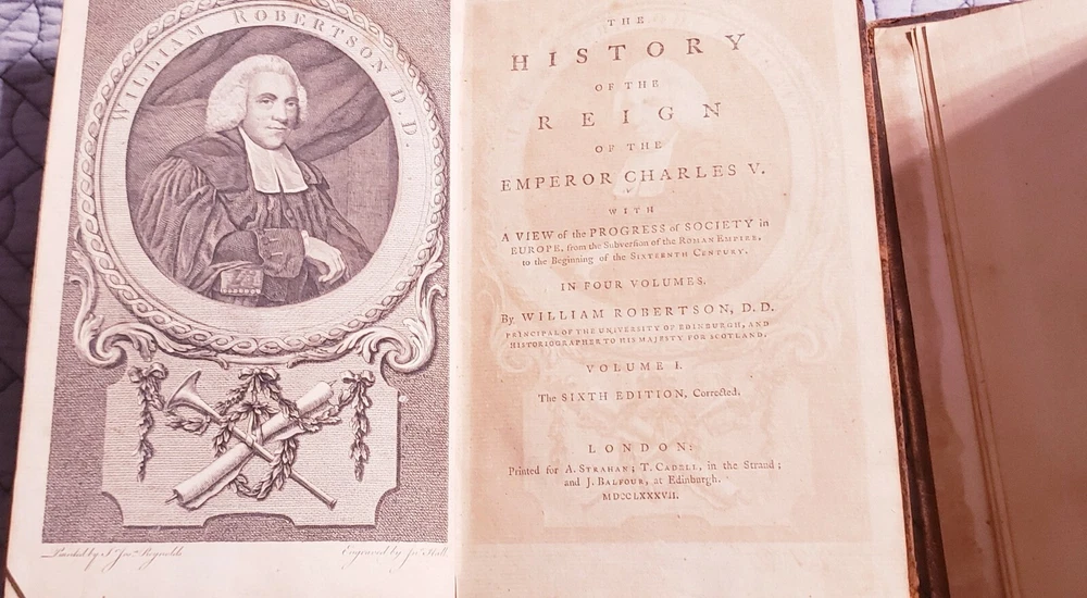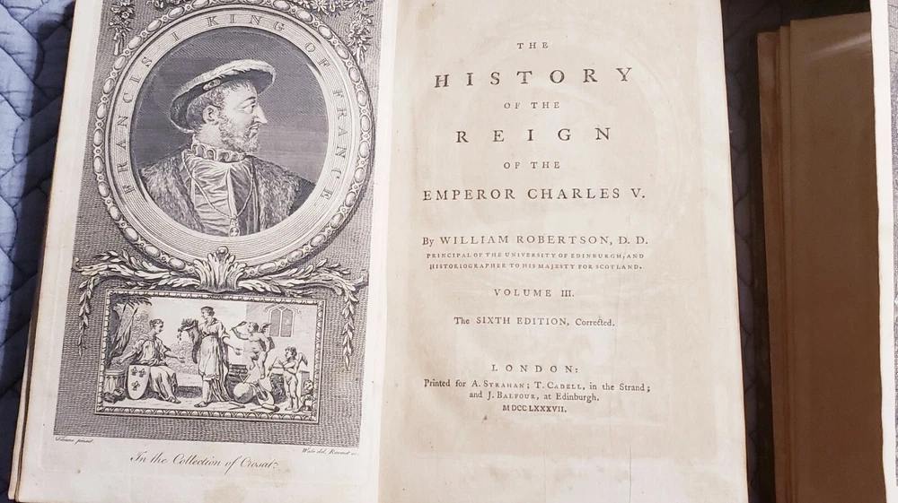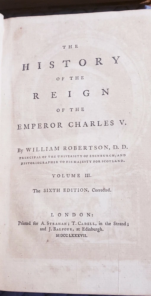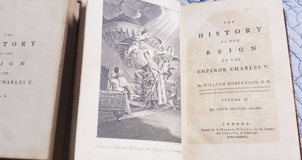 1787 HISTORY REIGN EMPEROR CHARLES V, 4 VOLUME SET, LEATHER BOUND ENGRAVINGS. Title: THE HISTORY OF THE REIGN OF THE EMPEROR CHARLES V, WITH A VIEW OF THE PROGRESS OF SOCIETY IN EUROPE FROM THE SUBVERSION OF THE ROMAN EMPIRE TO THE BEGINNING OF THE SIXTEENTH CENTURY Author: WILLIAM ROBERTSON, D.D. Date: 1787 6th edition Publisher: Strahan, Cadell, Balfour Size: 4 1/4 X 7" Condition: GOOD Notes: Published in 1787, leather bound, complete set of 4 volumes, 10th edition, edgewear and rounding of corners, scratching and scuffing to the covets and spines (see photos, they are part of the description), pages have browned with age, bindings are fairly tight (no spine breaks), some writing inside especially in front and rear matter, each volume has a different engraving frontspiece. All pages appear intact, with the exception of one frontpage which is loose.