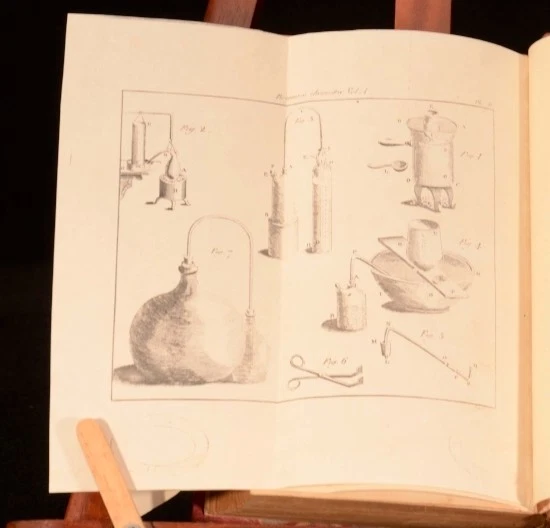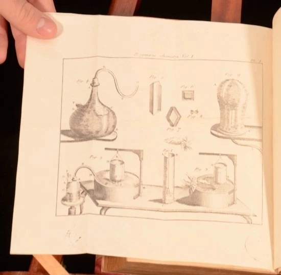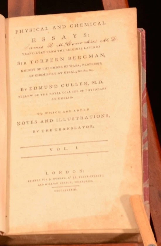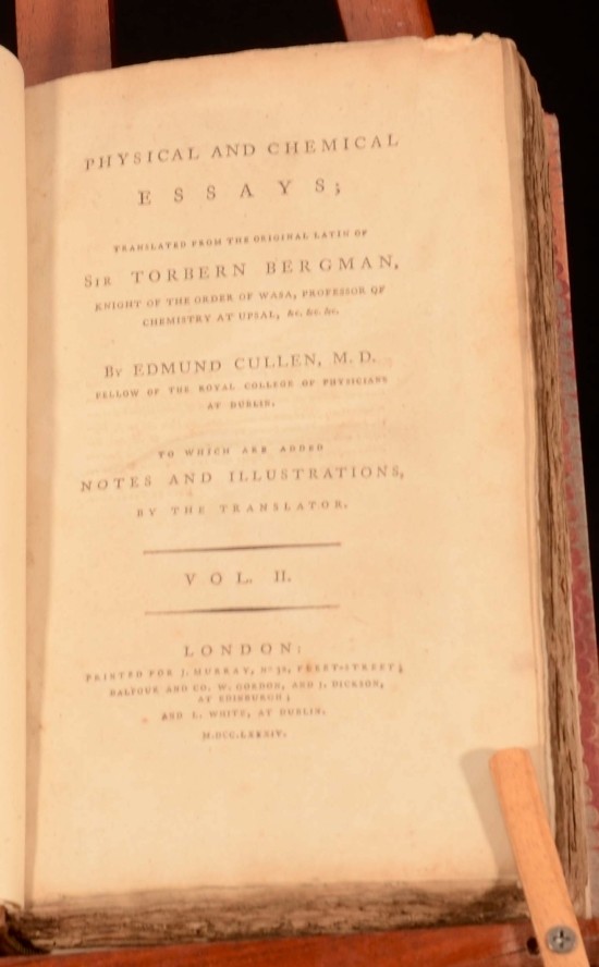 Click here to see our other books! Physical and Chemical Essays Sir Torbern Bergman; Edmund Cullen 1788 J. Murray and William Creech : London 8.5" by 5.5" (xliv), 467pp.; (xv), 518pp. SUMMARY A two volume set of Bergman's Physical and Chemical Essays - to which are added notes and illustrations by the translator. Early Edition,Folding Plates,Illustrated,Rebound,Scarce Overall Condition: Very Good This book weighs 2 KG when packed UK Postage: £ 3.99 US Postage: £ 29.99 EU Postage : £ 21.99 European Postage: £ 23.99 Asia Postage: £ 37.99 Worldwide Postage: £ 38.99 DESCRIPTION Translated from the original Latin of Sir Torbern Bergman by Edmund Cullen. Torbern Olaf Bergman (1735 – 1784) was a Swedish chemist and mineralogist noted for his 1775 Dissertation on Elective Attractions, containing the largest chemical affinity tables ever published. Bergman was the first chemist to use the A, B, C, etc., system of notation for chemical species. With five fold-out plates and tables to volume one, including a Synoptical Table, and two fold-out plates to volume two. Collated and Complete. Scarce. CONDITION Re-bound in quarter-calf bindings. Externally very smart with some shelfwear only. Internally firmly bound with generally bright and clean pages throughout - minor browning due to age, with some tidemarks to the rear of volume 2. Ink signature to title page of volume 1. Overall Condition: Very Good GLOSSARY OF TERMS Overall Condition (Dustwrapper condition rating is shown after that for the book itself, where a dustwrapper is present) Fine - Very well preserved copy showing very little wear Very Good Indeed - Only one or two minor faults, really a very attractive copy Very Good - Quite a wide term meaning no major faults but probably several smaller ones often expected given the age of the book, but still a respectable copy Good - Meaning not very good. Some more serious faults as will be described in the condition report under 'condition' Good Only - Meaning one or more faults that could really do with repair Fair - As with good only above but with other faults leaving a compromised copy even after repair Poor - Really bad and possibly seriously incomplete. We only sell books in this condition where their rarity or value makes them attractive none the less. Major defects will be described. GUARANTEE We offer a full money back guarantee on our descriptions. Please ask for details and conditions. We prefer PAYPAL. If you pay via PAYPAL we will post the item off the same or the next working day with the postage you have selected. Please note we cannot accept USD cheques