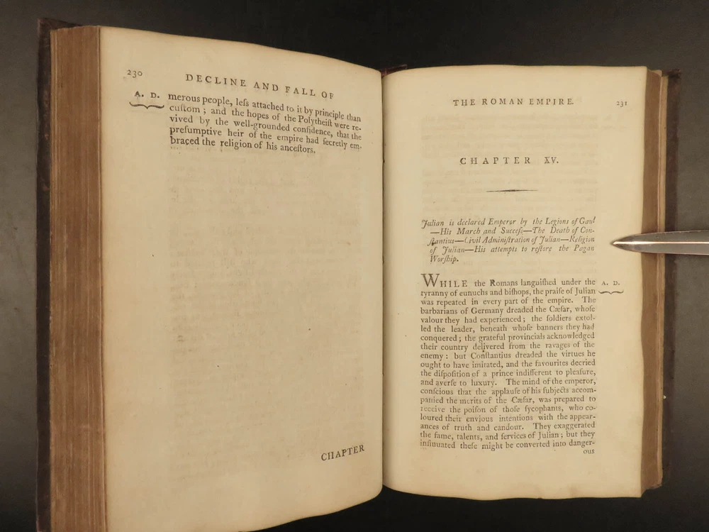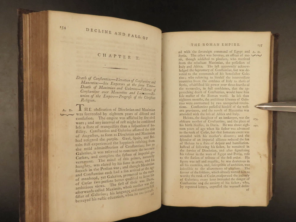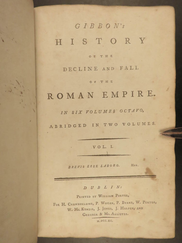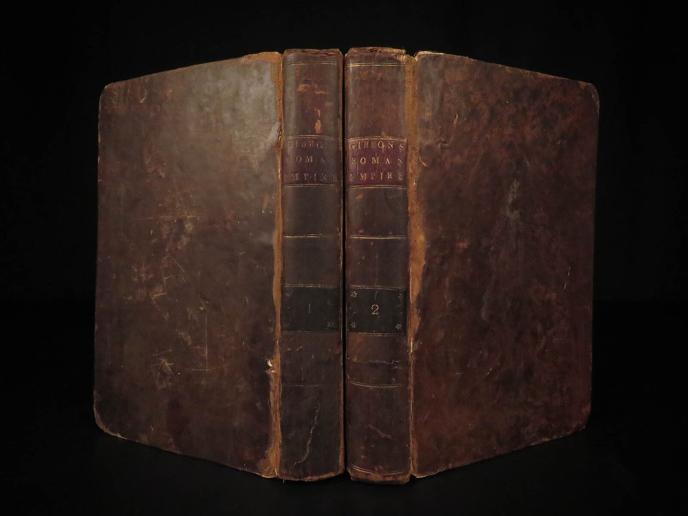 1790 FAMOUS Edward Gibbon Decline & Fall of Roman Empire Caesar ROME 2v SET “Lo, there appeared a truly classic work: a history not majestic like Livy, nor compressed like Tacitus; not stamped with character like Clarendon; perhaps not so deep as Robertson’s ‘Scotland,’ but a thousand degrees above his ‘Charles’.” – Allibone , on Gibbon’s ‘History’ Originally printed in 1776, “ The History of the Decline and Fall of the Roman Empire ” was written in six volumes by Edward Gibbon. It has maintained its status as one of the most important literary achievements of the 18 th -century and saw numerous editions. This book’s popularity was partly due to it becoming the model used by modern historians and historical authors. This led to Gibbon being considered the first modern historian on the Roman Empire. Important contents include: · Gibbon’s religious, or secular, views on the Quran and Mohammed · The advancement of Christianity leading to the demise of Rome · Christian martyrdom and rise of paganism This 1790 two tome edition was published in Dublin – a six volume edition abridged into two volumes. Item number: #19823 Price: $599 GIBBON, Edward Gibbon's history of the decline and fall of the Roman Empire. In six volumes octavo.. abridged in two volumes Dublin : Printed by William Porter, for H. Chamberlaine, etc… 1790. Details : · Collation: Complete with all pages o Vol. 1 – x, 441, [1] o Vol. 2 – xii, 457, [1] · Language: English · Binding: Leather; tight and secure · Size : ~8.25in X 5.5in (20.5cm x 13.5cm) · Rare and desirable Our Guarantee: Very Fast. Very Safe. Free Shipping Worldwide. Customer satisfaction is our priority! Notify us with 7 days of receiving, and we will offer a full refund without reservation! 19823