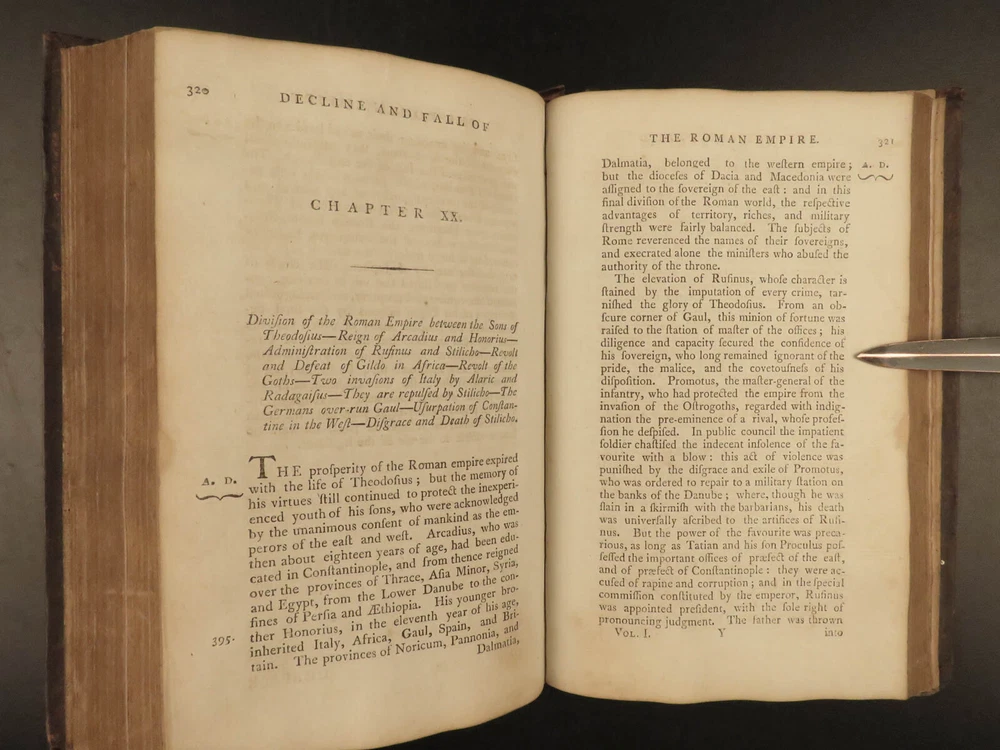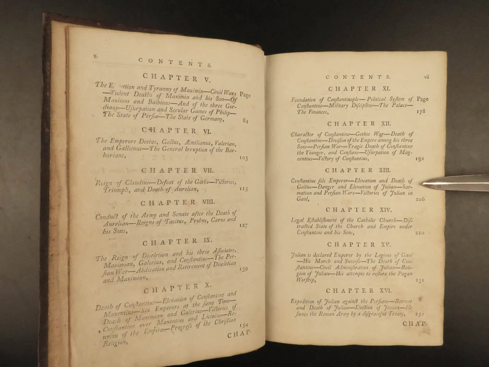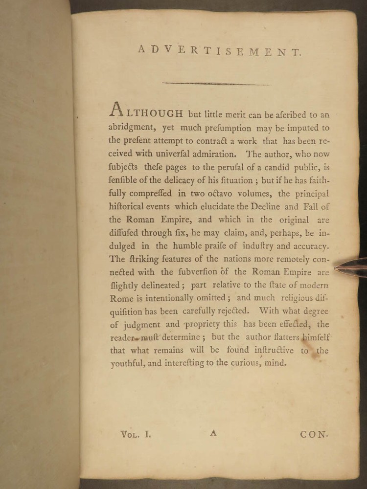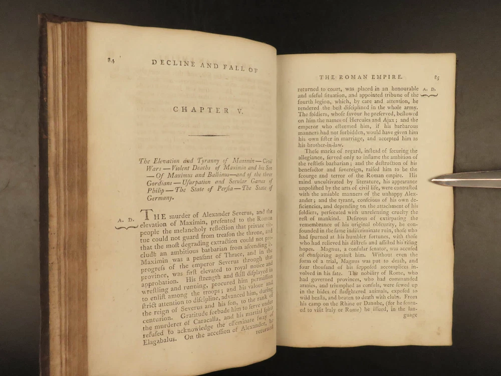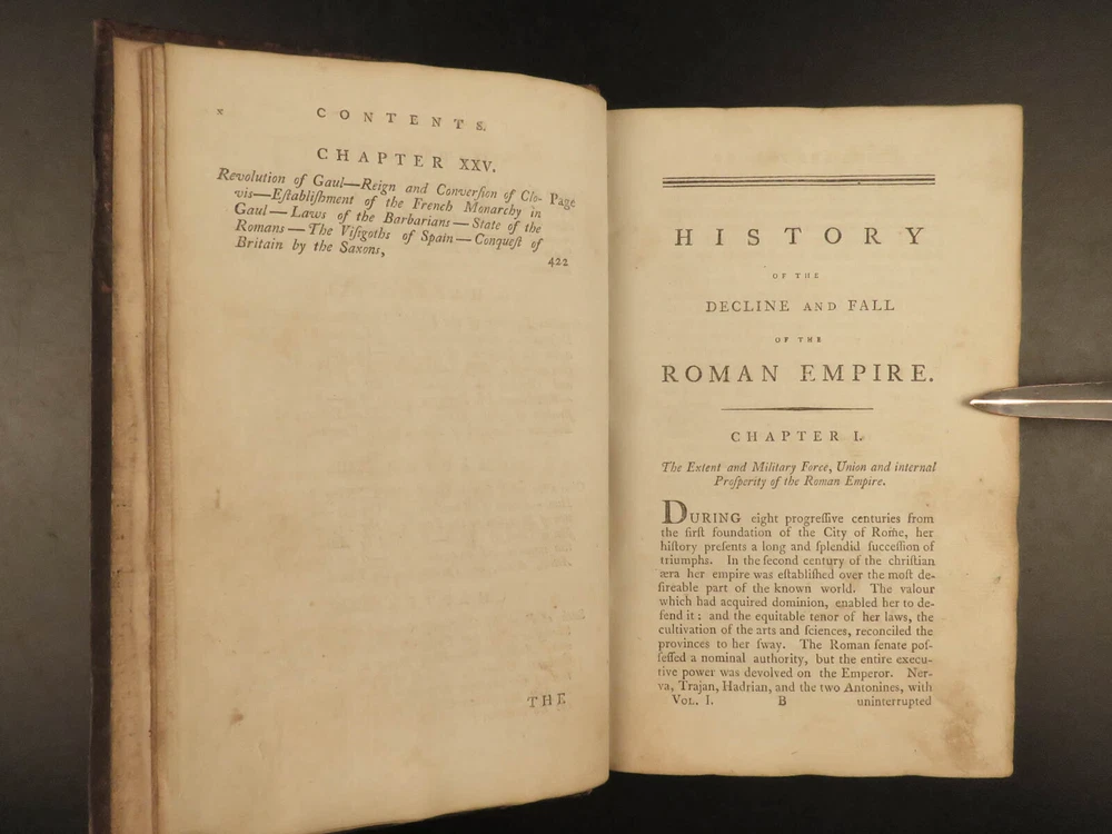 1790 FAMOUS Edward Gibbon Decline & Fall of Roman Empire Caesar ROME 2v SET “Lo, there appeared a truly classic work: a history not majestic like Livy, nor compressed like Tacitus; not stamped with character like Clarendon; perhaps not so deep as Robertson’s ‘Scotland,’ but a thousand degrees above his ‘Charles’.” – Allibone , on Gibbon’s ‘History’ Originally printed in 1776, “ The History of the Decline and Fall of the Roman Empire ” was written in six volumes by Edward Gibbon. It has maintained its status as one of the most important literary achievements of the 18 th -century and saw numerous editions. This book’s popularity was partly due to it becoming the model used by modern historians and historical authors. This led to Gibbon being considered the first modern historian on the Roman Empire. Important contents include: · Gibbon’s religious, or secular, views on the Quran and Mohammed · The advancement of Christianity leading to the demise of Rome · Christian martyrdom and rise of paganism This 1790 two tome edition was published in Dublin – a six volume edition abridged into two volumes. Item number: #19823 Price: $599 GIBBON, Edward Gibbon's history of the decline and fall of the Roman Empire. In six volumes octavo.. abridged in two volumes Dublin : Printed by William Porter, for H. Chamberlaine, etc… 1790. Details : · Collation: Complete with all pages o Vol. 1 – x, 441, [1] o Vol. 2 – xii, 457, [1] · Language: English · Binding: Leather; tight and secure · Size : ~8.25in X 5.5in (20.5cm x 13.5cm) · Rare and desirable Our Guarantee: Very Fast. Very Safe. Free Shipping Worldwide. Customer satisfaction is our priority! Notify us with 7 days of receiving, and we will offer a full refund without reservation! 19823