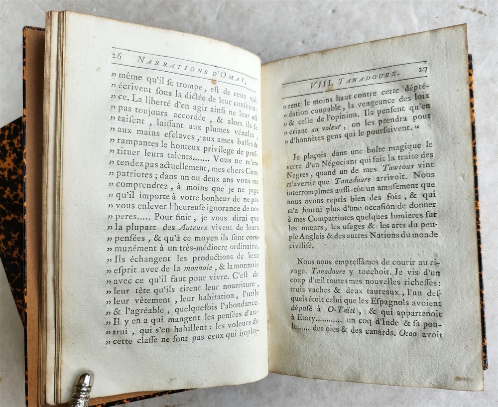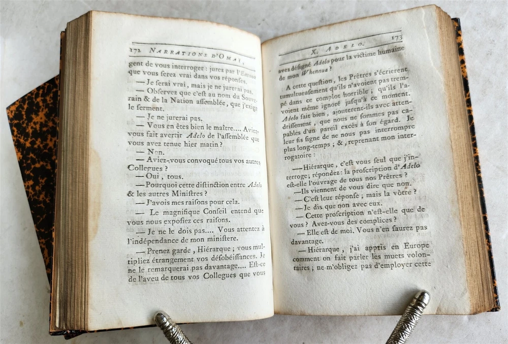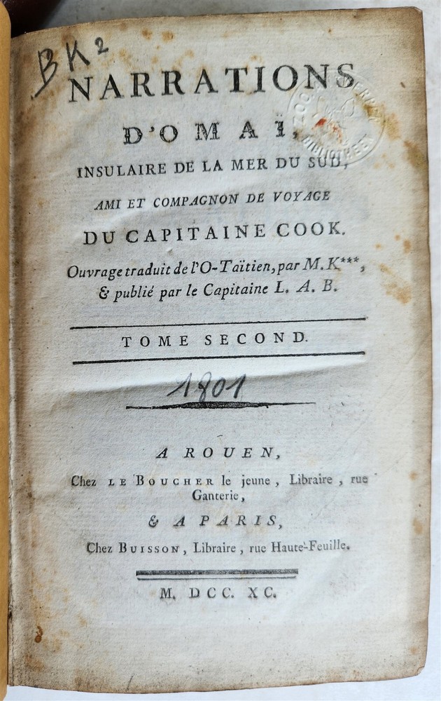 ABBE GUILLAUME-ANDRE-RENÉ BASTON NARRATIONS D'OMAI, INSULAIRE DE LA MER DU SUD, ami et compagnon de voyage du Capitaine Cook. Ouvrage traduit de l'O-Taitien, par M. K. & publie par le Capitaine L. A. B. Rouen/Paris, chez Le Boucher/ Buisson, libraire; 1790 4 volumes Size 5 1/4 by 7 3/4 inches Frontispiece, (4), 446pp./ 492 (2) pp./ 480 (2) pp./ 462 (2) pp. Re-bound in half leather over marbled boards, title in gilt at the spines Good condition , occasional foxing Ex-library Text in French ========================================= Please see my other auctions Thank You Refund Policy: We will issue a FULL REFUND, 100% money back if you are not satisfied with your purchase. Items must be returned to us within 20 days in order to receive a refund or replacement. Buyer is responsible for shipping costs. Powered by SixBit's eCommerce Solution