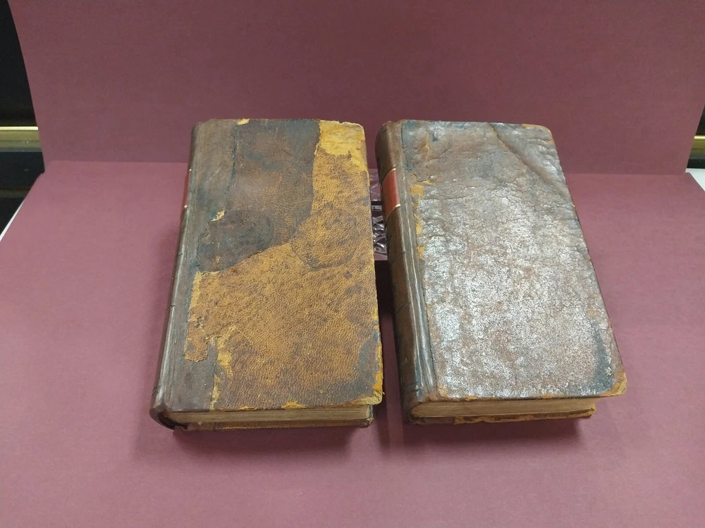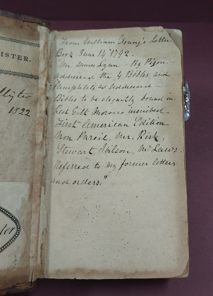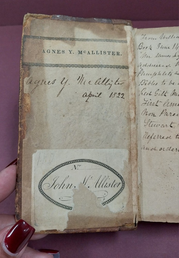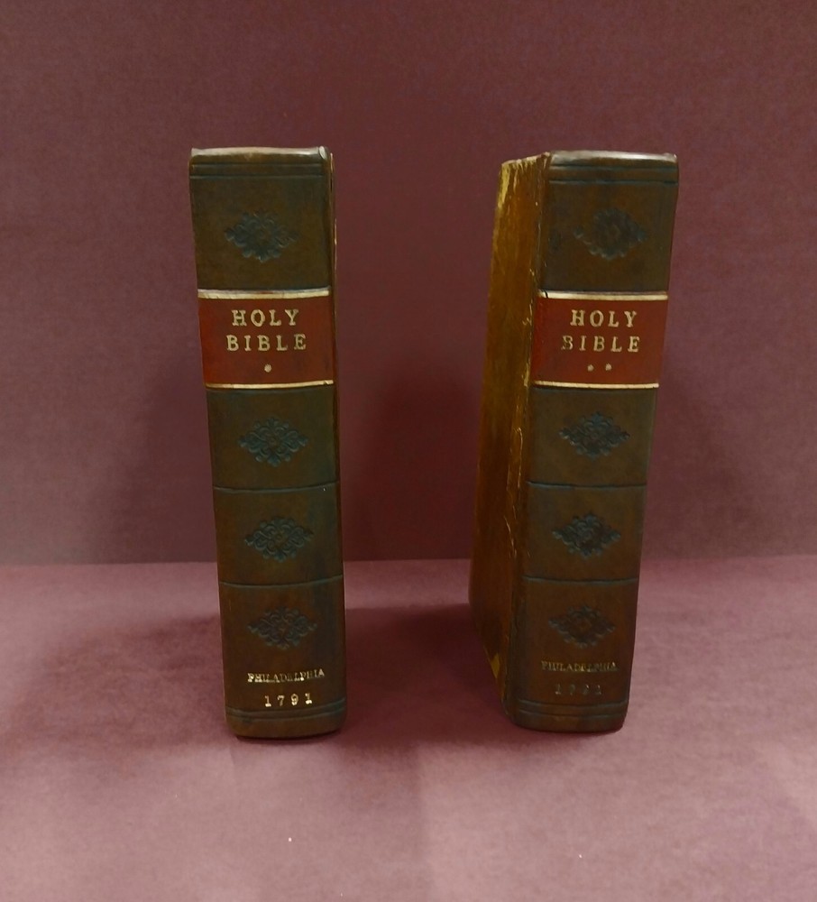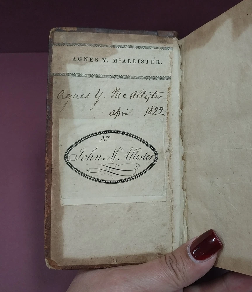 This is a two-volume set of the King James Bible, published in 1791-1972. Volume one contains Genesis through Psalms. Volume two contains Proverbs to Revelation. There are two bookplates in each volume, one belonging to John McAllister and the other to Agnes Y. McAllister. Agnes McAllister has signed under her plate, Agnes Y. McAllister April 1822. Each volume measures approx. 3.5 in x 5.75 in. Tennessee Bible Museum Box 320
