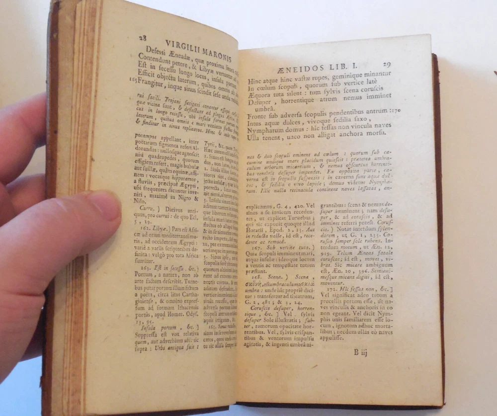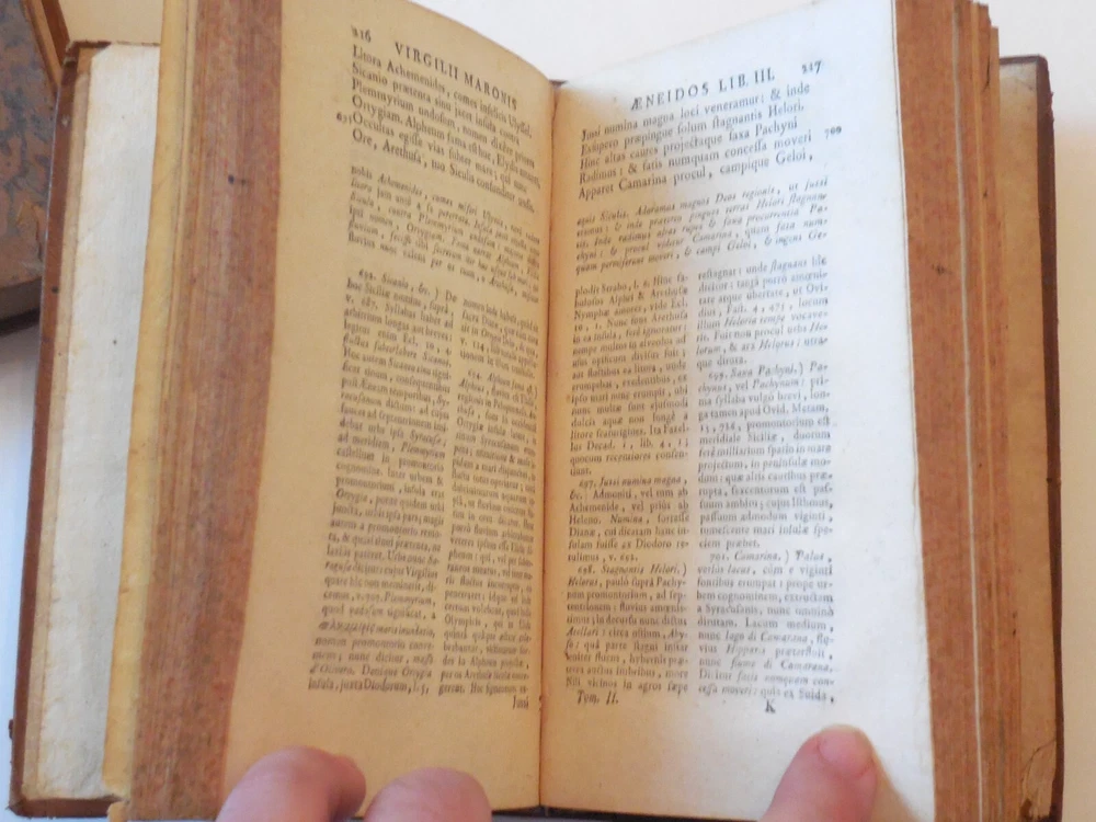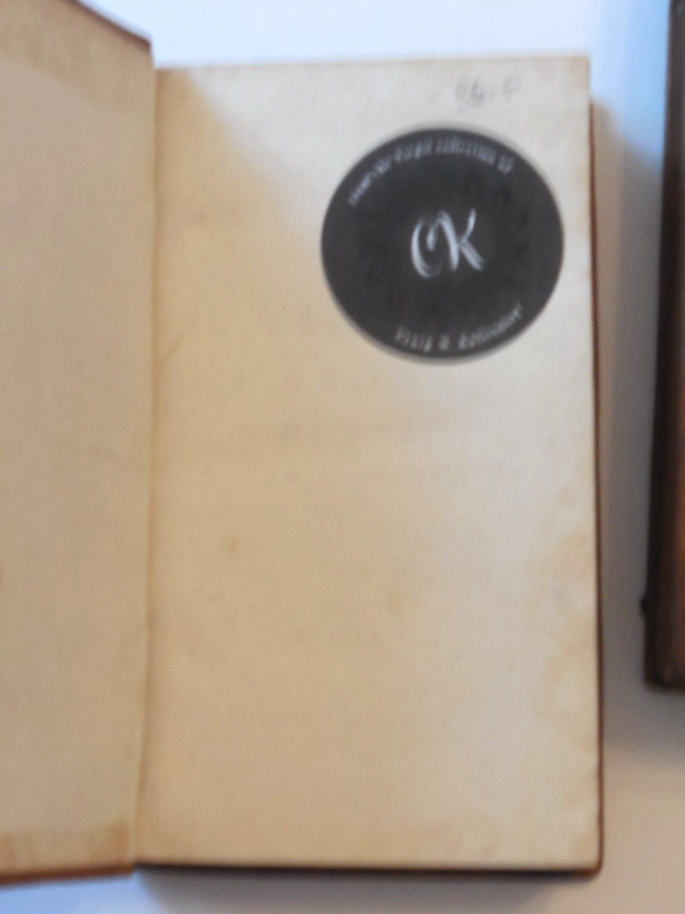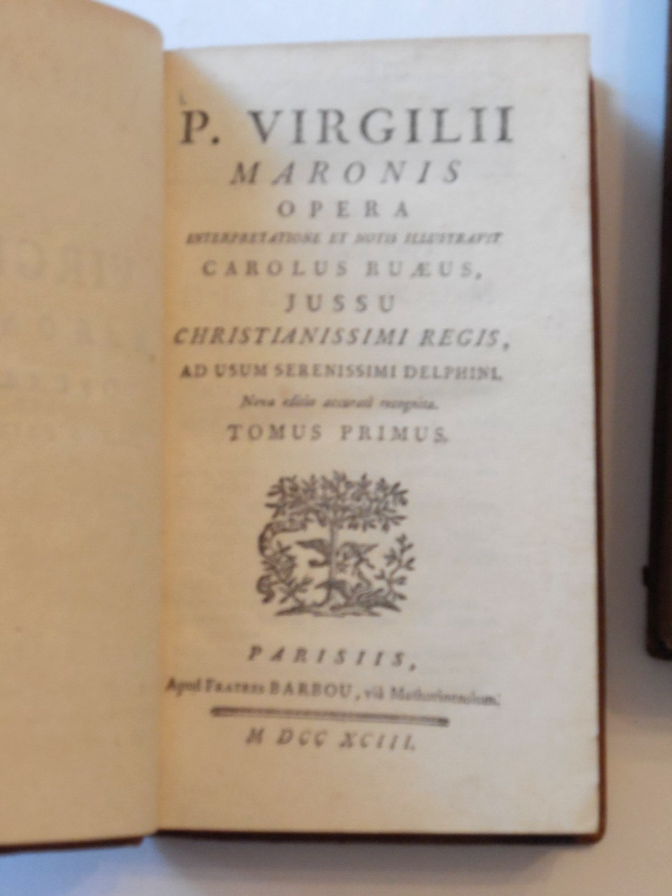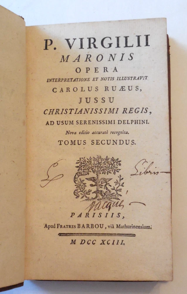 "P. Virgilii Maronis Opera Interpretatione Et Notis Illustravit Carolus Ruaeus, Jussu Christianissimi Regis, Ad Usum Serenissimi Delphini. Nova editio accurate recognita." 2-volume set. Published in 1793 by Barbou. Both are leatherbound. These books belonged to Craig Kallendorf, the noted Virgil scholar and professor at Texas A&M University, and both have his sticker in them. One is shown in the 4th picture. The set is in nice condition for its age. Some cover wear and the decoration and wording on the spines are somewhat worn. There is some corner wear to both volumes and a little along the spines. Volume 1 has some damage to the lower right corner of the front cover, where some leather has been scraped. This can be seen in the 2nd picture. The pages are in good condition, but some foxing. There are a few markings. It appears that both volumes may have been around moisture at some point. There are no water stains or any other actual signs of moisture damage that I can find, but the pages are slightly stiff. Slight musty/old book odor. Will be shipped with Signature Confirmation required. We can ship only to the name and address provided by eBay. Thank you!