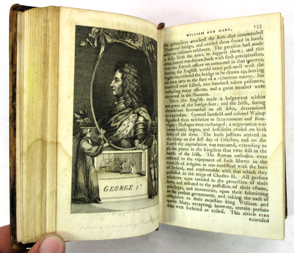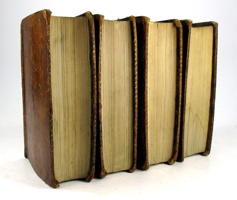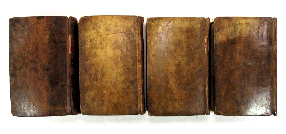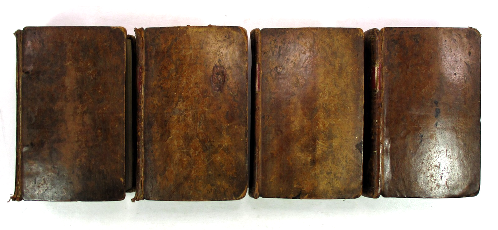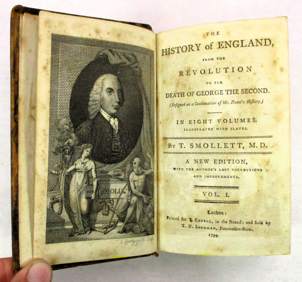 Very Good- condition leather hardcover 4 volume set of The History of England, from the Revolution to the Death of George the Second in Eight Volumes - A New Edition by T. Smollett. Eight volumes of text are bound two per book. Published 1794 by T. Cadell and printed by T. N. Longman in London, UK. Bound in brown leather with gold foild lettering and decoration to spines. Illustrated in black and white. Books measure ~5.75" x 3.75". Bindings are sound and pages are generally unmarked, with the exception of ripped last free endpaper and moisture staining to whole textblock of book 1 (vol. 1/2) and minor foxing to all volumes. Boards are clean and square with minor chipping to extremities, especially spine of book 1 (vol. 1/2), minor scuffing and soiling to covers, and minor shelf wear. Please see photos for condition detail. L-1580