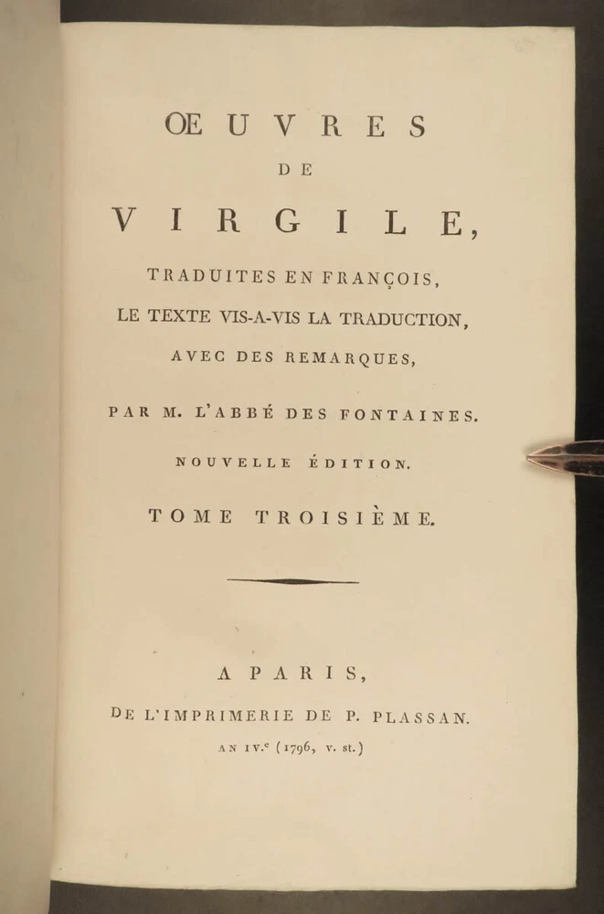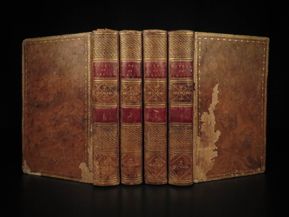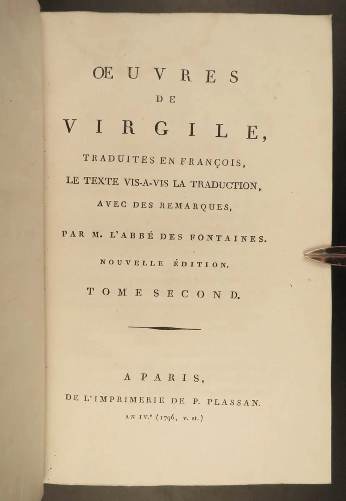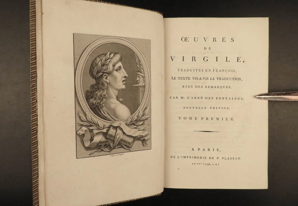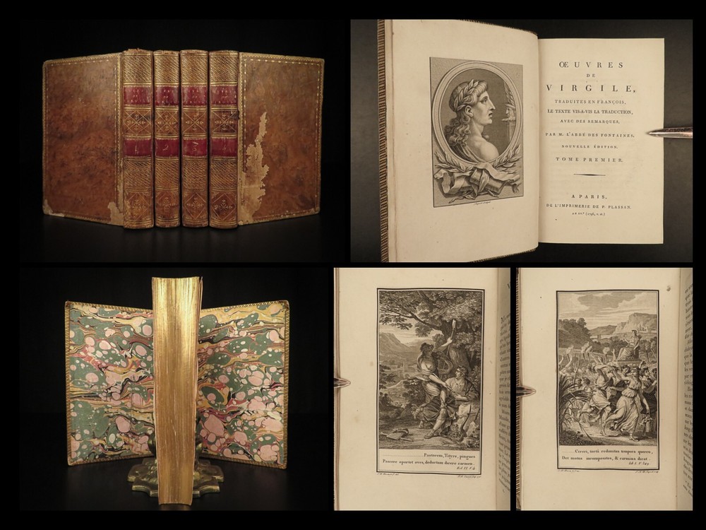 1796 VIRGIL Aeneid Georgics Eclogues Bucolics Desfontaines PROSE French 4v SET “Audaces fortuna iuvat- (Fortune favors the bold).” ― Virgil Virgil is regularly considered one of the greatest Roman poets. His epic poems, ‘ Eclogues ,’ ‘ Georgics ,’ and ‘ Aeneid’ are some of the most important works of western literature and describe mythology, medicine, astronomy, war and military, rhetoric, agriculture, and more! Virgil’s works have been popular throughout the centuries, both to readers and writers respectively. French translator Pierre Desfontaines created one the most unique and impressive versions of Virgil – a parallel French and Latin edition. While similar works exist, Desfontaines translations were not simply word-for-word but rather prose renditions of the Virgil Latin. These translations proved to be highly sought after and are still noteworthy works today. This 1796, four-volume edition of Desfontaines’s ‘ Virgil’ was published in Paris by Plassan. Item number: #21334 Price: $499 VIRGIL Oeuvres de Virgile traduites en françois, le texte vis-à-vis la traduction, avec des remarques Paris: De L'imprimerie de P. Plassan, 1796. Details : · Collation: Complete with all pages; 4 volumes o Vol. 1 – lxi, [3], 478 § 6 engravings o Vol. 2 – 437, [1] § 4 engravings o Vol. 3 – 447, [1] § 4 engravings o Vol. 4 – 510 § 4 engravings · Language: French · Binding: Leather; tight and secure · Size : ~9in X 6in (23cm x 15cm) Our Guarantee: Very Fast. Very Safe. Free Shipping Worldwide. Customer satisfaction is our priority! Notify us with 7 days of receiving, and we will offer a full refund without reservation! 21334